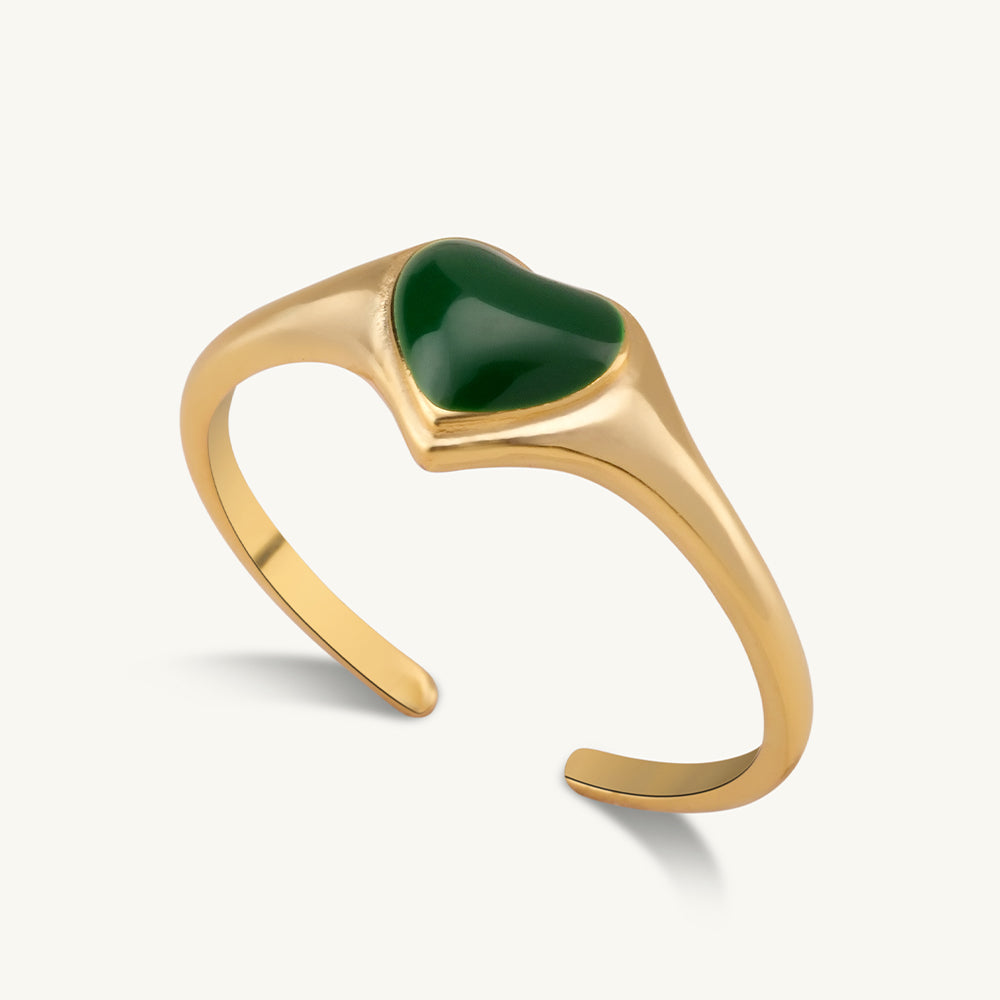 Add a pop of color to your collection with the Green Heart Ring, crafted from stainless steel and finished in radiant 18k gold vermeil. Featuring a charming enamel heart detail, this waterproof and anti-tarnish ring combines playful design with everyday elegance. Its adjustable fit makes it versatile and comfortable, while the vibrant green accent adds a refreshing twist - perfect for both casual wear and chic evenings out.