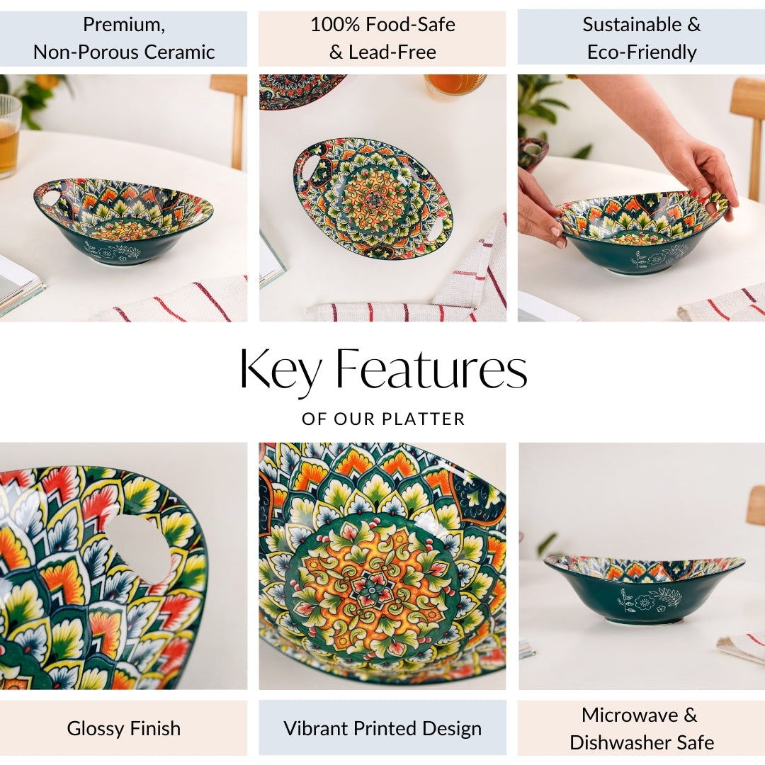 Design: This ceramic platter features a rich green exterior with delicate white botanical motifs of floral sprigs etched symmetrically on each side. The platter is crafted in an ingot-inspired shape, with two oval cutouts at the rim on each side serving as integrated handles. The interior showcases a vibrant, kaleidoscopic mandala-inspired pattern with a symmetrical floral burst in sunset orange, emerald green, marigold yellow, crimson red, and sapphire blue, radiating outwards from the centre, all finished with a high-gloss sheen.