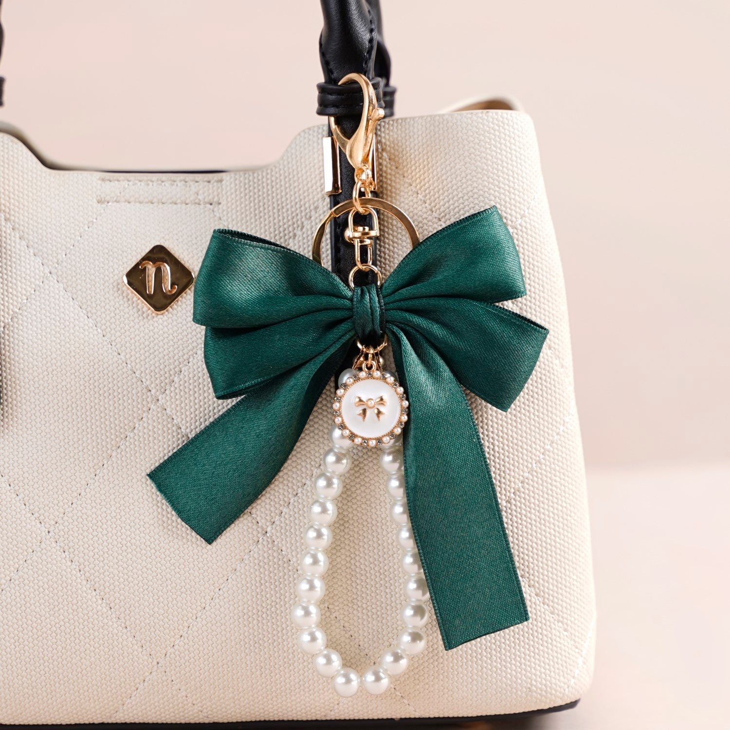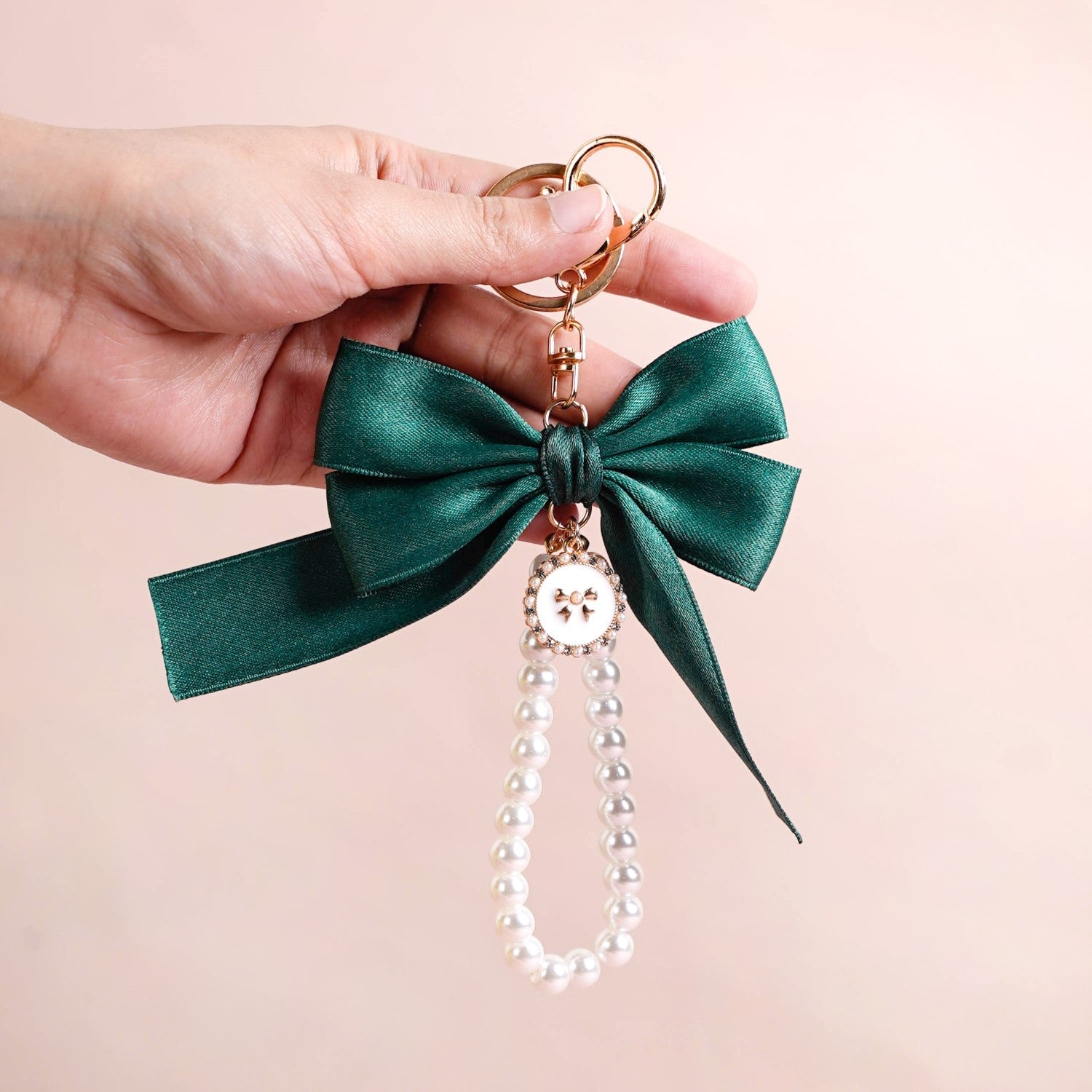 Meet your new favourite keyring! This cute keychain features a dark green satin bow that’s all kinds of adorable, paired with a dreamy white pearl chain for that extra sparkle. The hanging bow charm is basically the cherry on top!