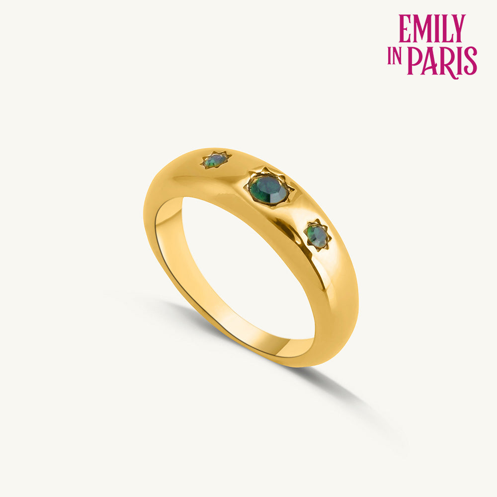 This beautiful ring has green stones.
