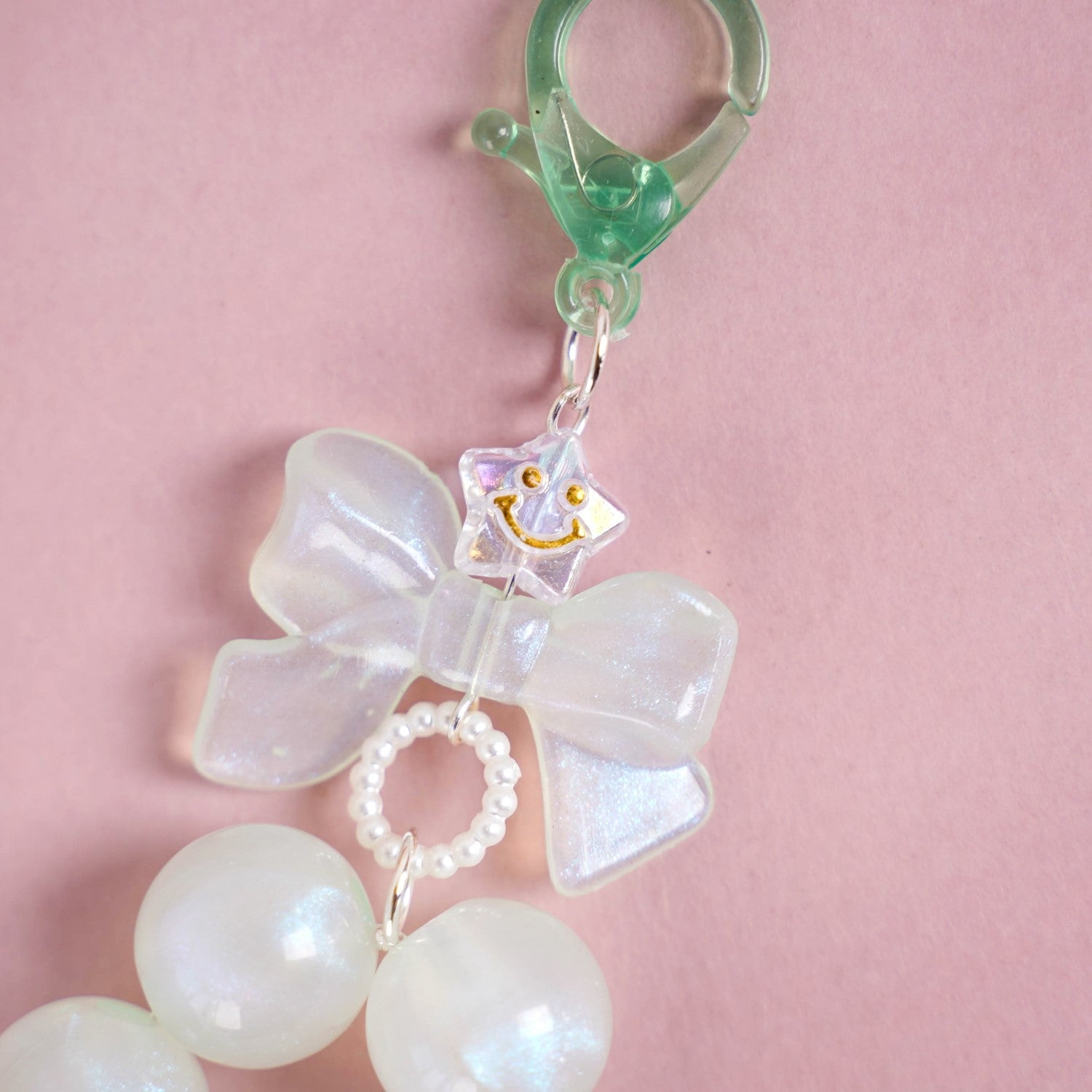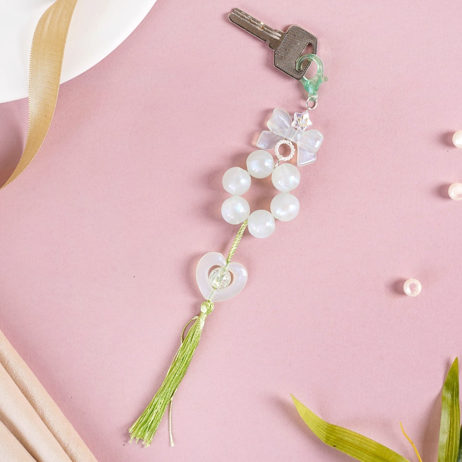 Turn your keys into a style statement with this whimsical cute keychain! A chic green lobster clasp hook secures a dazzling design that’s hard to resist. A shimmery iridescent beaded hoop in mint hue with a white pearl ring holds a dainty bow charm, while a long green satin tassel adds playful flair.