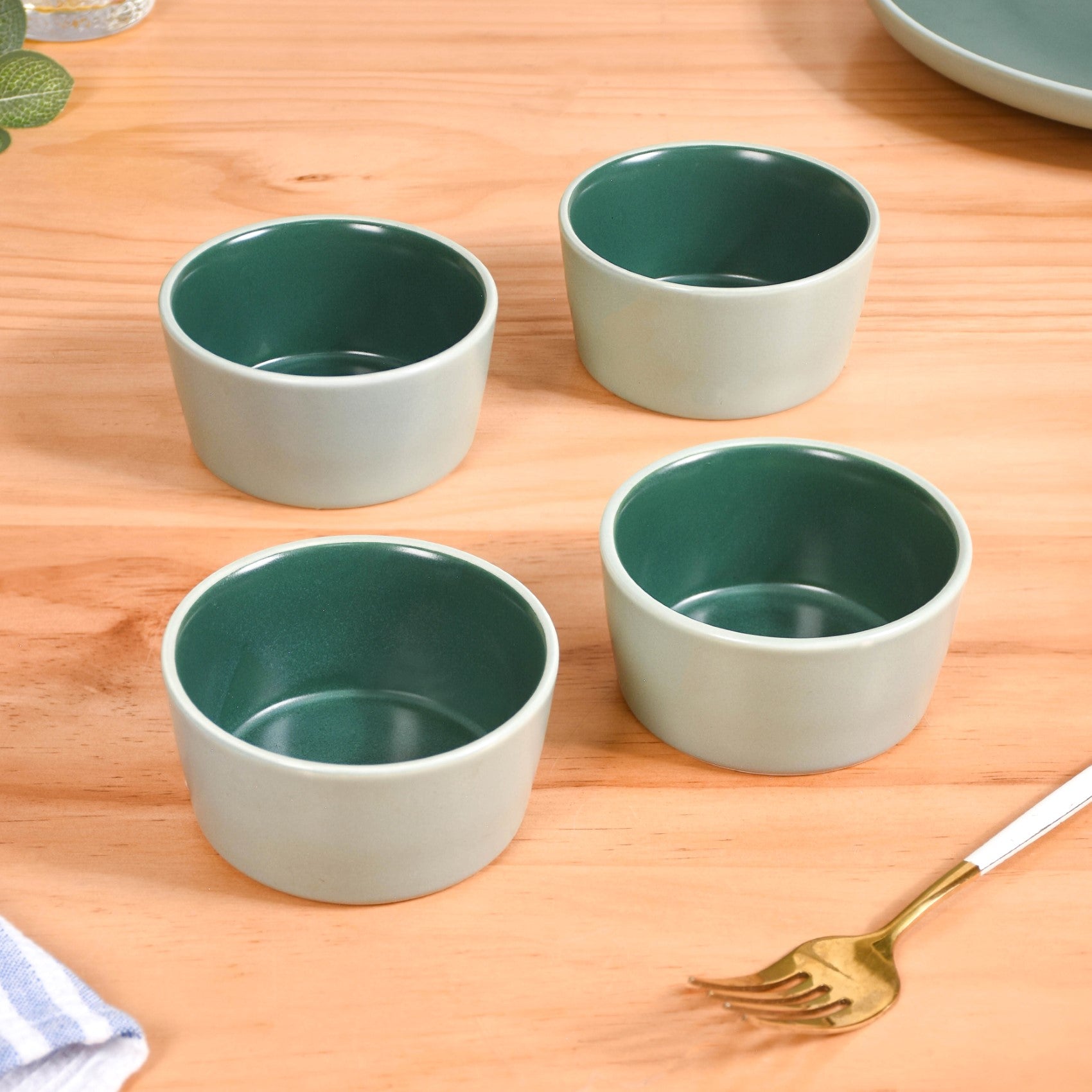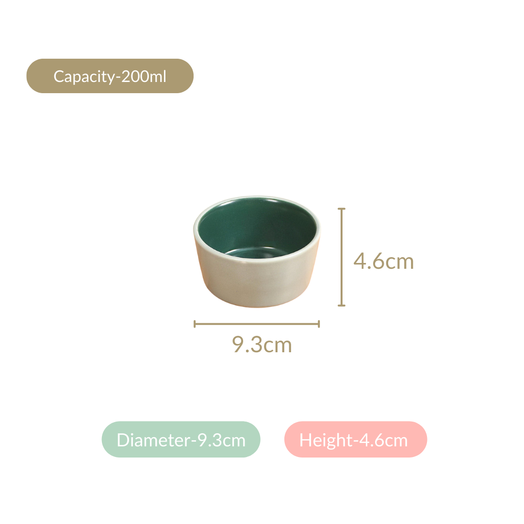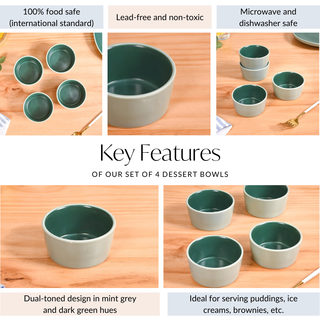 Indulge in sweet delights with the set of 4 exquisite dessert bowls from our Zoella Collection. Made from 100% food-safe ceramic, meeting international standards, they're lead-free and non-toxic. The dessert bowls are microwave- and oven-safe for convenience, plus dishwasher-safe for easy cleanup. Featuring a charming dual-toned design in mint grey and dark green, they add a touch of elegance to any table setting. The bowls are perfect for serving up your favourite treats like puddings, ice creams, brownies, and more. Bring style and functionality to your desserts with these Zoella small bowls!