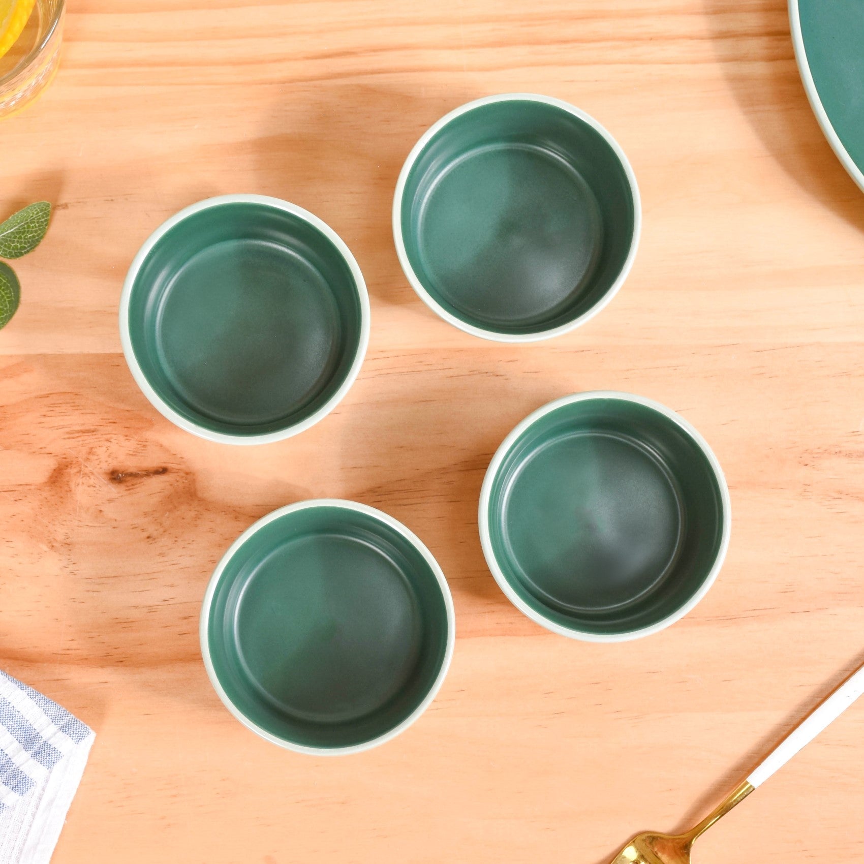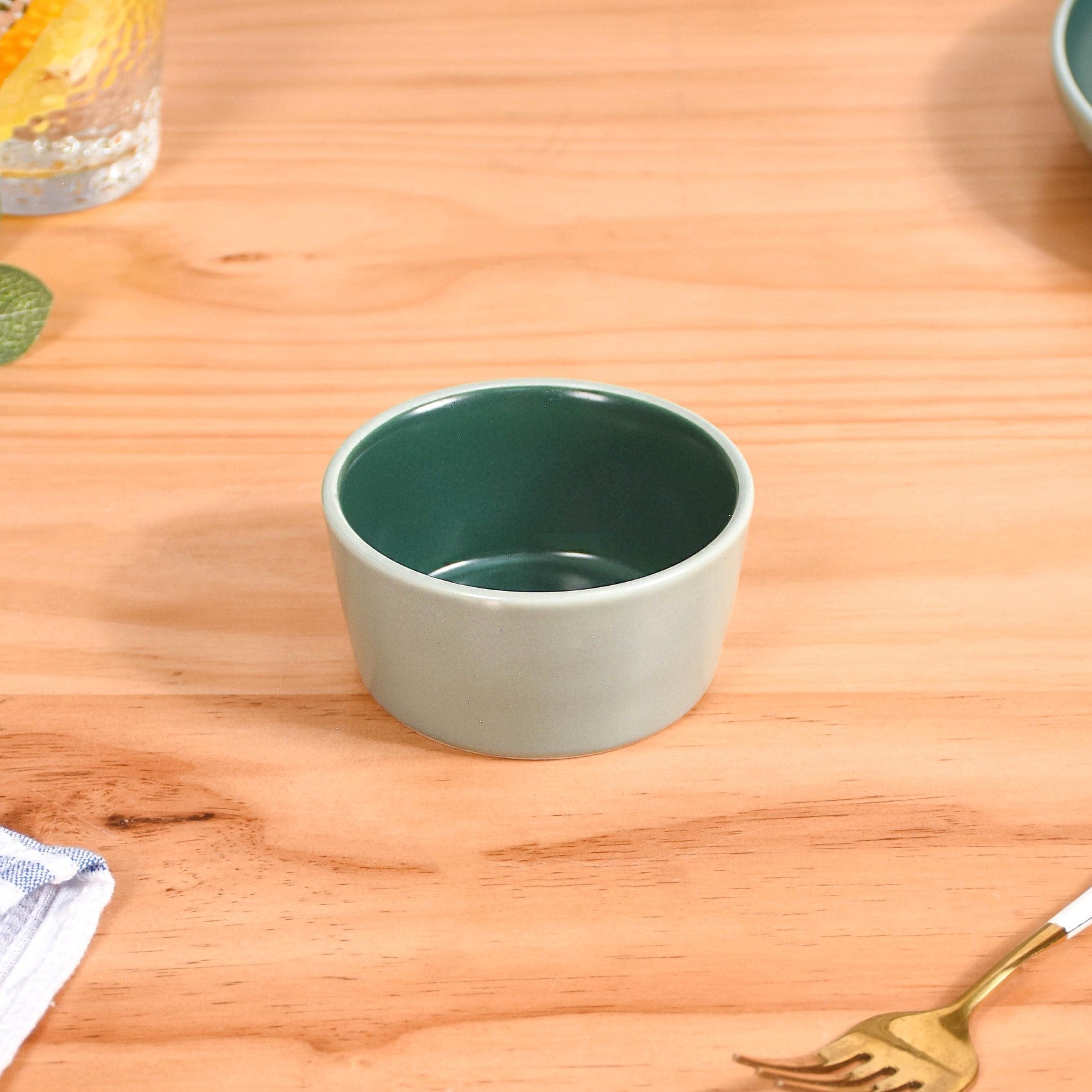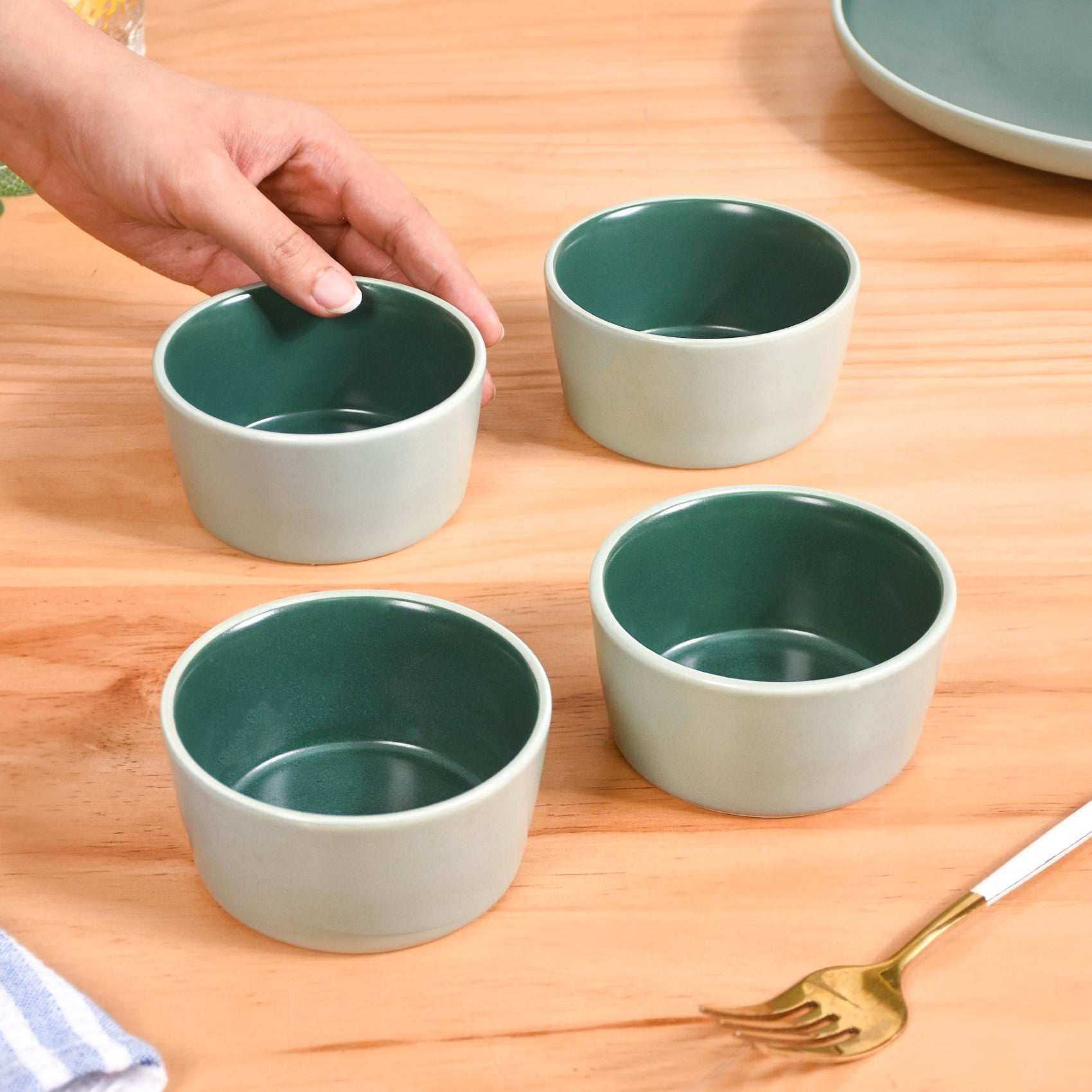 Indulge in sweet delights with the set of 4 exquisite dessert bowls from our Zoella Collection. Made from 100% food-safe ceramic, meeting international standards, they're lead-free and non-toxic. The dessert bowls are microwave- and oven-safe for convenience, plus dishwasher-safe for easy cleanup. Featuring a charming dual-toned design in mint grey and dark green, they add a touch of elegance to any table setting. The bowls are perfect for serving up your favourite treats like puddings, ice creams, brownies, and more. Bring style and functionality to your desserts with these Zoella small bowls!
