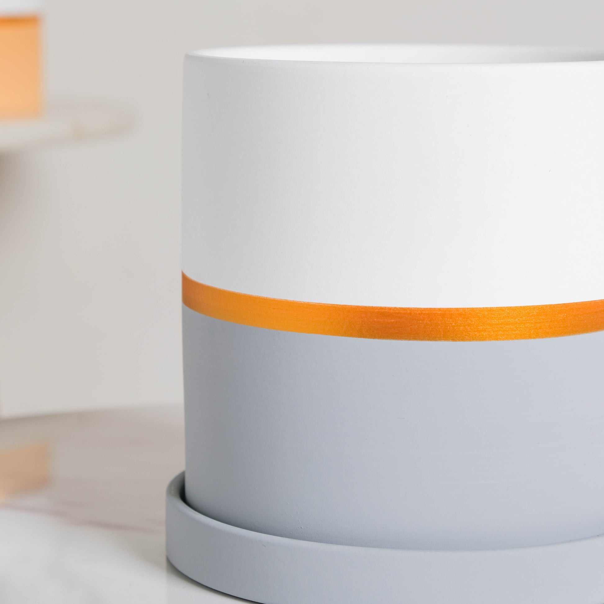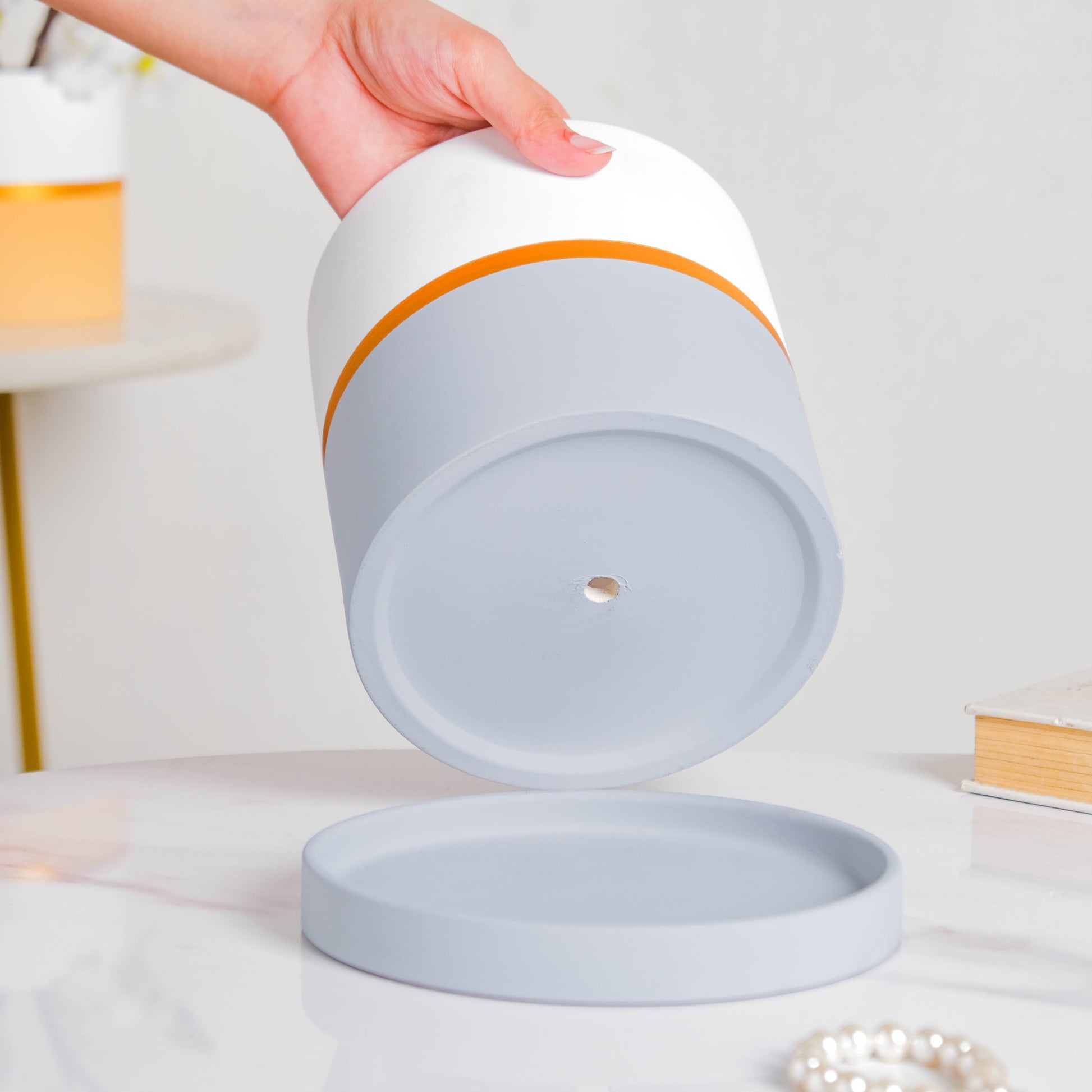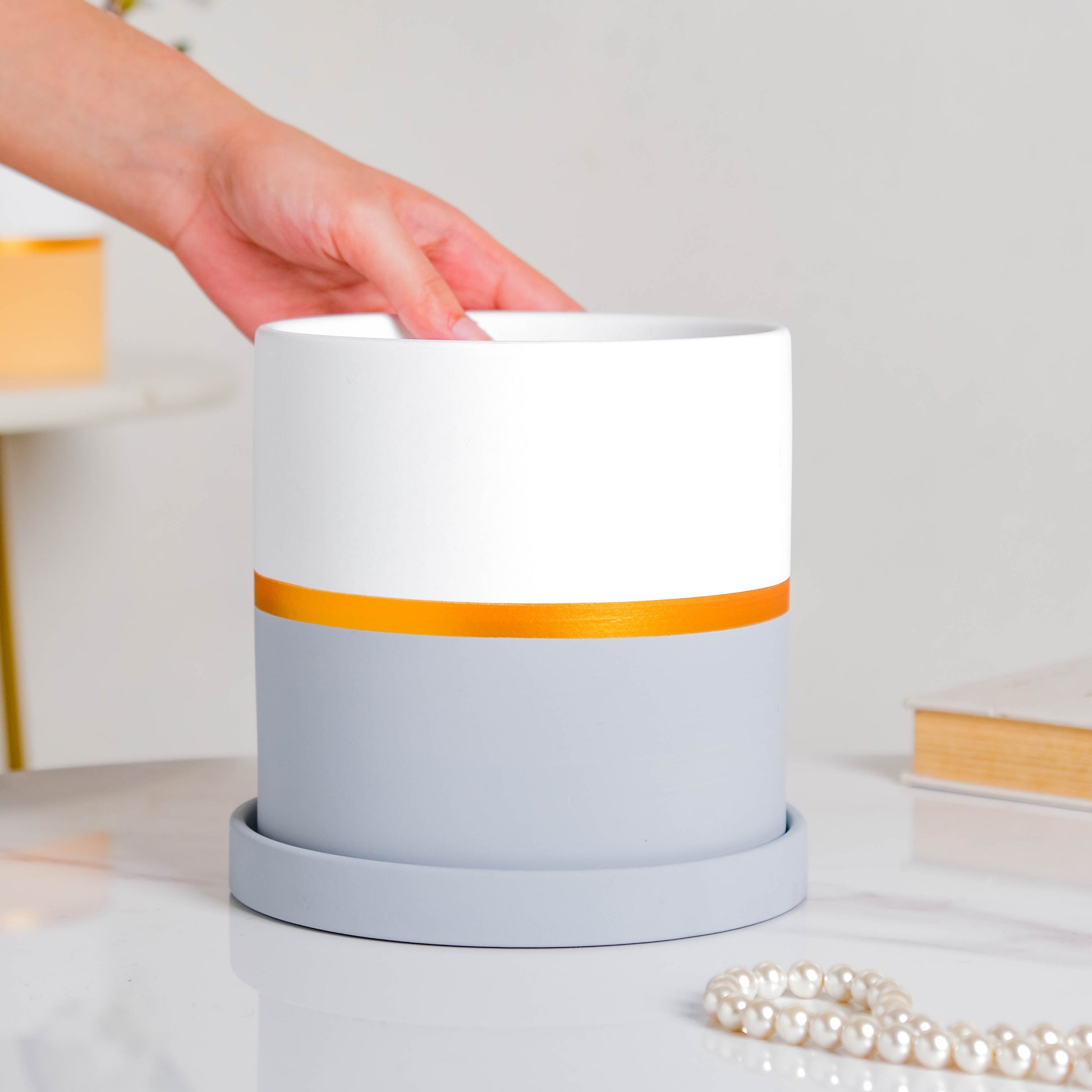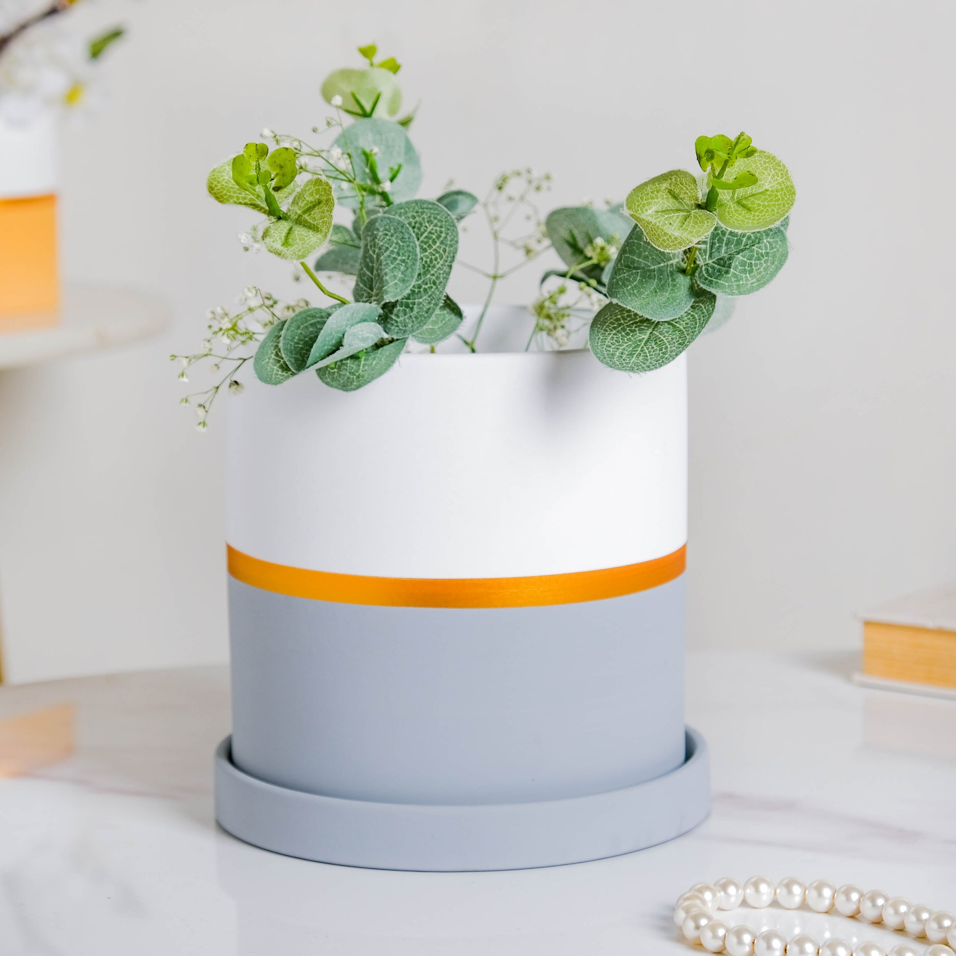 For a luxe appeal to a contemporary house, invest in the bicolor grey and white pot. The bi-color planter pot is divided by a sleek golden strip which makes it an elegant and attractive home decor accessory suitable for any contemporary setting. The minimalist design is not only striking but blends in easily with any modern home. The grey pot comes with a plate to store the excess water that gets drained from the hole at the bottom of the pot. One can use the grey ceramic pot plate individually as a trinket tray to keep tiny essentials such as keys and coins.