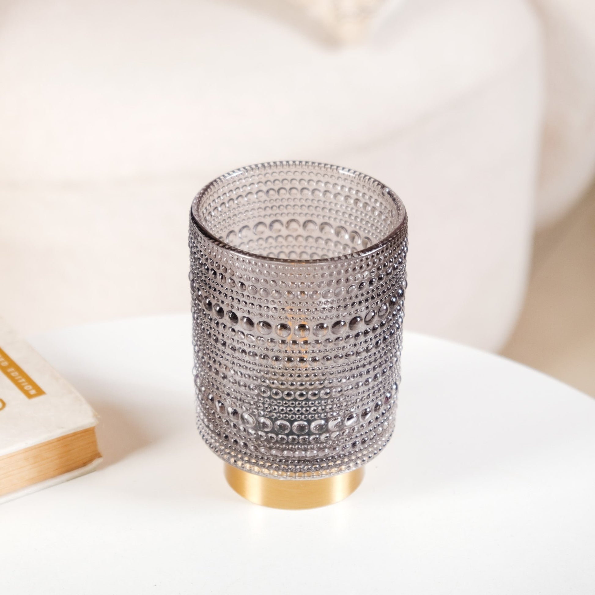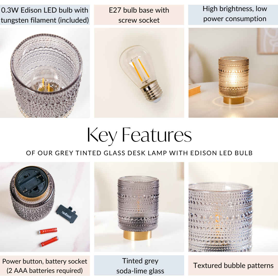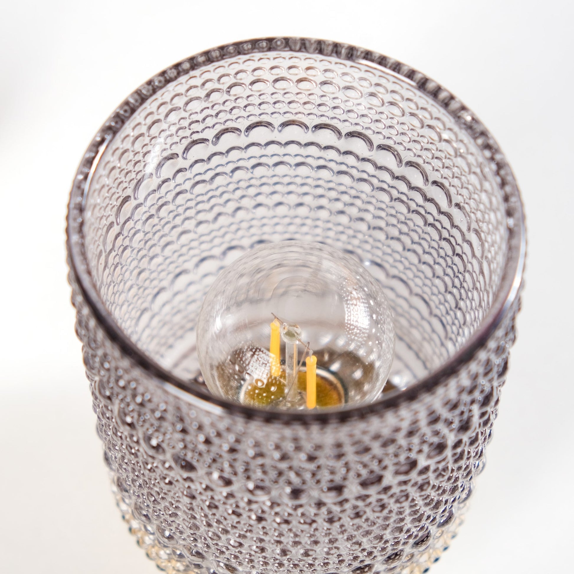 Design: Featuring a 0.3-watt Edison LED bulb with a tungsten filament, this battery lamp delivers a vintage aesthetic paired with modern technology. The tinted grey soda-lime glass with intricate bubble patterns creates a soft and inviting atmosphere, while the metal base adds durability and houses the battery socket and power button for easy use. Designed to operate for up to 24 hours on 2 AAA batteries (not included), the glass lamp is both portable and convenient for various spaces.
