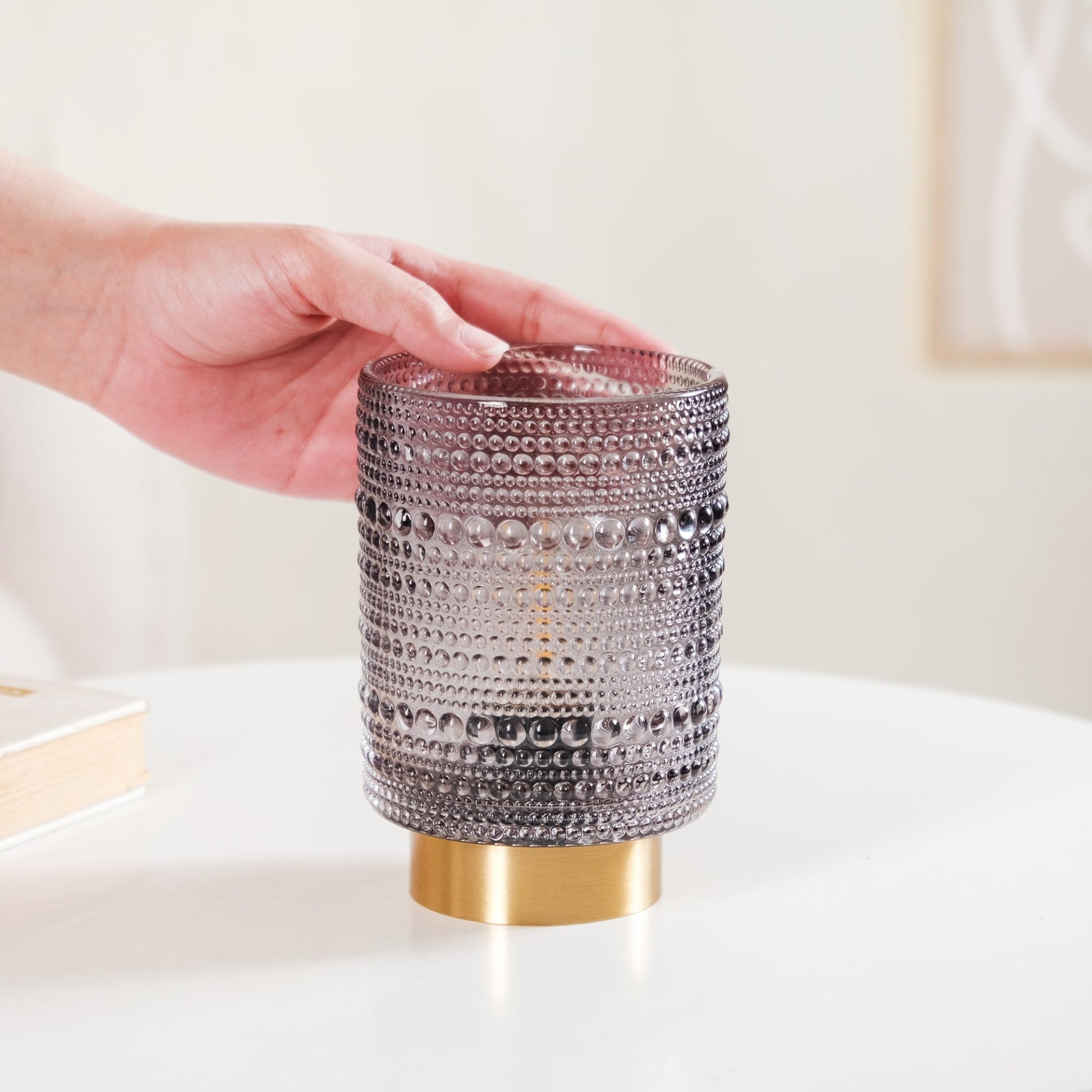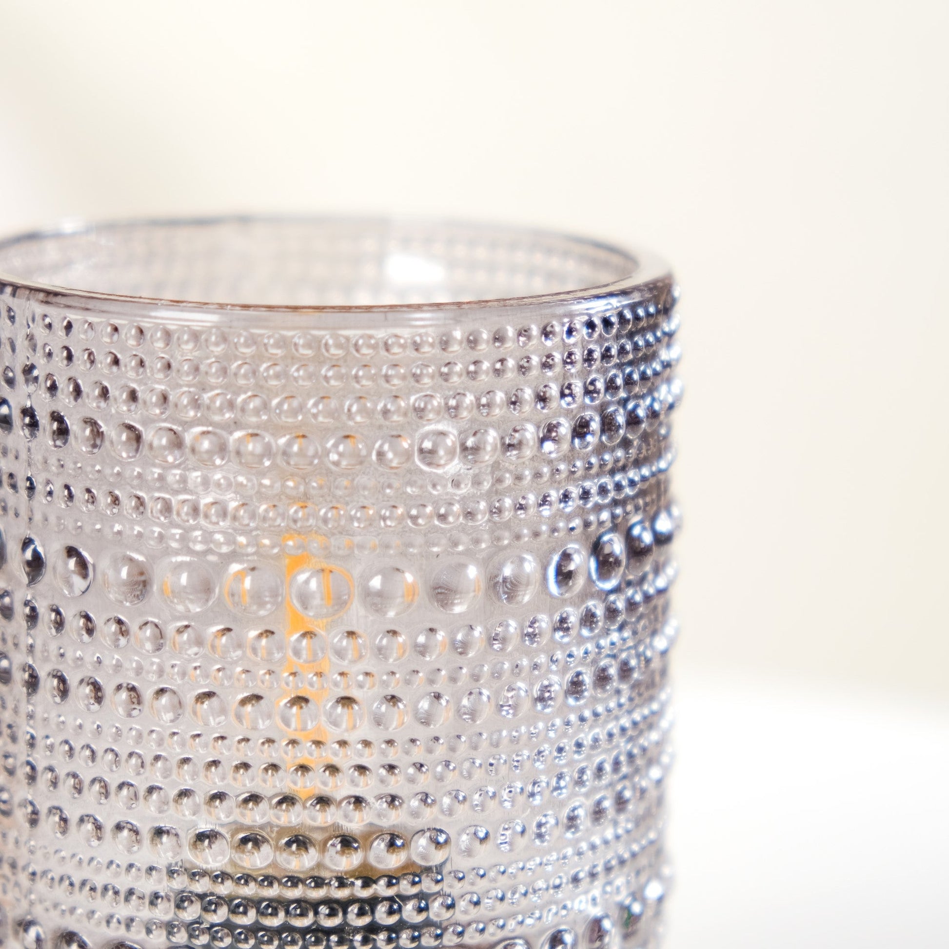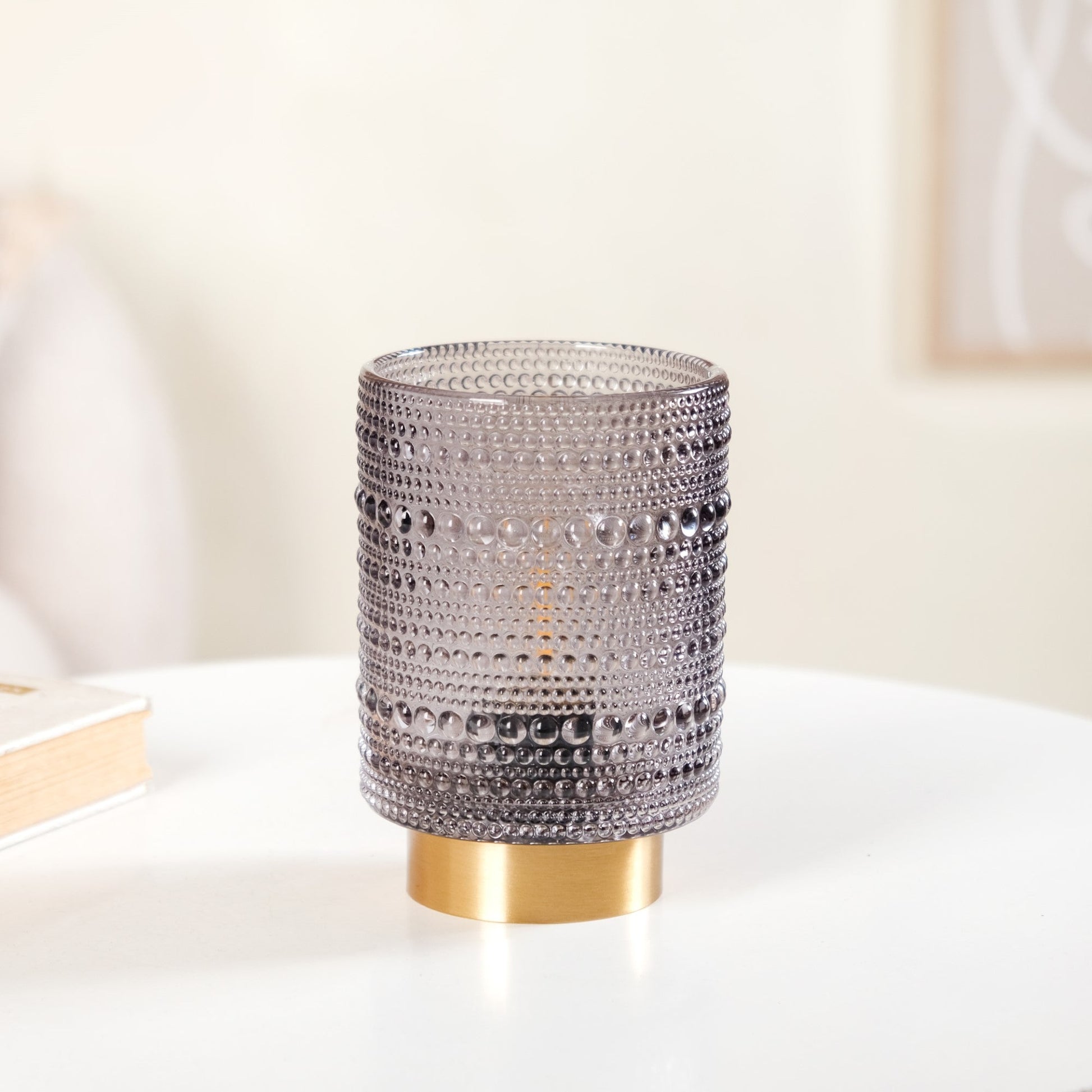 Design: Featuring a 0.3-watt Edison LED bulb with a tungsten filament, this battery lamp delivers a vintage aesthetic paired with modern technology. The tinted grey soda-lime glass with intricate bubble patterns creates a soft and inviting atmosphere, while the metal base adds durability and houses the battery socket and power button for easy use. Designed to operate for up to 24 hours on 2 AAA batteries (not included), the glass lamp is both portable and convenient for various spaces.