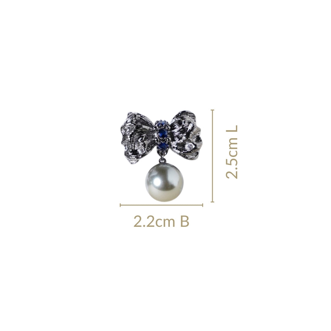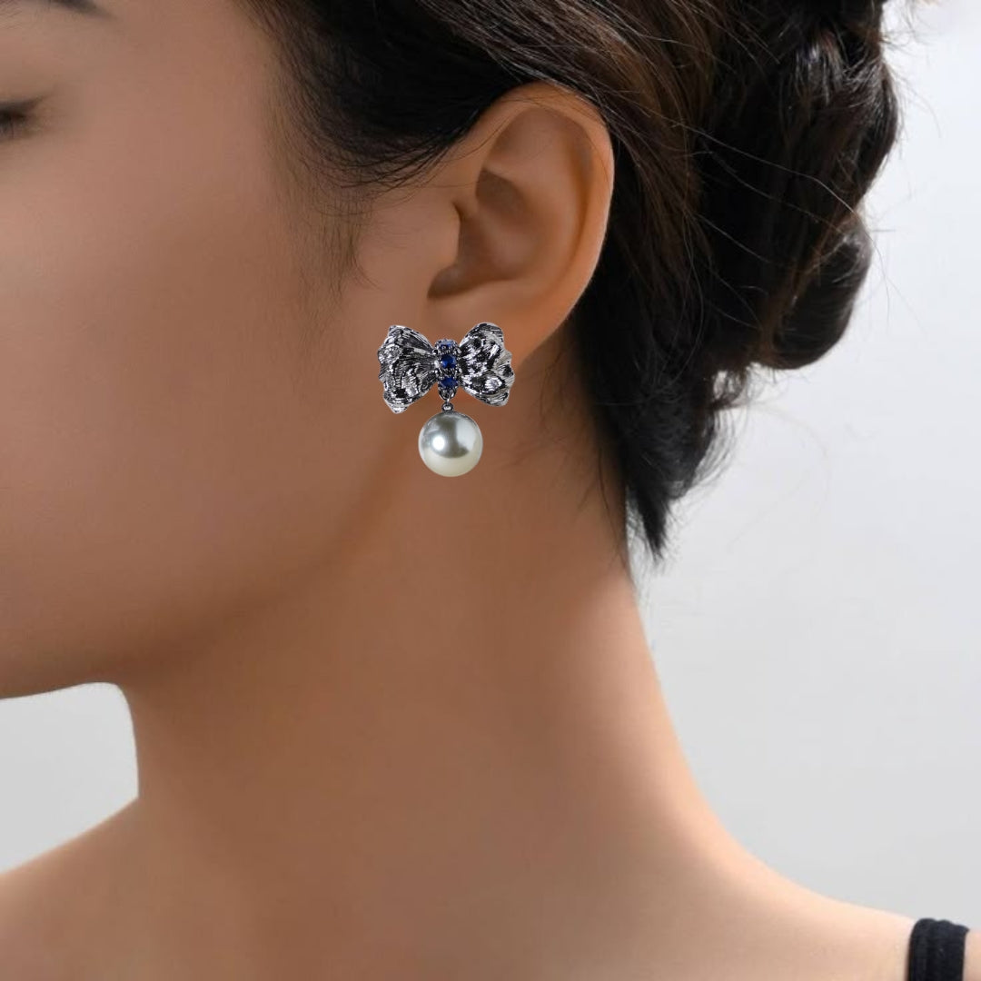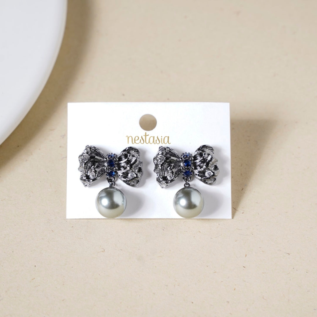 A chic blend of elegance and charm, this pair of dark grey-toned metal drop earrings captures the grace of a perfectly tied bow. Adorned with tiny dark blue stones at the centre, the bow exudes a subtle sparkle, while a lustrous dark grey pearl dangles below, adding a touch of sophistication. Inspired by the timeless beauty of ribbon bows, these earrings symbolise grace and femininity with a modern edge. Lightweight yet striking, they make a refined statement for evening soirées or everyday elegance. Secure push-back closures ensure comfort and effortless wear.