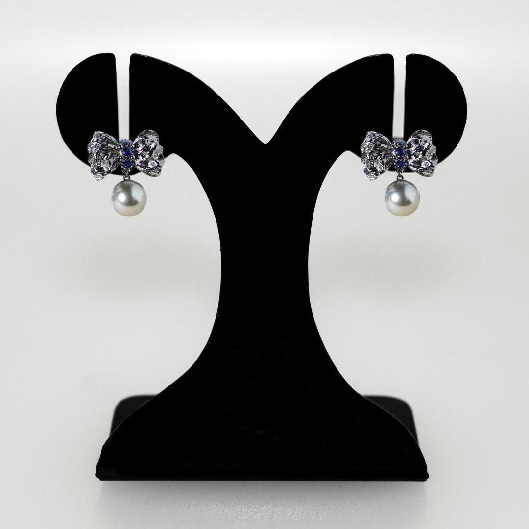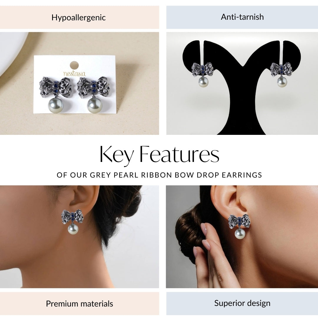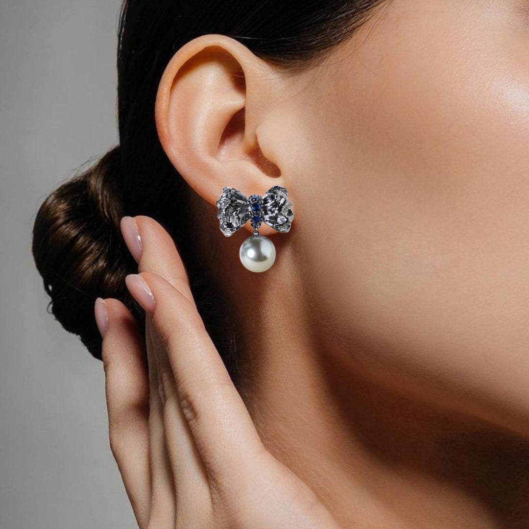 A chic blend of elegance and charm, this pair of dark grey-toned metal drop earrings captures the grace of a perfectly tied bow. Adorned with tiny dark blue stones at the centre, the bow exudes a subtle sparkle, while a lustrous dark grey pearl dangles below, adding a touch of sophistication. Inspired by the timeless beauty of ribbon bows, these earrings symbolise grace and femininity with a modern edge. Lightweight yet striking, they make a refined statement for evening soirées or everyday elegance. Secure push-back closures ensure comfort and effortless wear.
