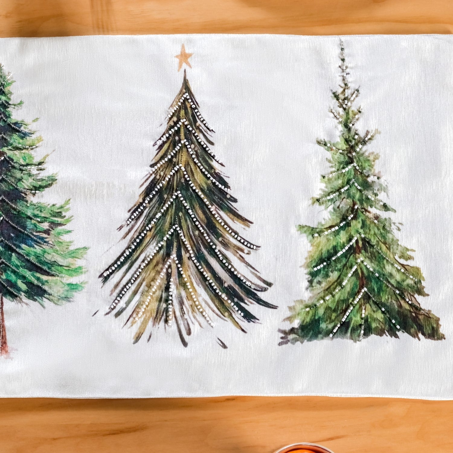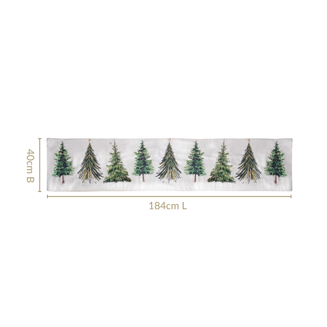 Design: The table runner showcases a design of a grove of lush green pine trees, hand-embroidered with delicate bugles and round beads to add a touch of elegance. The colourful prints on the white polyester fabric enhance its festive appeal, making it an ideal decoration for holiday dining.