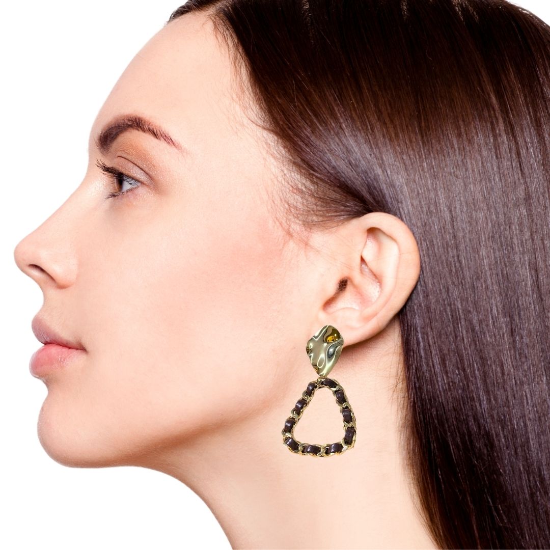A perfect balance of modern edge and refined elegance, these dangler earrings are designed to stand out. The abstract metallic golden upper dangler creates a striking contrast against the earthy tones of the lower loop, intricately knotted with dark brown PU leather and gold metal accents.