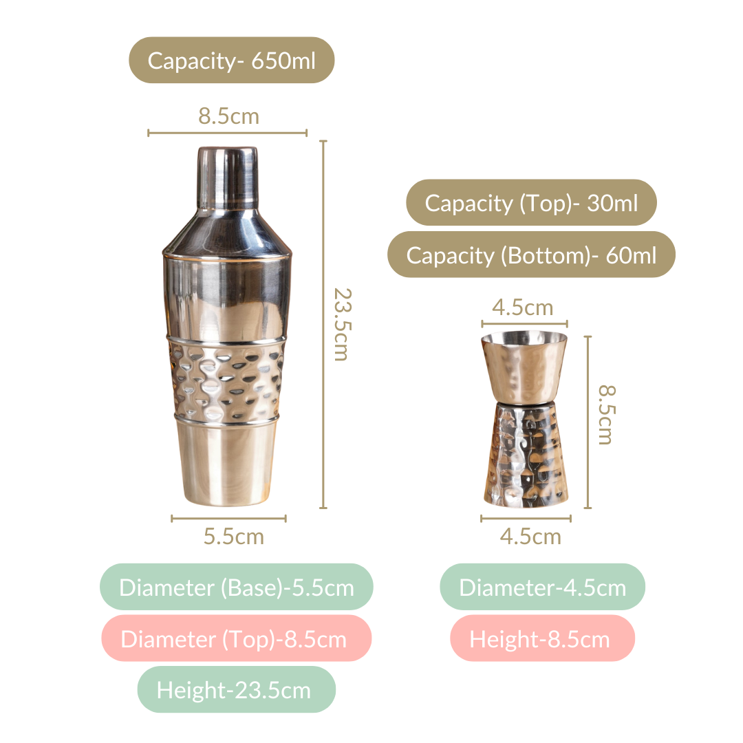 Utility: The shaker features a secure, snug-fitted lid that prevents spills, even with vigorous shaking. Its built-in strainer allows for smooth, strain-free pouring, keeping ice and ingredients in the shaker while serving. The top cap serves as a versatile component, doubling as an additional measuring option when required. The peg measurer further aids in creating balanced cocktails by accurately portioning spirits and mixers.