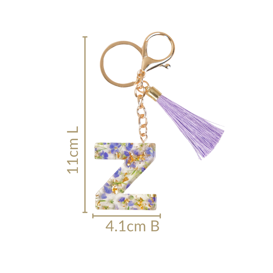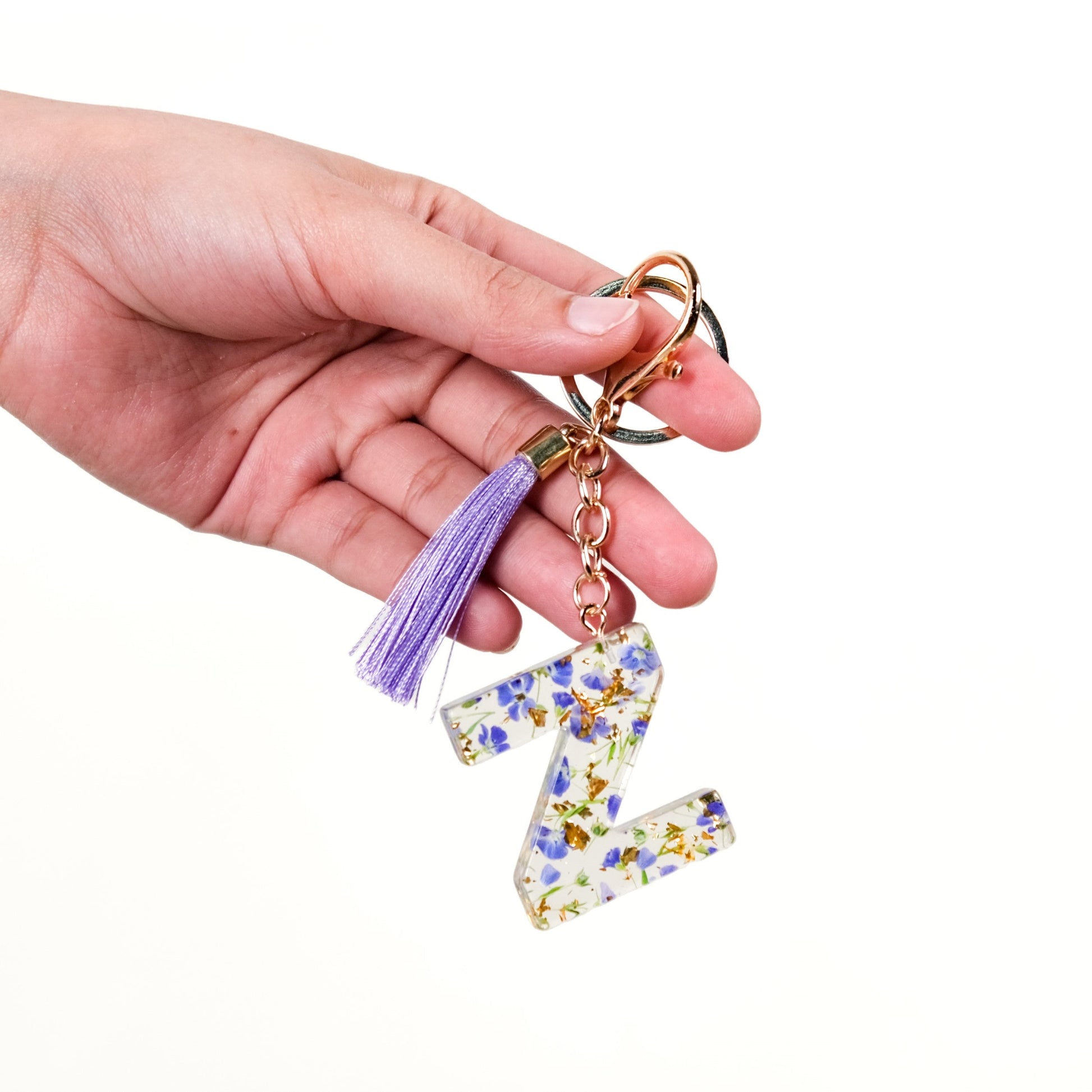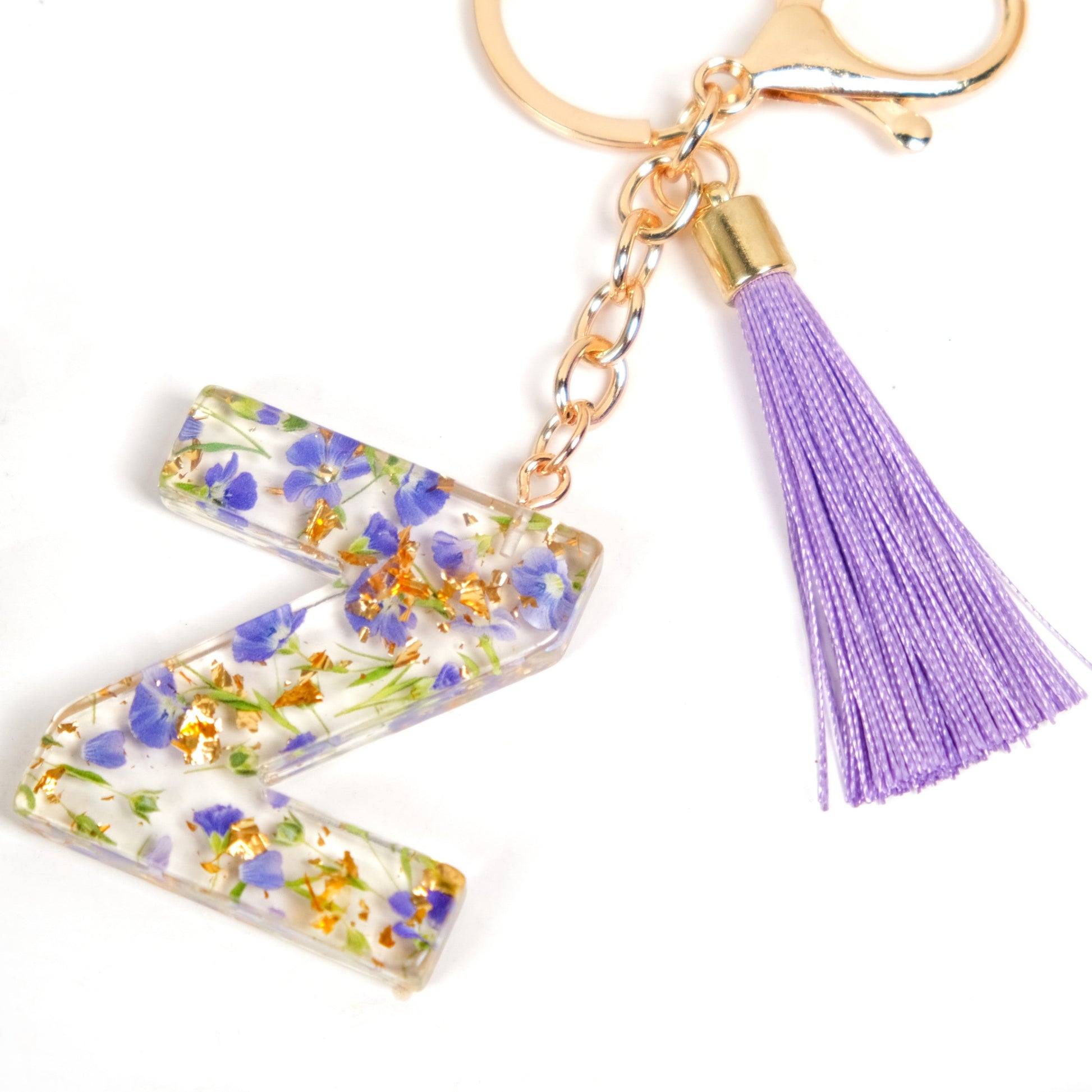 Add a touch of charm with the "Z" resin keyring, a delightful accessory featuring pressed lavender forget-me-not flowers (Myosotis), beautifully encased in transparent resin. The golden flecks enhance the design, adding a subtle sparkle. Complete with a chic satin tassel, this keyring offers practicality and style.