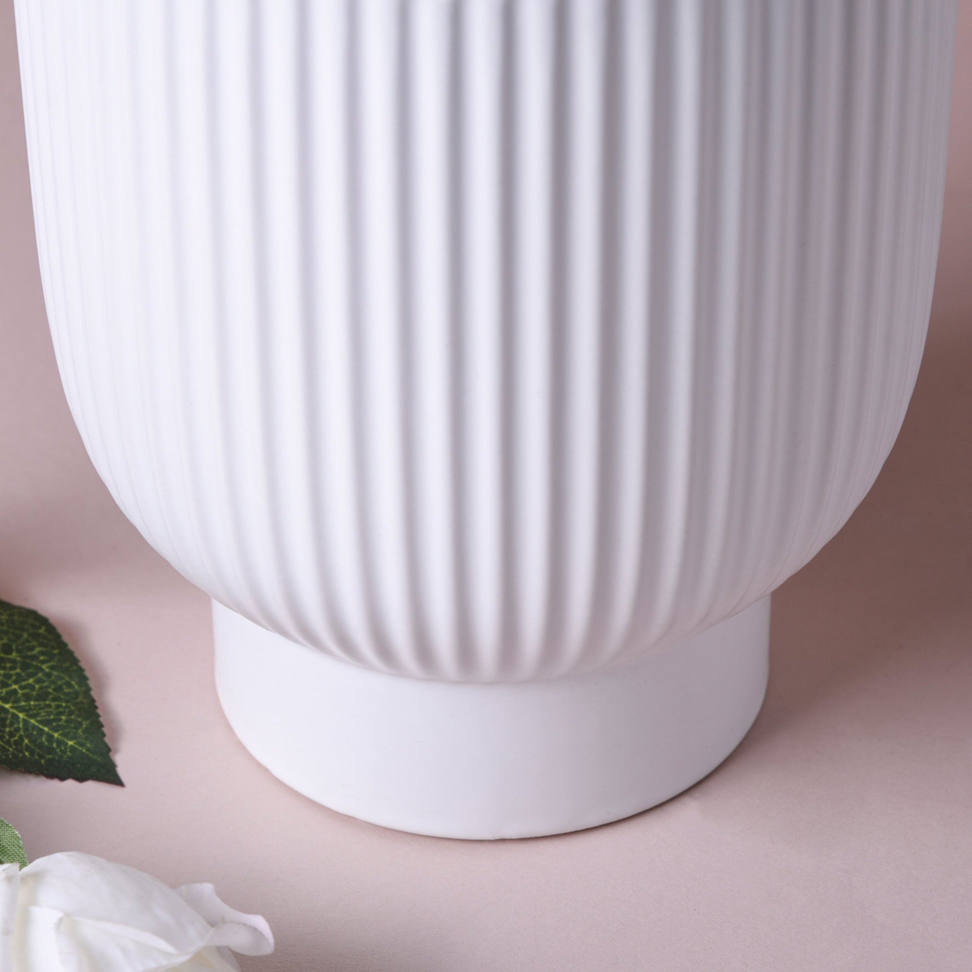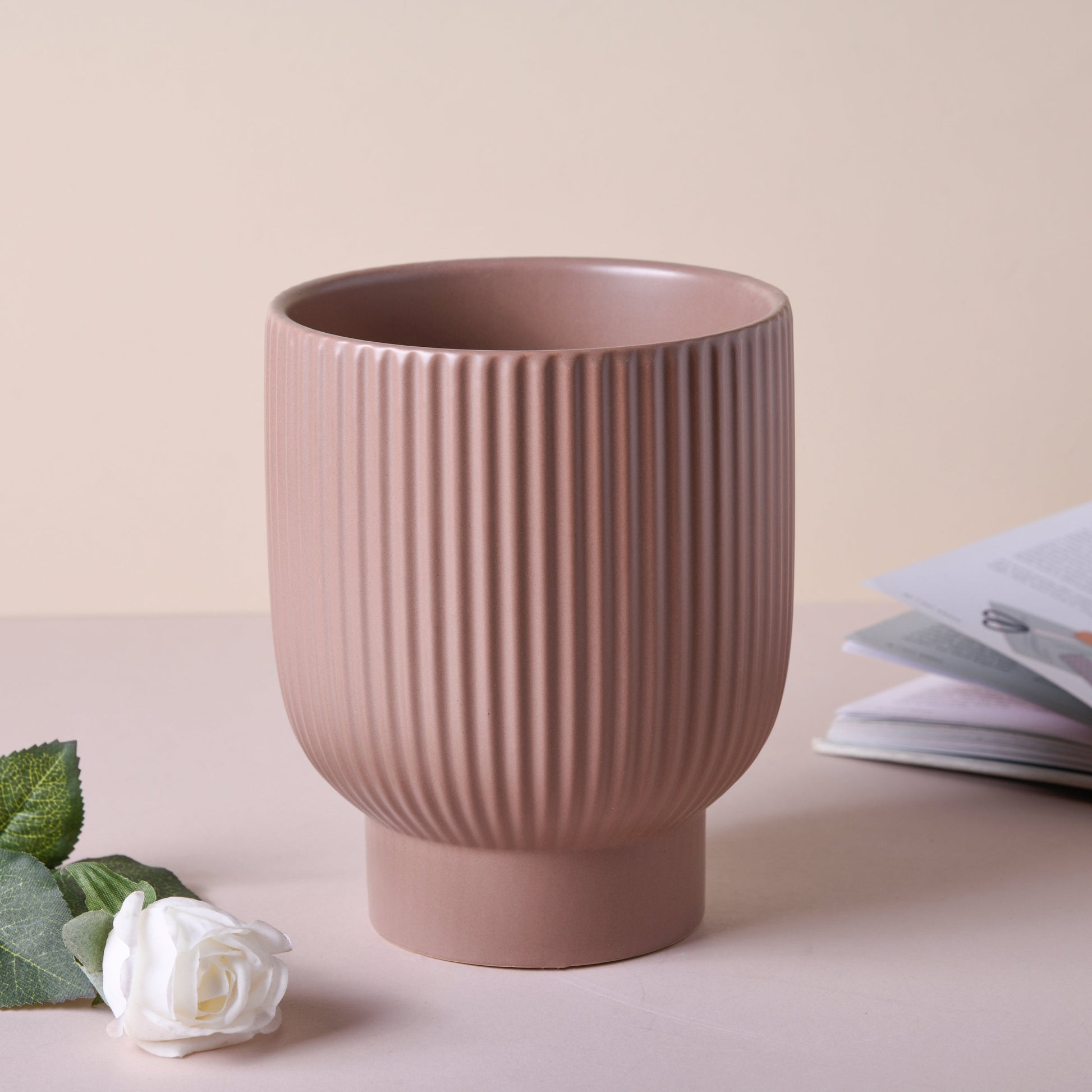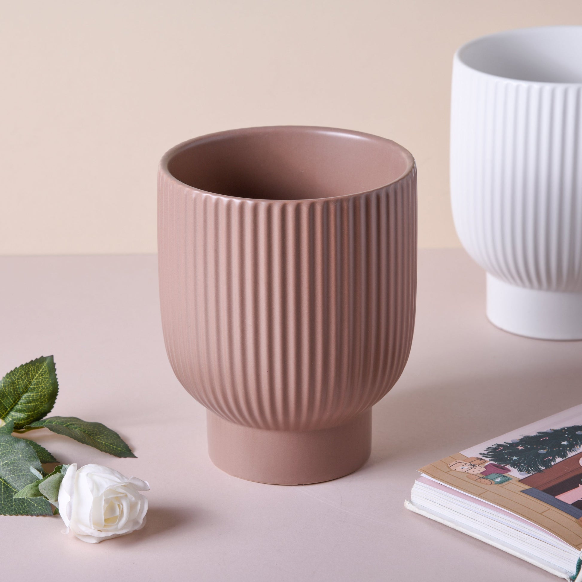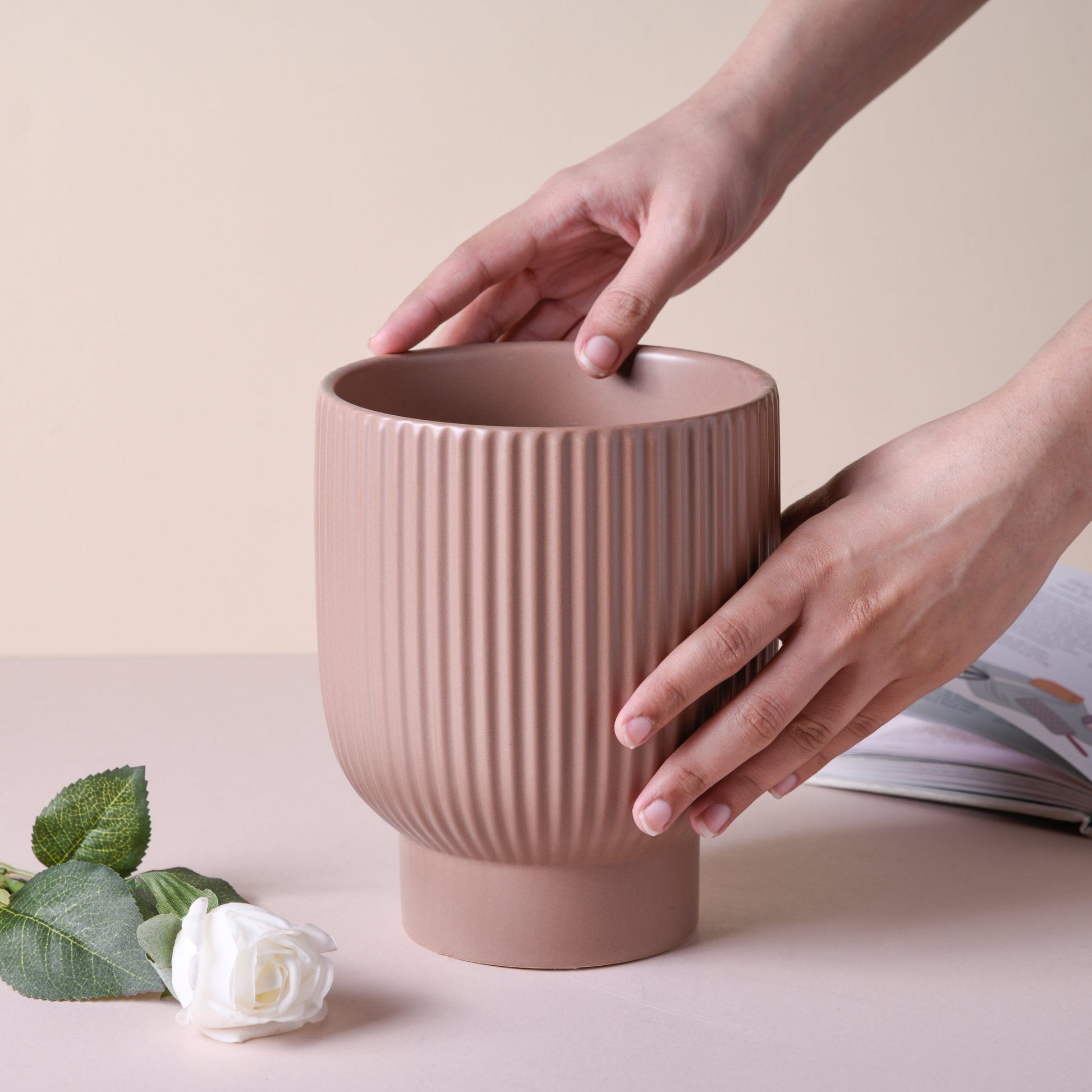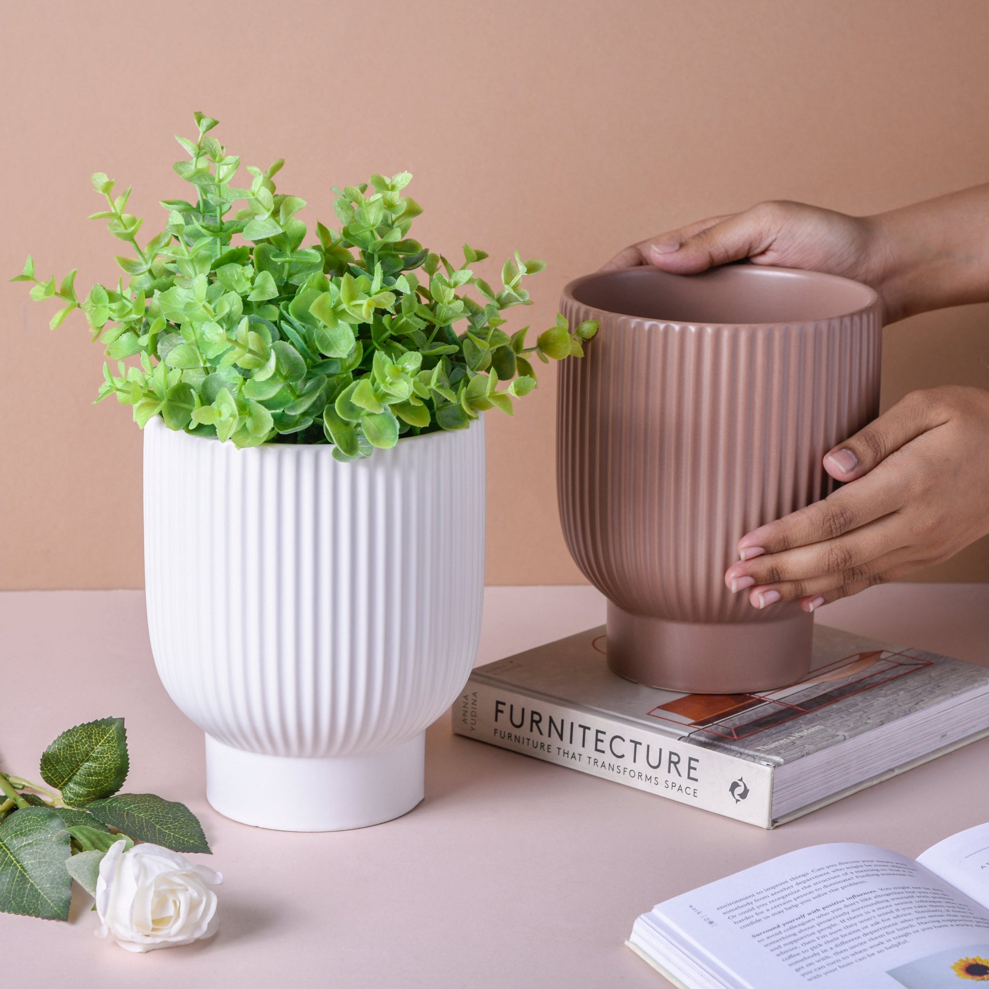 The ribbed plant vase in ceramic is an ideal home decor accessory to jazz up the dull and boring corners of the house. The cup-shaped vase is craftily made with stripes in a matte texture. Available in two distinct shades of brown and white, the round plant pots with a stand look amazing sitting on a tabletop with a couple of flower sticks or with an indoor plant.