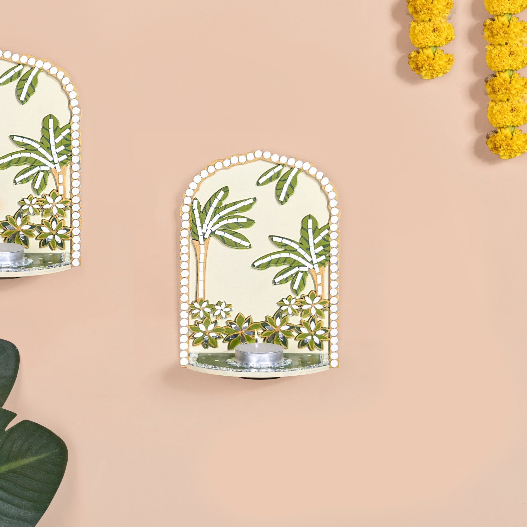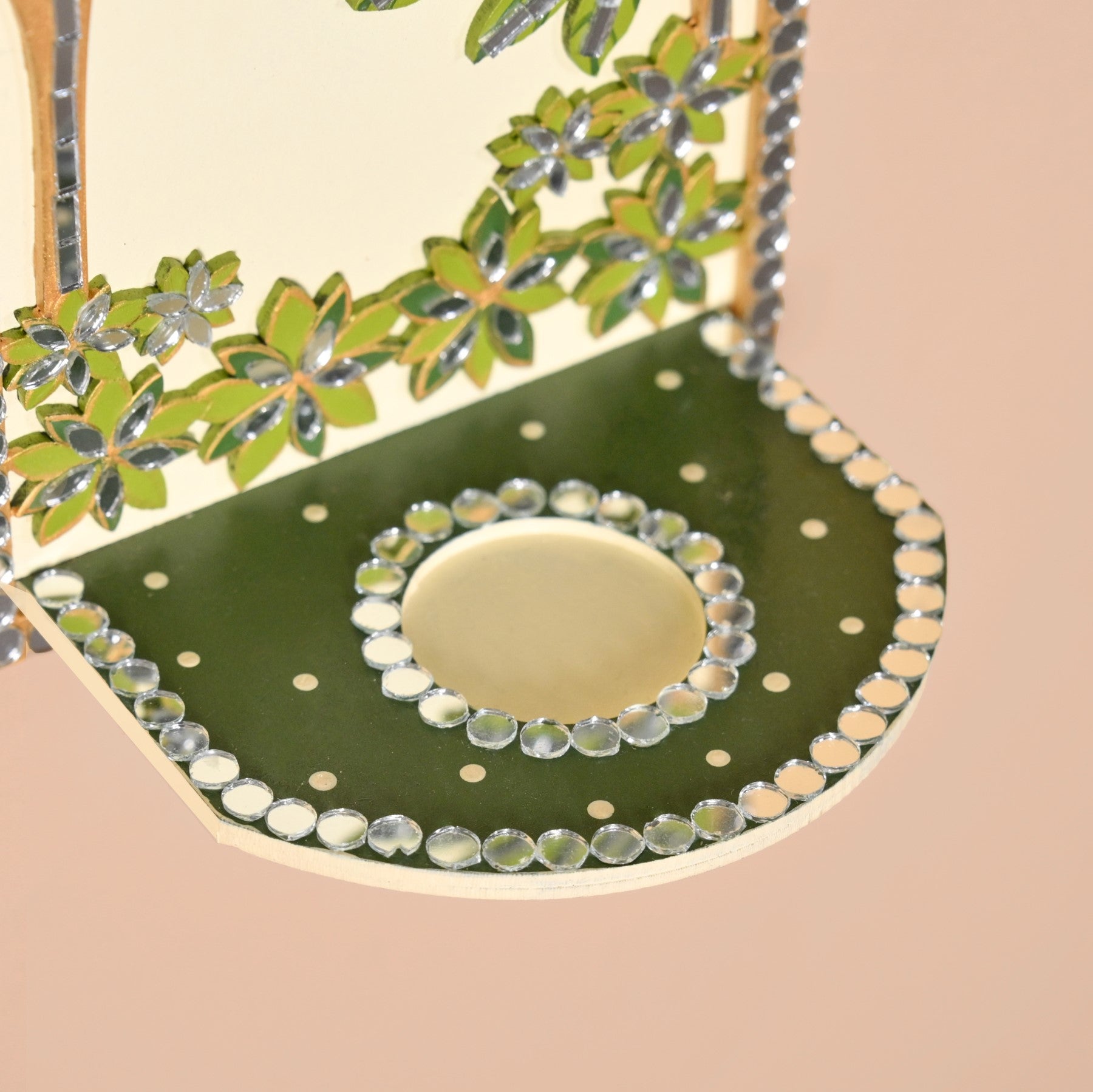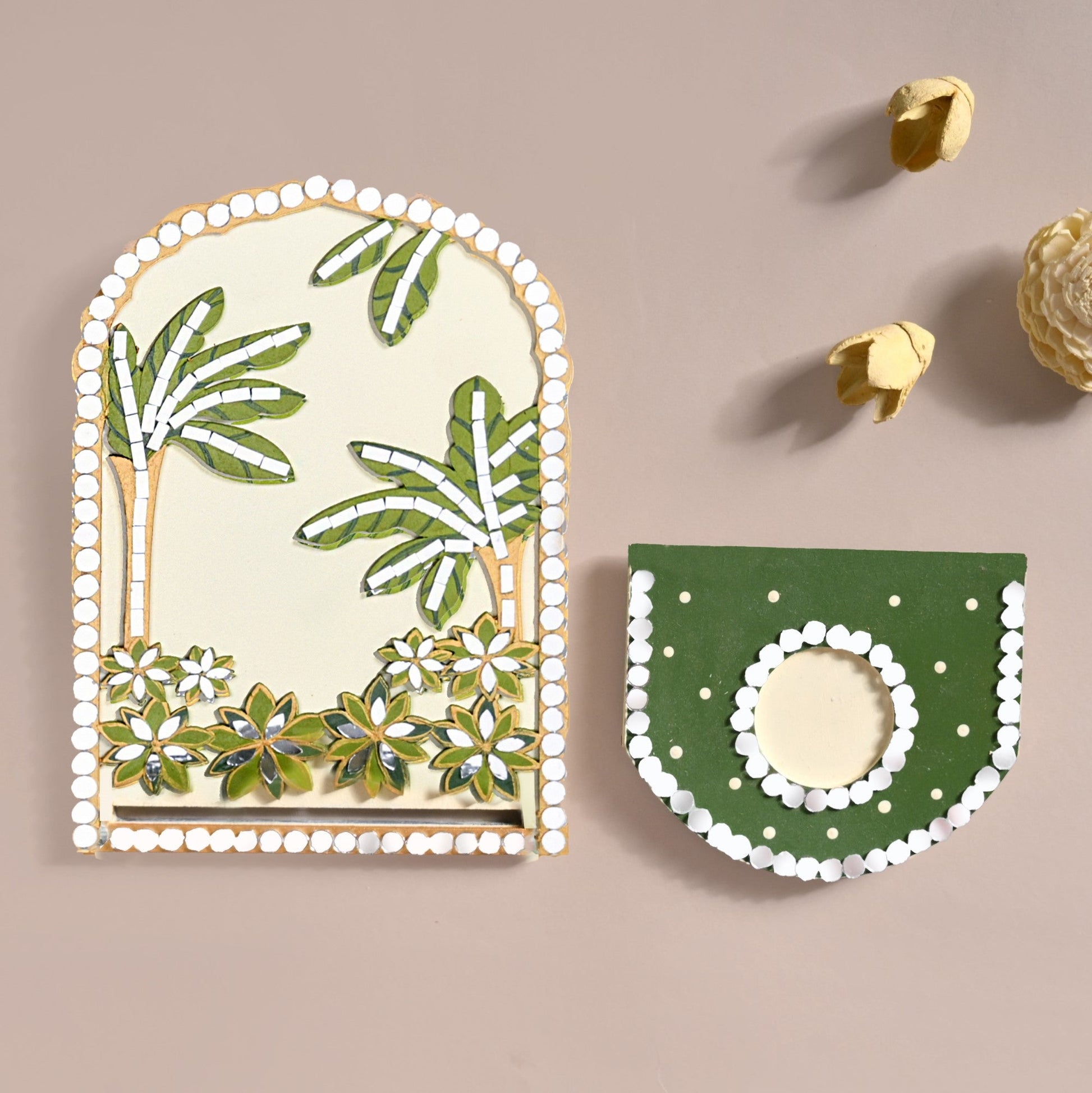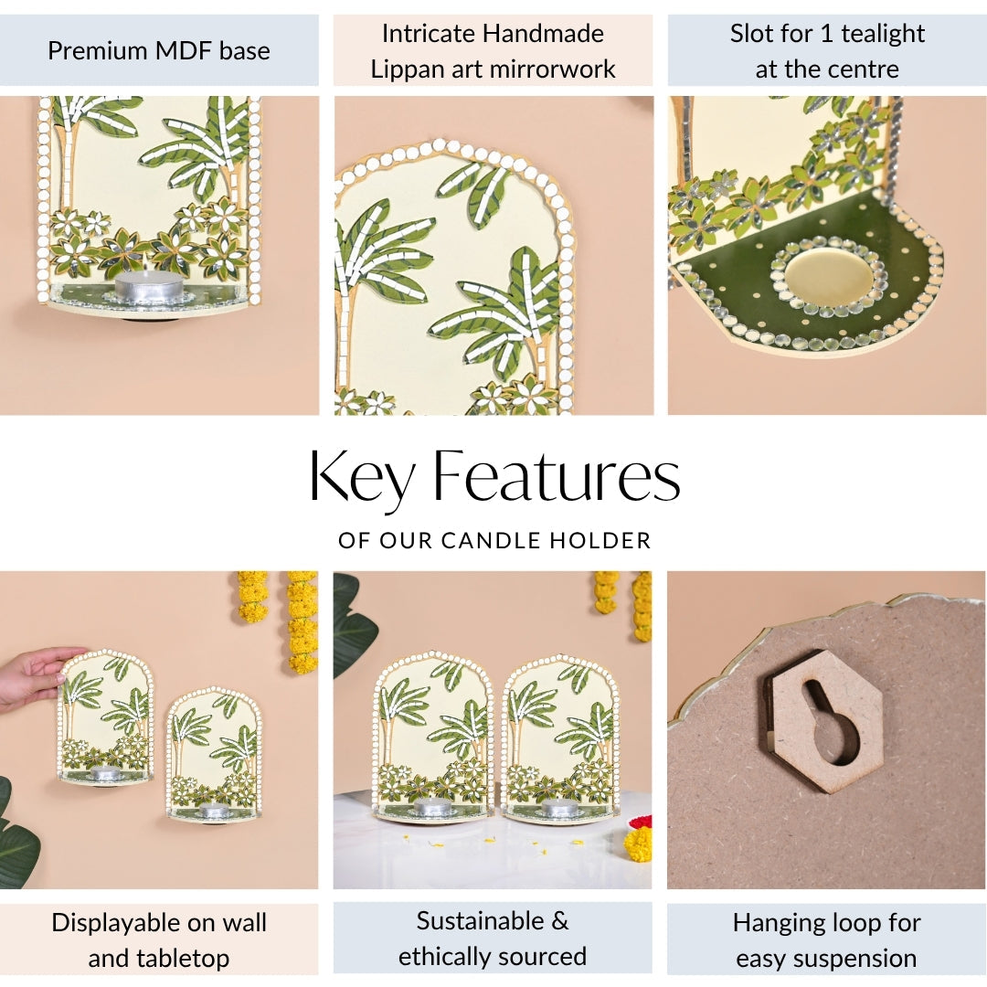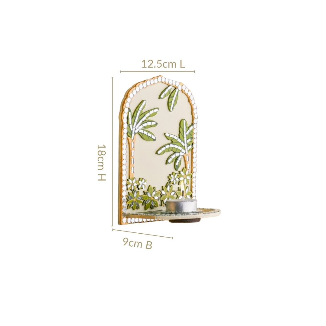 Design: Let your home shimmer with the charm of tradition and the finesse of handcrafted design. This piece features hand-painted palm trees, leafy florals, and intricate mirror inlays in soothing shades of green, white, and earthy gold. The arched backdrop, accentuated with golden lining, adds a regal touch, while the rounded base enhances the play of candlelight. The leaf motifs bloom at the base, symbolising prosperity and harmony. Surrounded by delicate mirrorwork, the entire tealight holder radiates a serene, nature-inspired glow, perfect for elevating any setting with artisanal elegance.