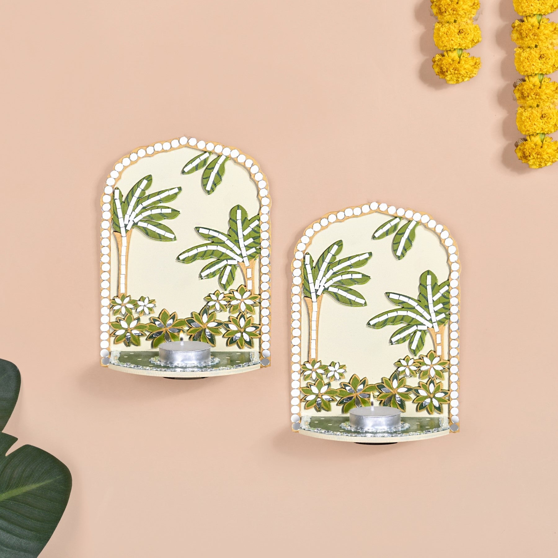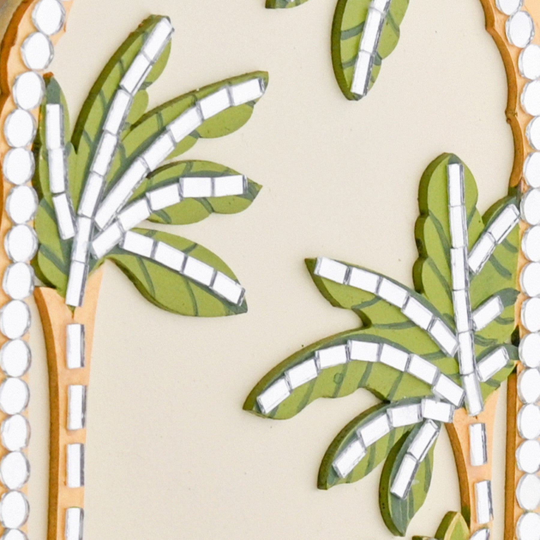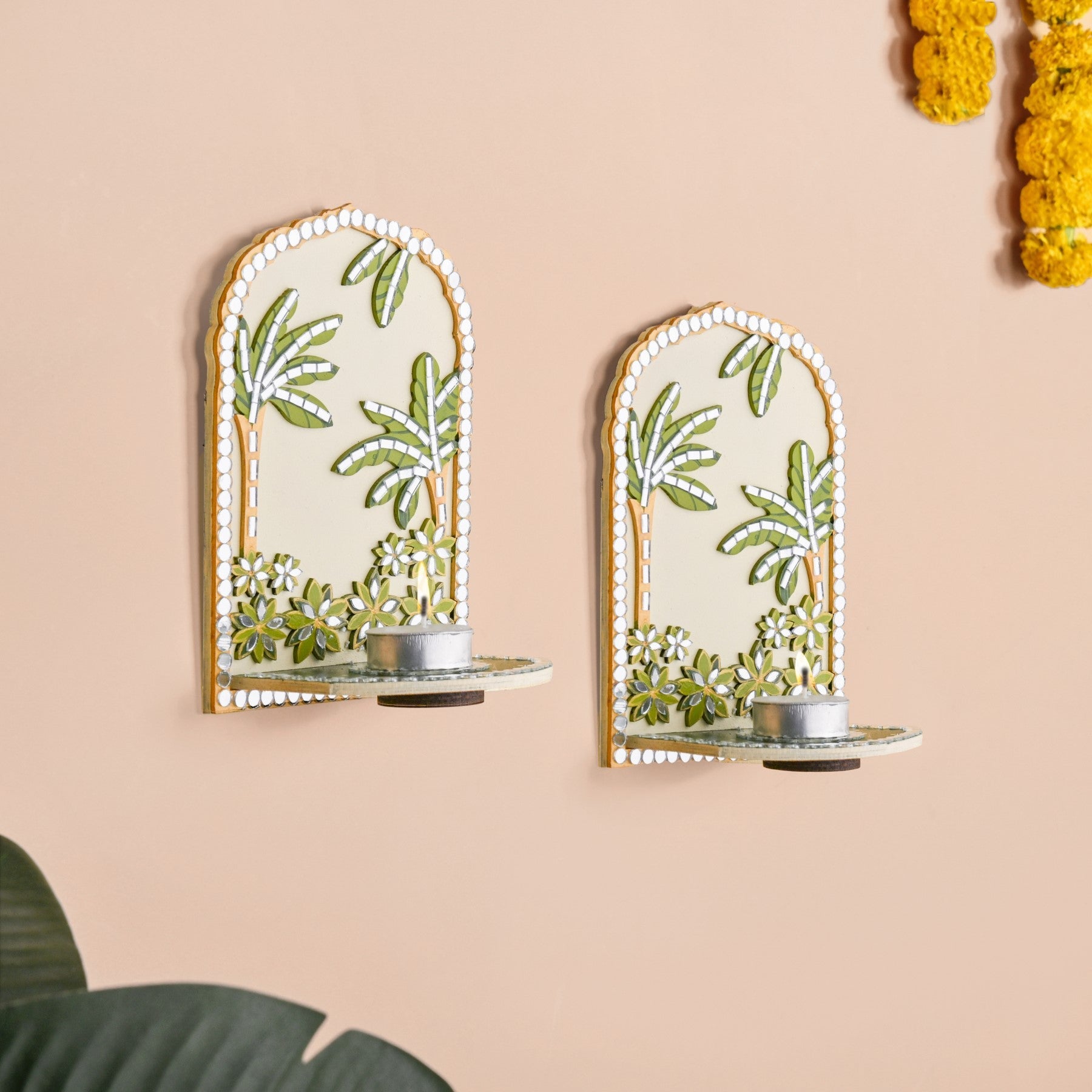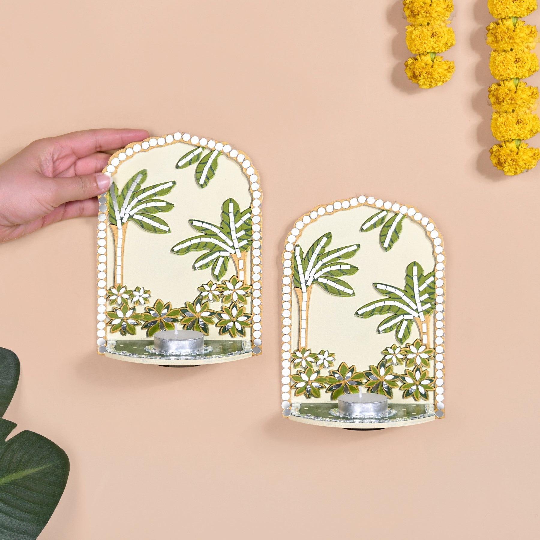 Design: Let your home shimmer with the charm of tradition and the finesse of handcrafted design. This piece features hand-painted palm trees, leafy florals, and intricate mirror inlays in soothing shades of green, white, and earthy gold. The arched backdrop, accentuated with golden lining, adds a regal touch, while the rounded base enhances the play of candlelight. The leaf motifs bloom at the base, symbolising prosperity and harmony. Surrounded by delicate mirrorwork, the entire tealight holder radiates a serene, nature-inspired glow, perfect for elevating any setting with artisanal elegance.