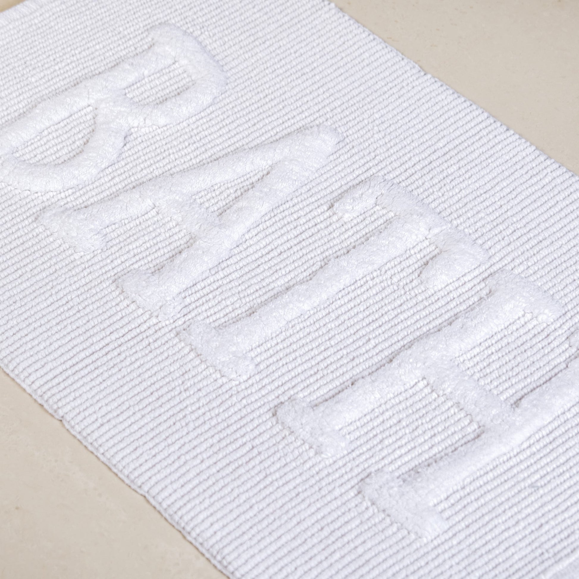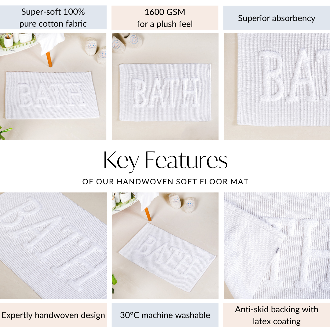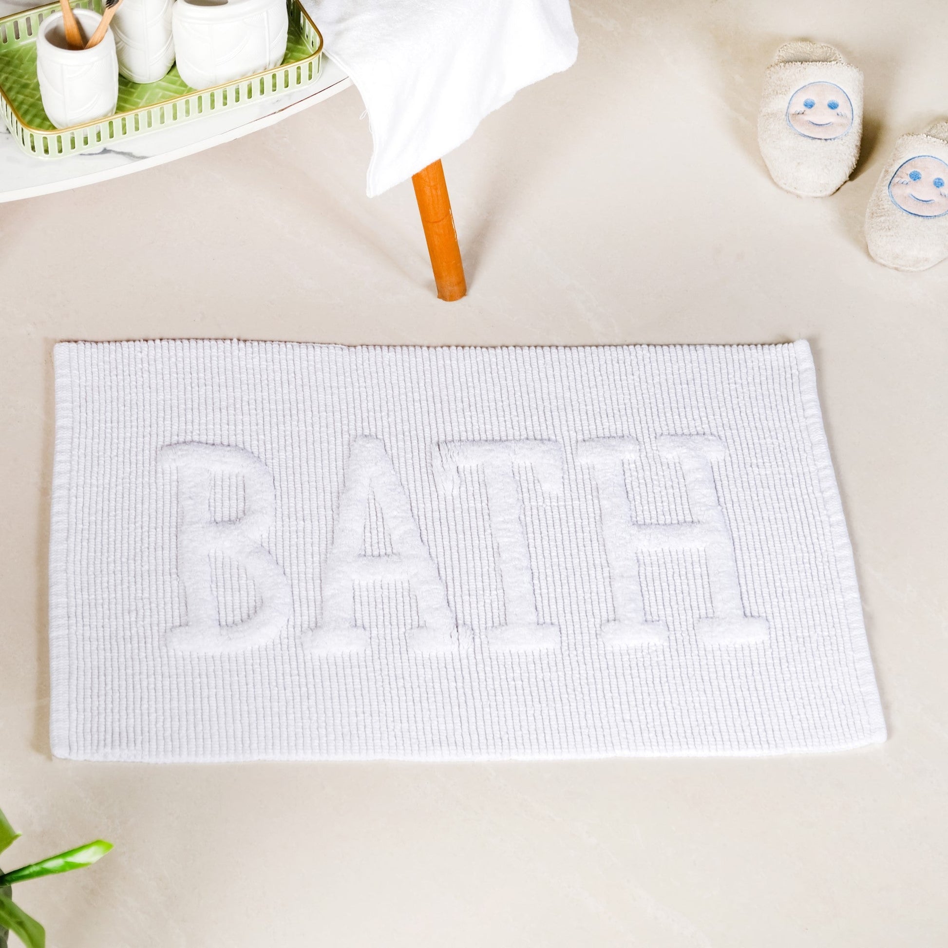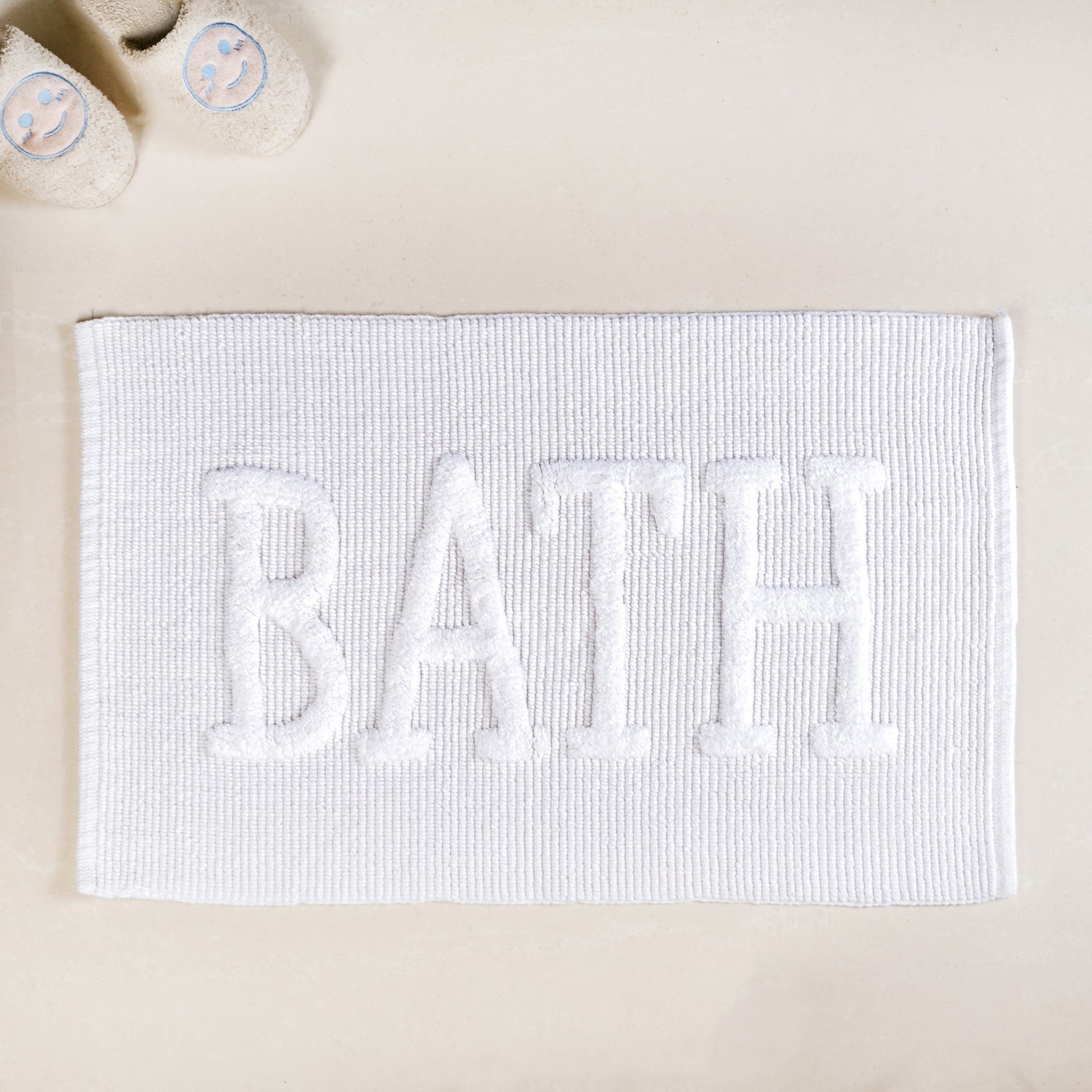 Design: The skillfully handwoven rectangle-shaped bath mat is washed in a pristine white hue with a fuzzy, tufted surface that spells out, "BATH."