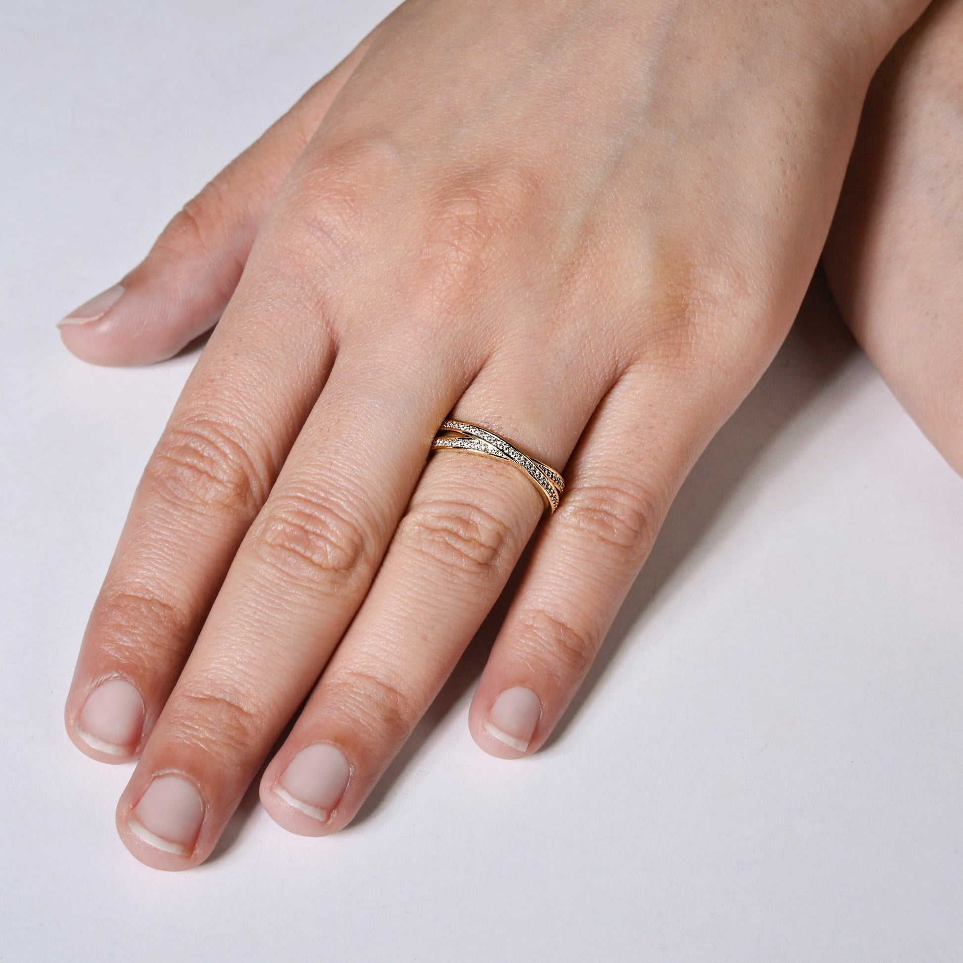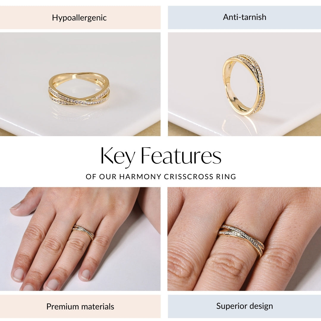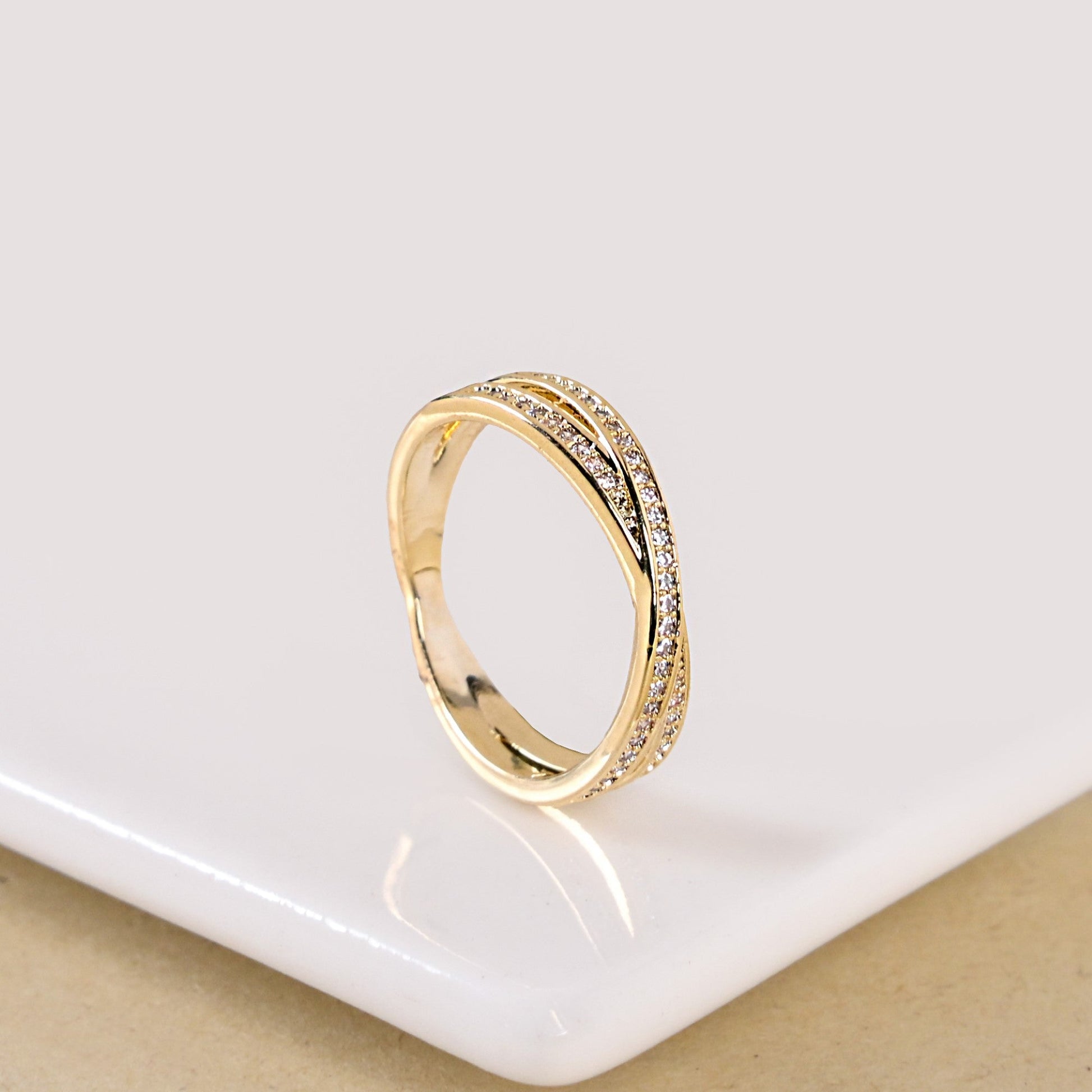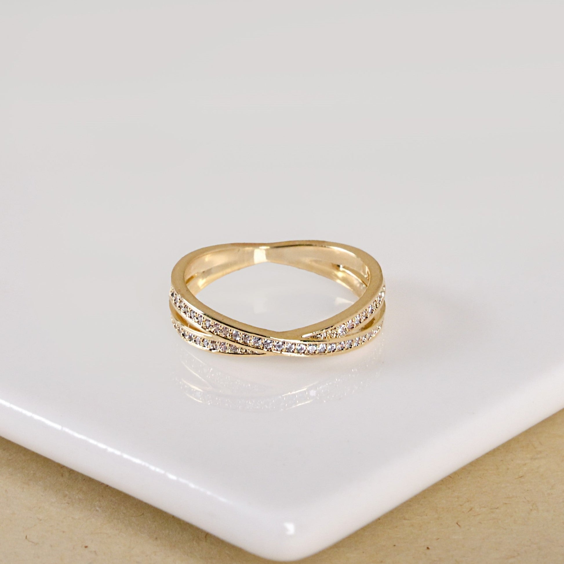 Like two paths intertwining in perfect harmony, this beautiful gold toned ring is a symbol of effortless elegance. This band gracefully overlaps, creating a stunning crisscross design that feels both bold and delicate. A trail of shimmering stones lines the front, catching the light with every movement—because a little sparkle never hurt anyone.