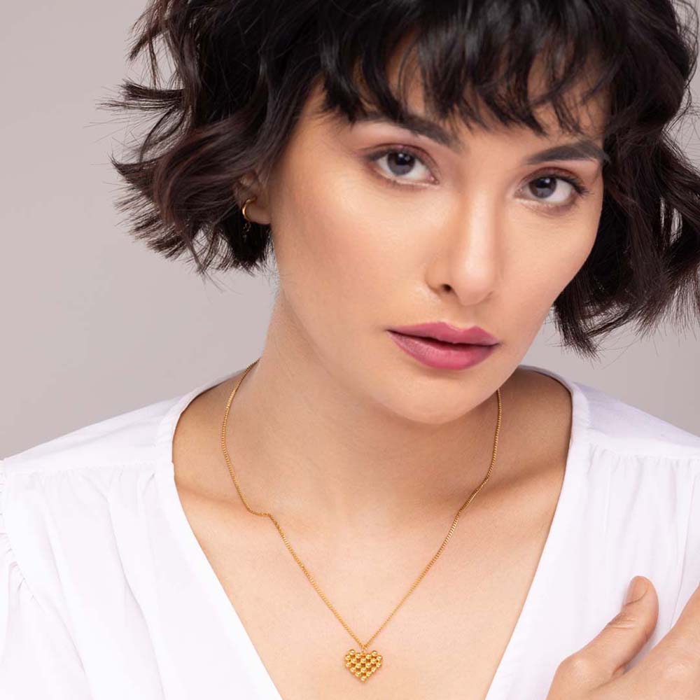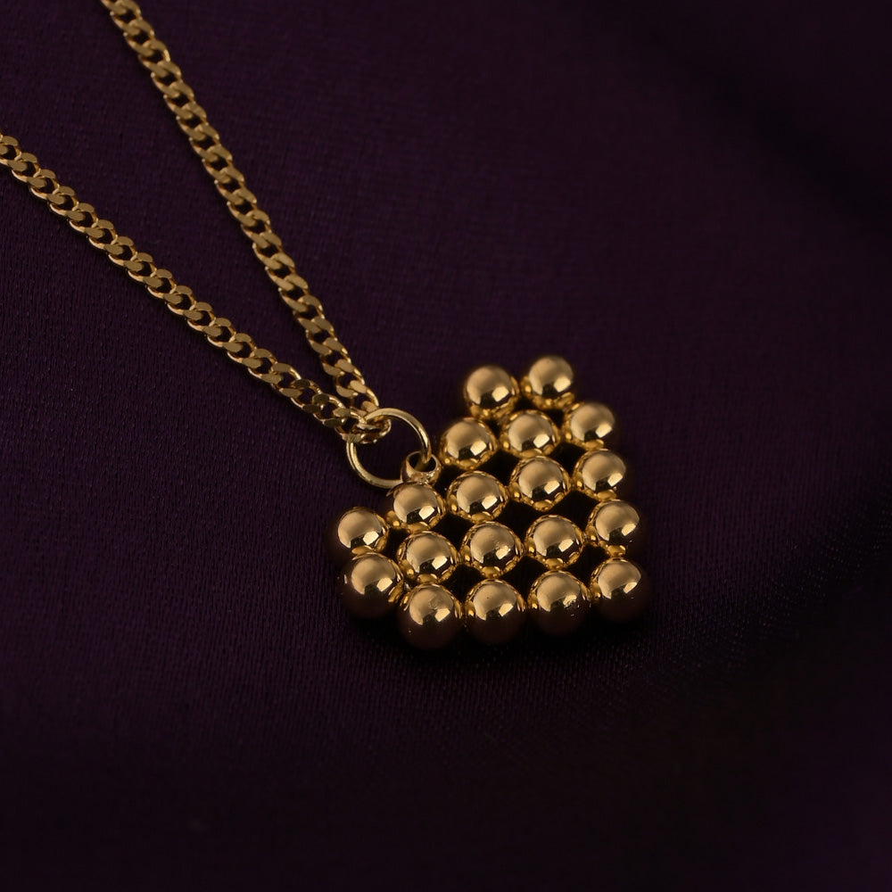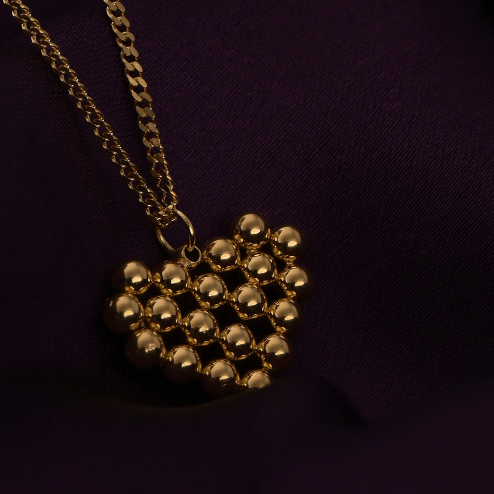 Introducing our exquisite Heart Bloom Beaded Necklace. The central element of this necklace is a heart-shaped pendant meticulously composed of small, radiant beads, each delicately coated in luxurious 18k gold. The result is a captivating blend of timeless elegance and modern allure, making it the perfect accessory for any occasion. Whether you're treating yourself or searching for the perfect gift, the Heartfelt Elegance Necklace is a symbol of affection and refined taste. Elevate your jewellery collection with this embodiment of love and beauty.