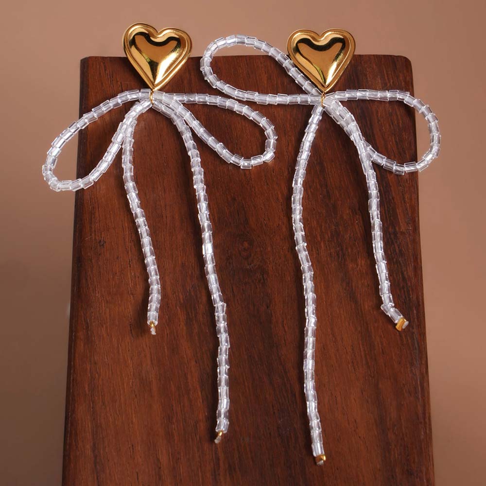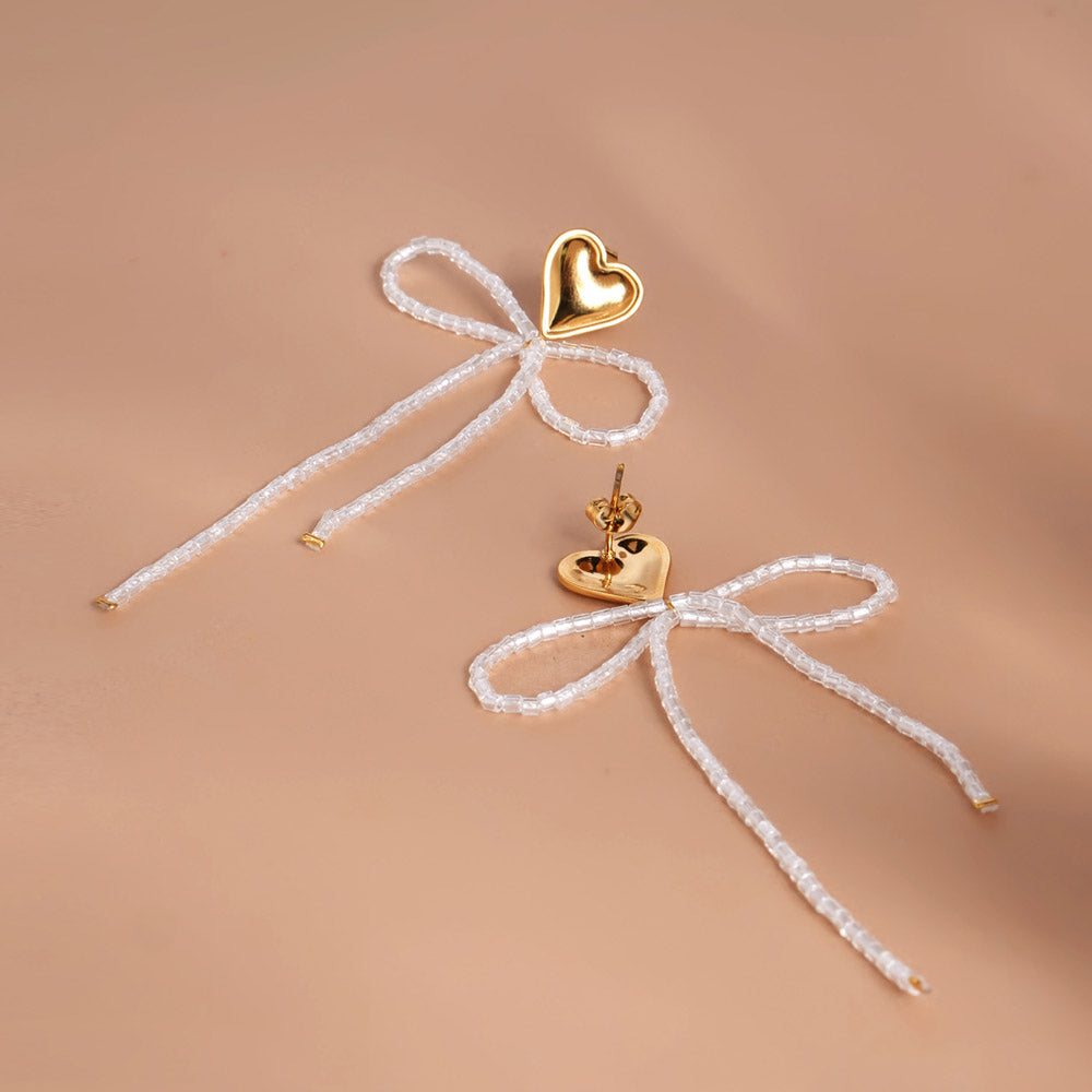Sweet and statement-worthy, these Heart Bow Bead Drop Earrings feature a shiny gold heart stud with cascading white beaded bows. Perfect for playful, romantic looks, they add a unique charm to festive or casual wear. Waterproof and anti-tarnish for worry-free styling.
