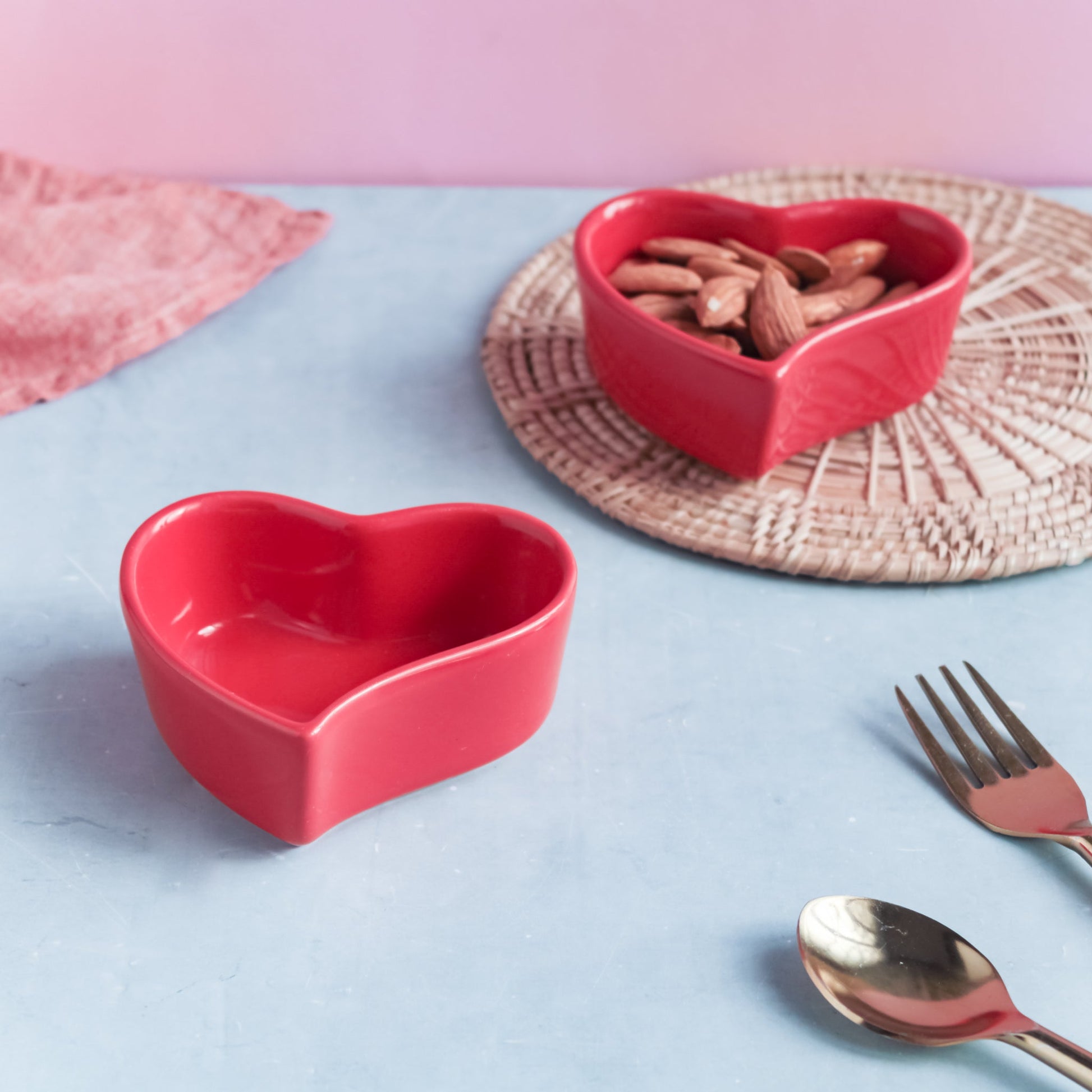 Ceramic heart bowls for a heart felt serving that comes as a set of 2 bowls. The pink ceramic heart bowl and red ceramic heart bowl can be used to bake mini cakes, soufflé and pudding for the dear ones. Use the ceramic heart shaped bowl set to serve the dear ones as a gesture of warmth on special days like anniversaries, birthdays, valentines day. One can also serve fruits, candies and Knick knacks in the small heart bowls.