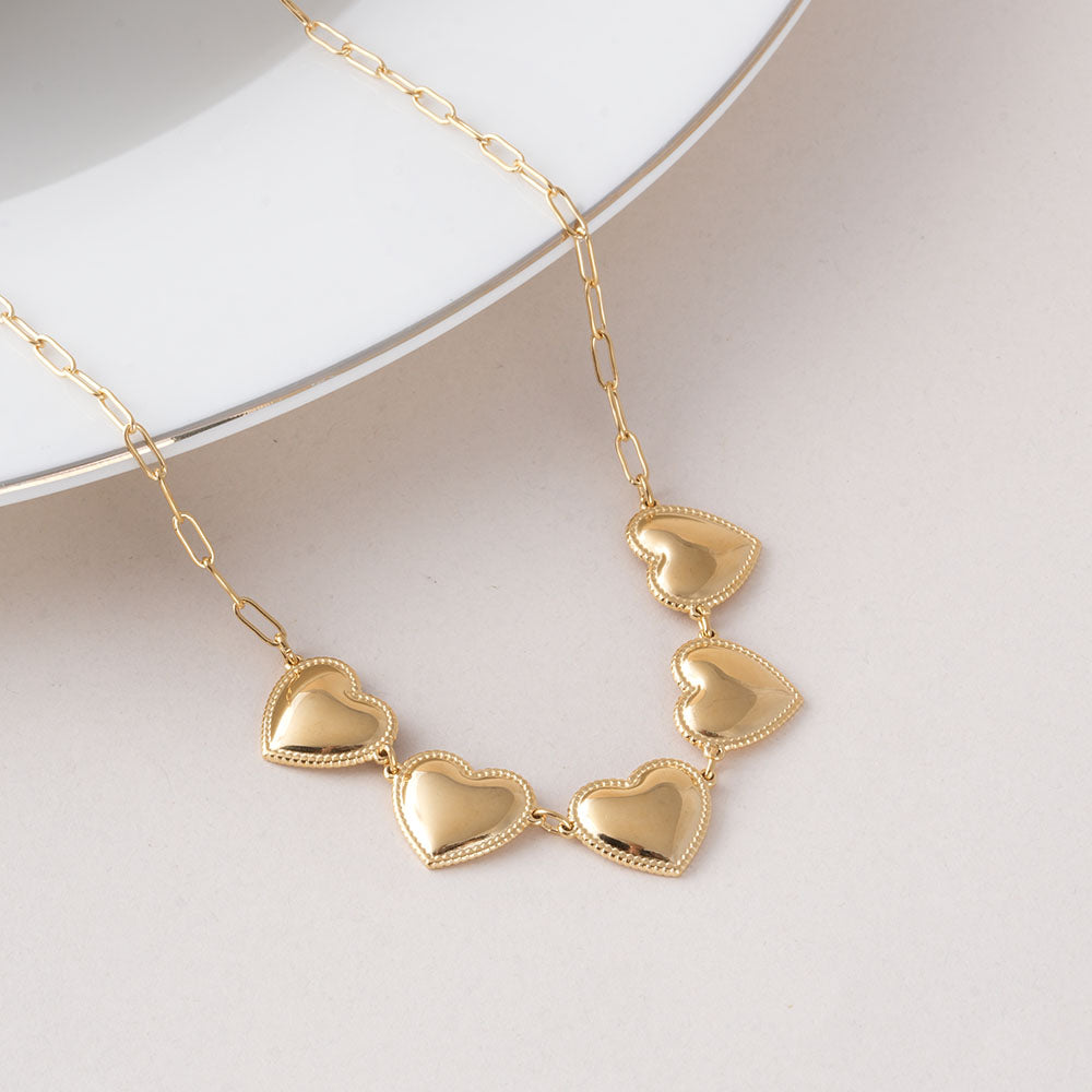 The Heart Charm Necklace is a chic and playful jewellery piece featuring dainty heart charms along a sleek 18k gold-plated stainless steel chain. Perfect for layering or wearing solo, this necklace adds a subtle sparkle and contemporary elegance to any outfit. Ideal for casual, office, or evening ensembles, it brings refined charm and modern sophistication to your jewellery collection.