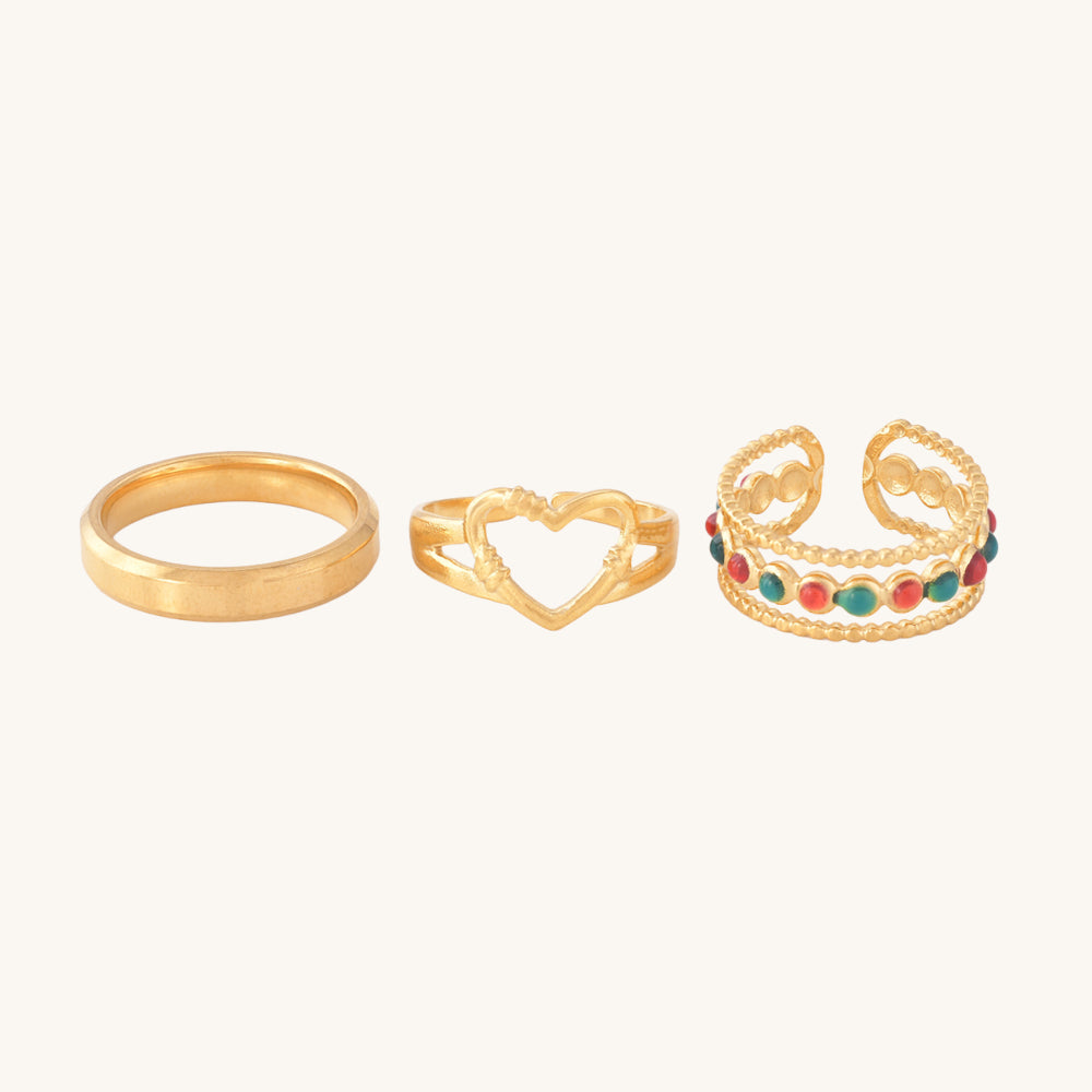 The Heart Enamel Ring Set is a playful jewellery piece crafted from stainless steel with 18k gold plating. This adjustable set is waterproof and anti-tarnish, making it perfect for everyday wear. Its vibrant heart enamel designs add a fun, youthful charm, making it ideal for stacking, gifting, or adding a pop of color to casual and festive outfits.