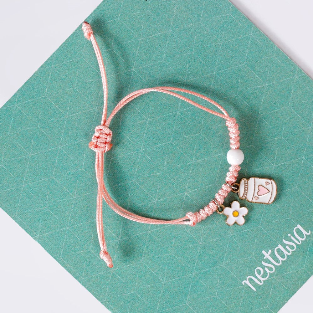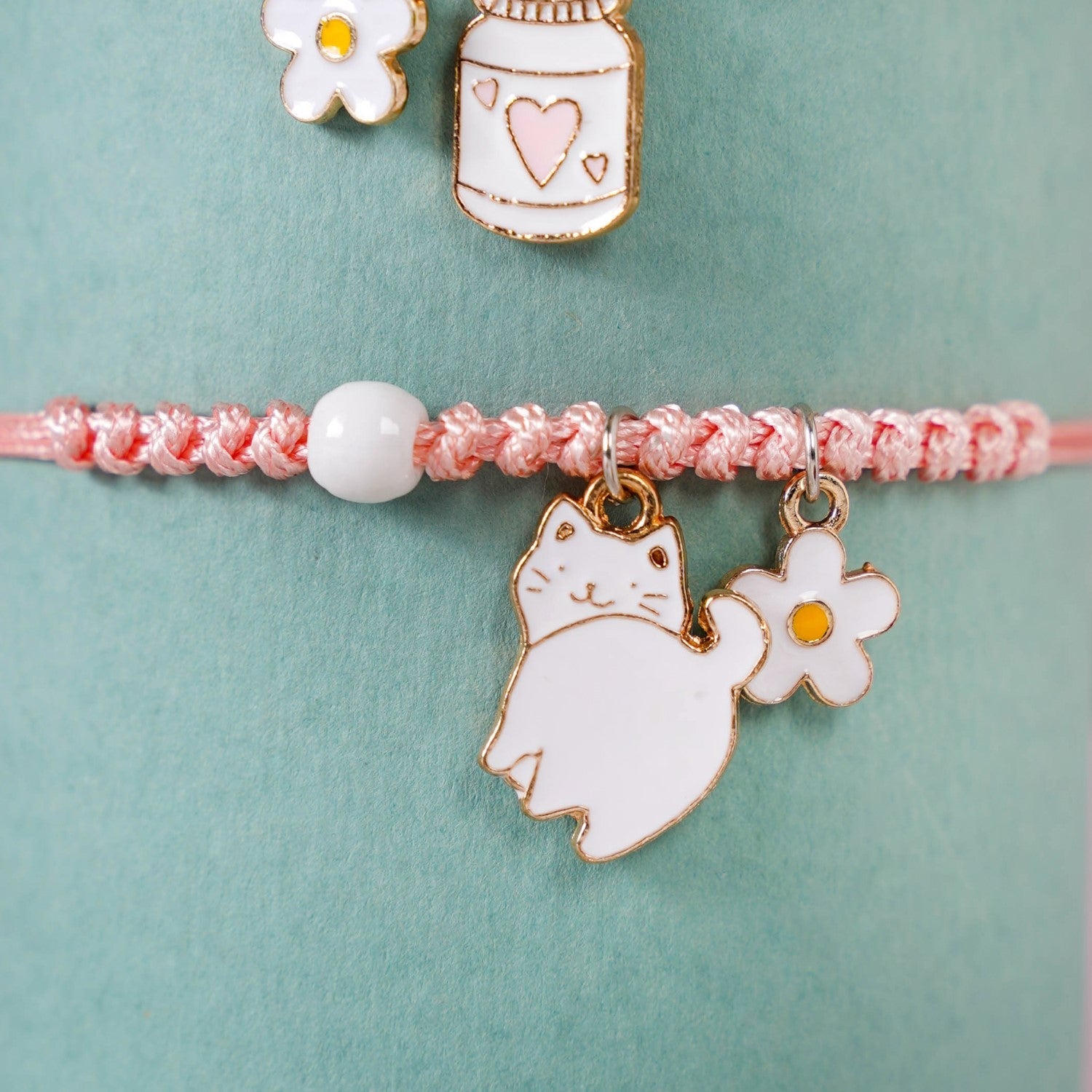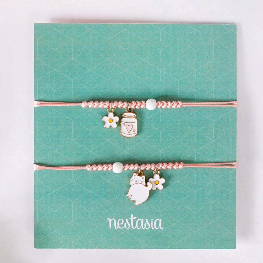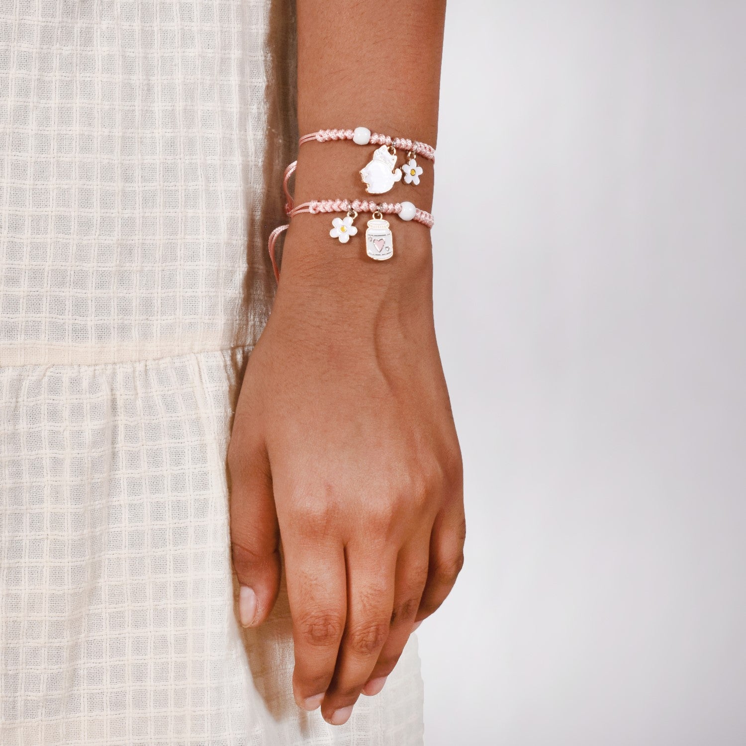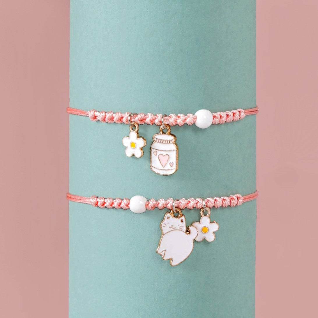 Adorn the little ones' wrists with all things kawaii, courtesy of our set of 2 tie-up bracelets. Perfectly Pinteresty and bringing a delicate, soft aesthetic to the forefront, these bracelets will look super chic on adults alike. The bracelets feature pretty pink braided threads with one highlighting an adorable kitten with a smile on her face, whiskers and all. The other showcases hearts inside a jar, adding a whimsical touch to the set. Both bracelets are complemented by beads and dainty flower charms. Whether gifted to the kiddos or worn to add a fun twist to any look, these bracelets are crafted to inspire smiles.