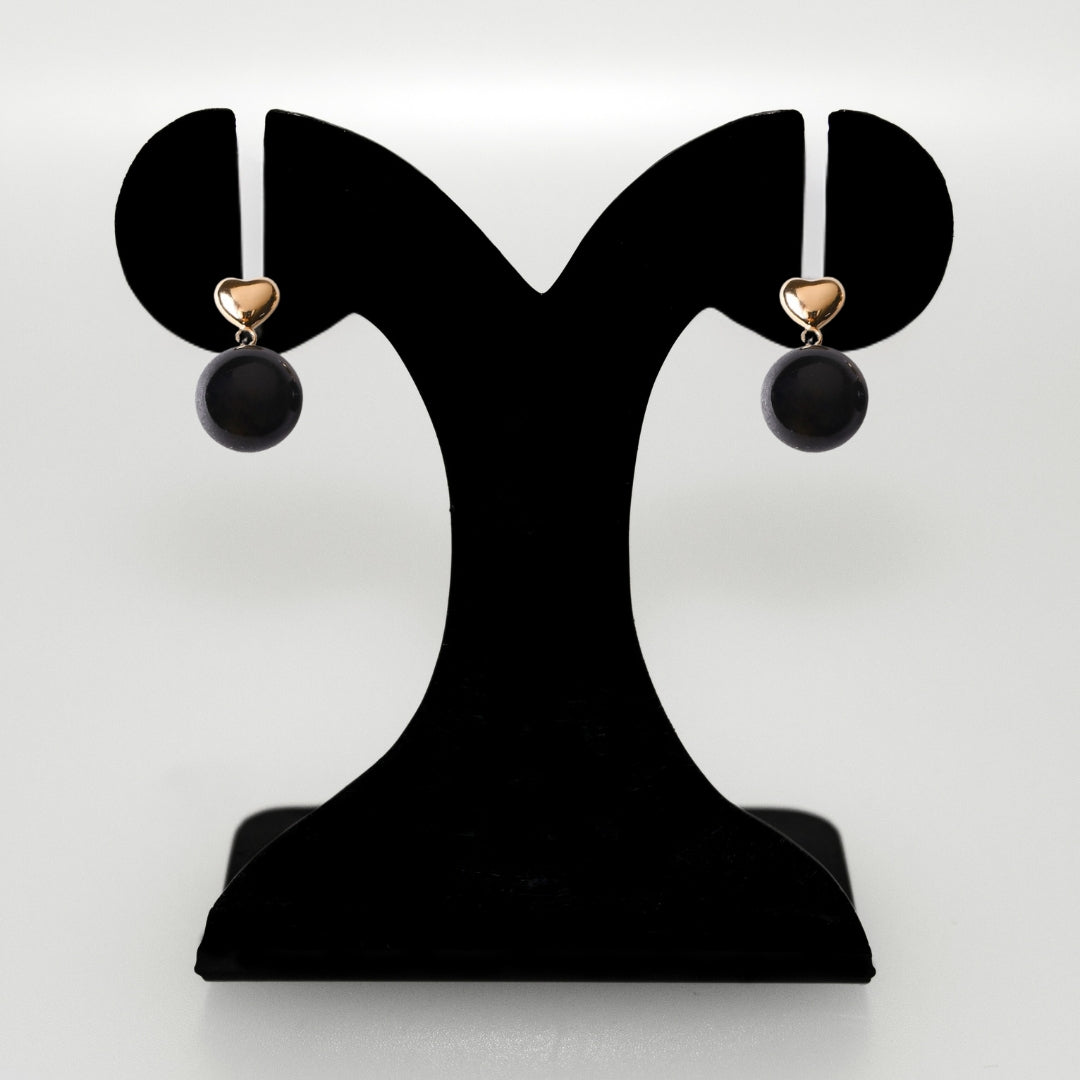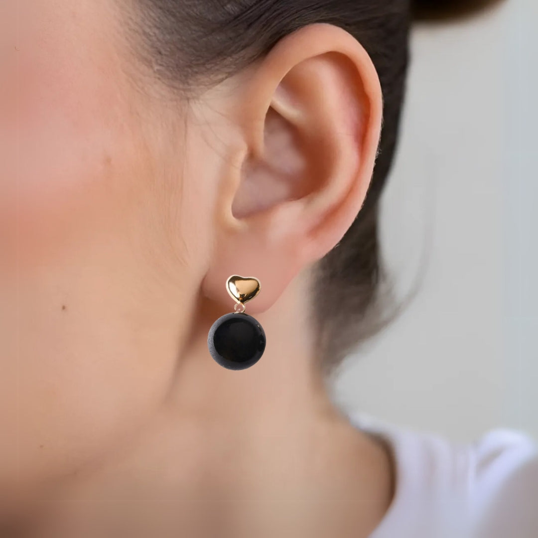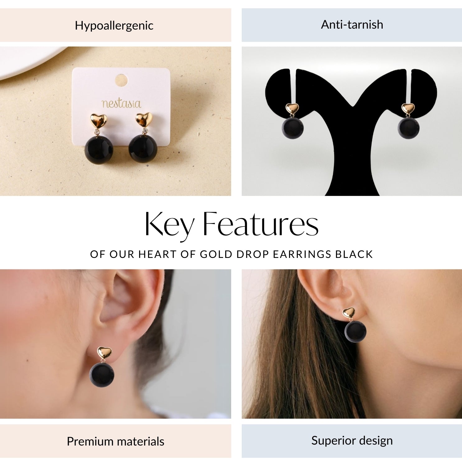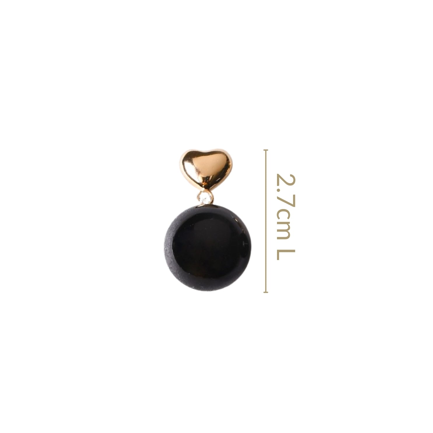 Shine bright with these captivating drop earrings, featuring a gold-toned, heart-shaped metal top, adorned with a sparkling stone for a touch of glamour. A sleek black ball dangles gracefully from the back tip of the heart, creating a striking contrast. Inspired by contemporary minimalism with a hint of romantic charm, these earrings are designed to make a subtle yet bold statement. The combination of gold and black creates a timeless aesthetic, making them the perfect accessory for both casual and formal occasions. Add a chic finishing touch to your look with these stylish drop earrings.