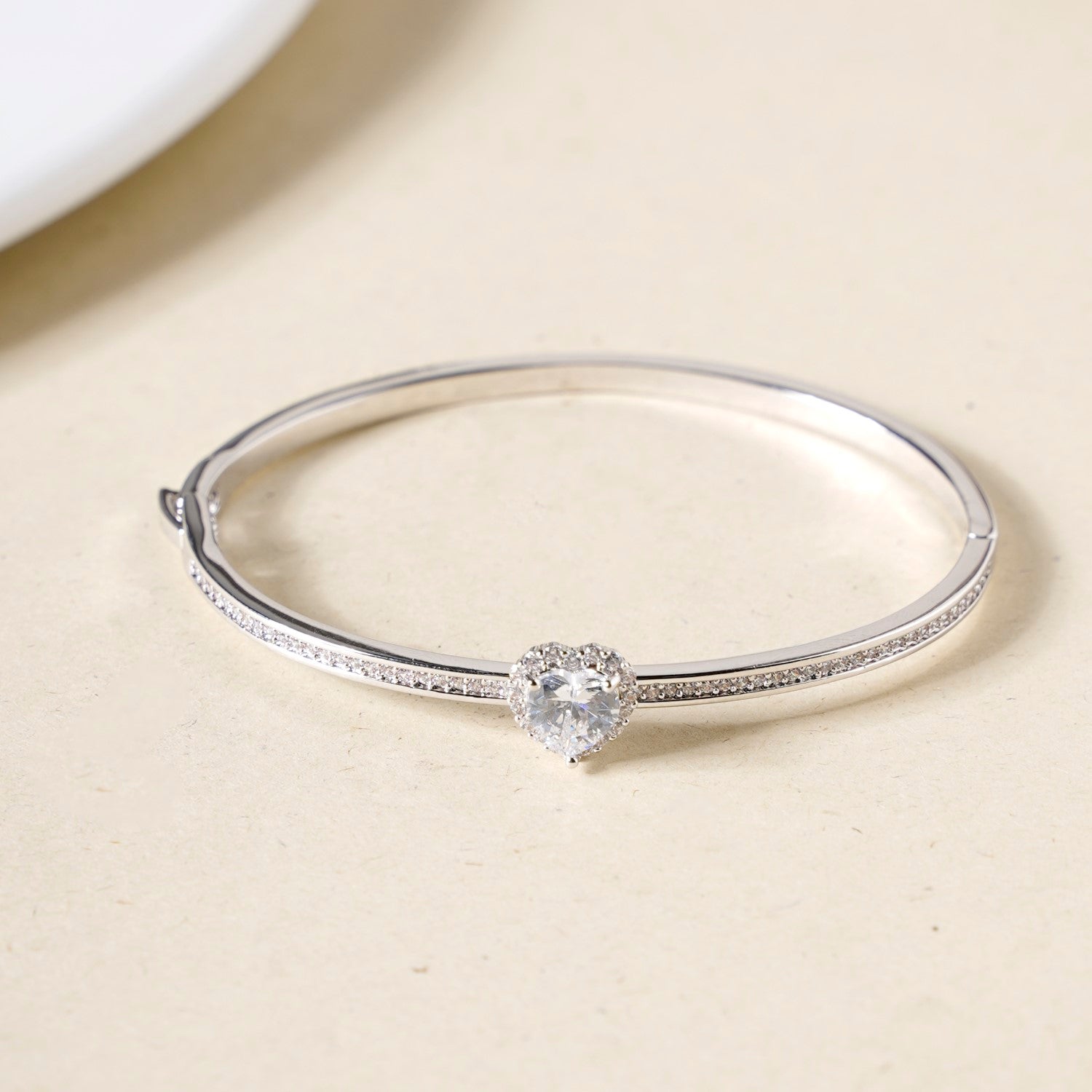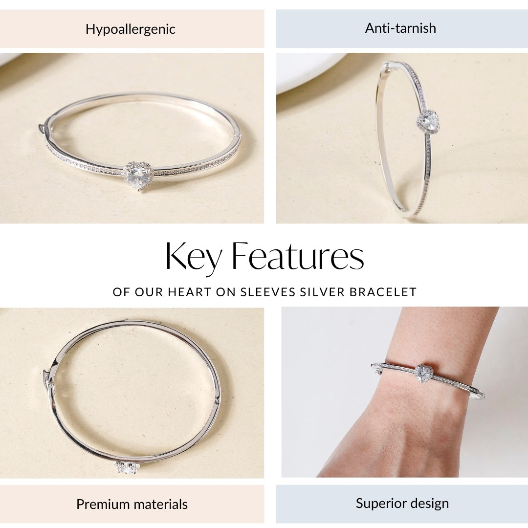 Some pieces don’t just accessorise—they tell a story. This bracelet weaves together elegance and charm, with a delicate row of shimmering stones that dance with every flick of your wrist. But the real magic? A breathtaking diamond-heart centerpiece, hugged by a sleek silver embrace and dusted with even more brilliance. Soft, romantic, and endlessly captivating, this isn’t just jewelry - it’s a little piece of stardust, ready to light up your look, day or night.