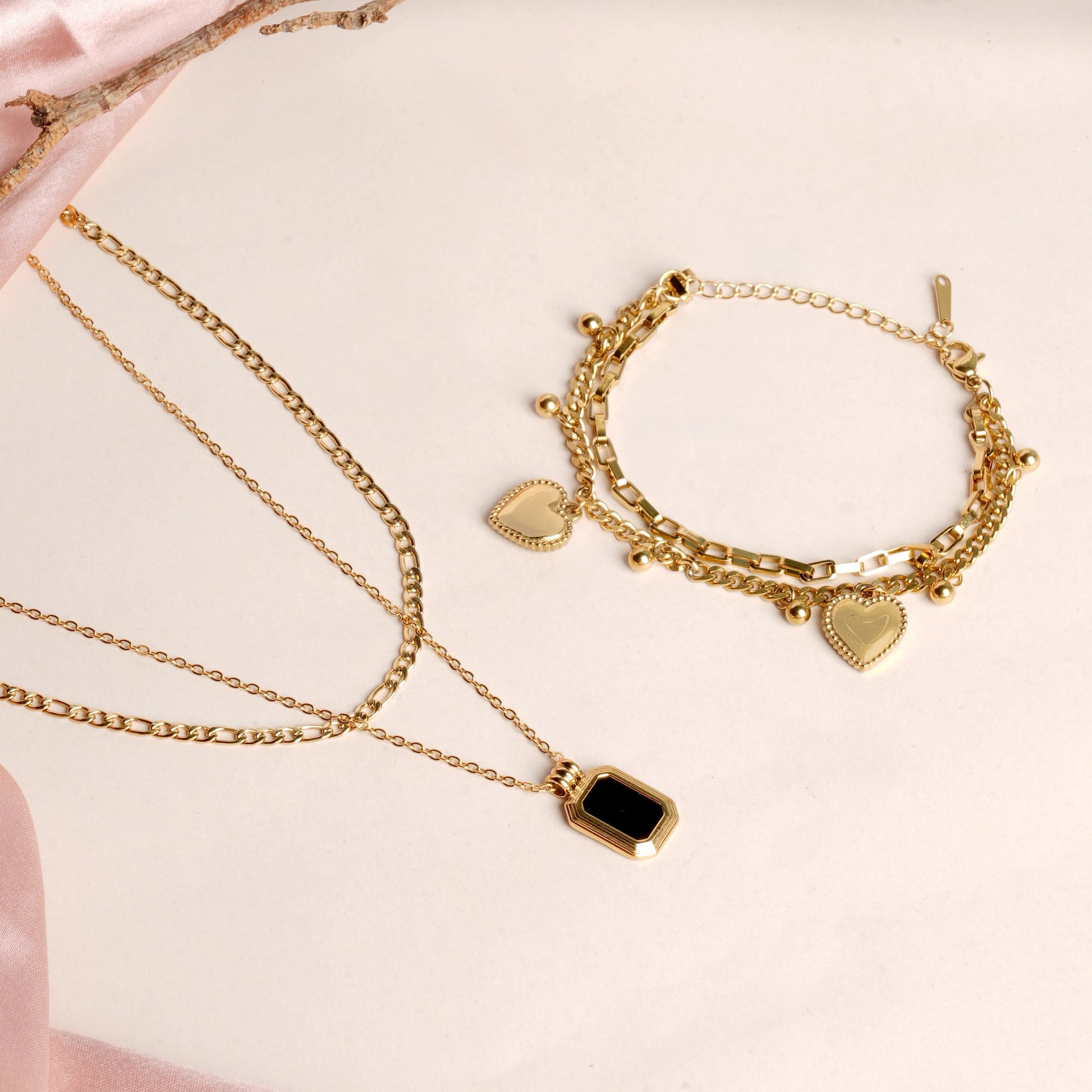 Hearts All Over Bracelet & Black Onyx Two Layer Necklace Jewellery Set