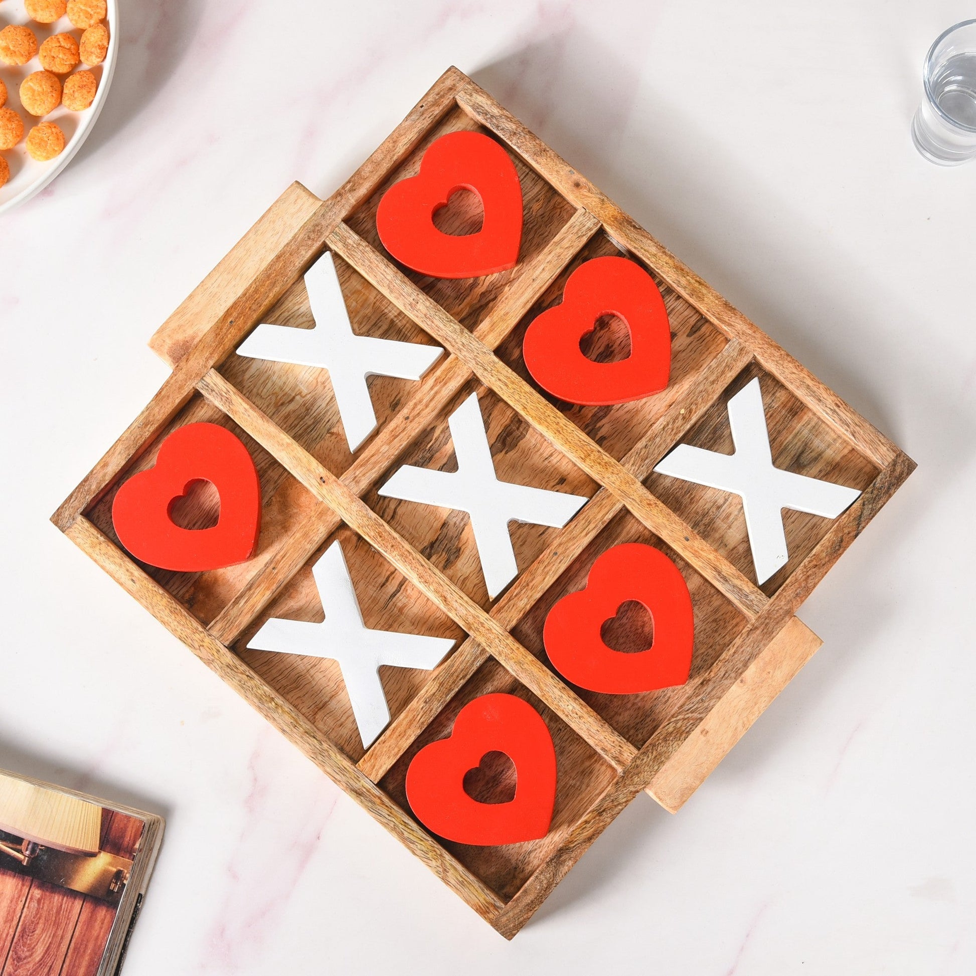Design: This charming Tic Tac Toe set features a beautifully crafted mango wood board with a natural finish, bringing an earthy touch to your game night. The 'X' pieces are a crisp white, while the 'O' pieces are delicately heart-shaped and painted in a vibrant red, making it a delightful addition to any Valentine’s Day and games night setting.