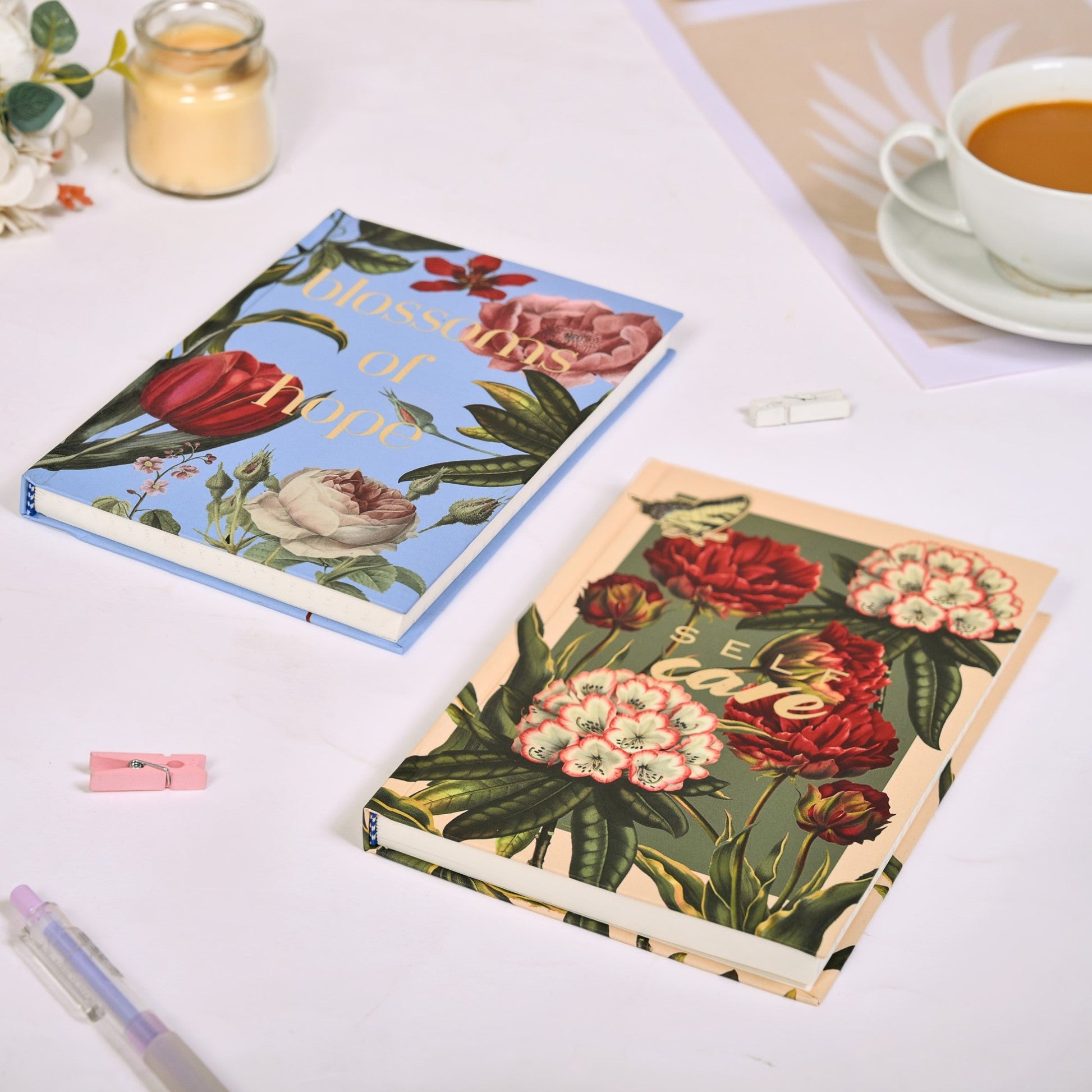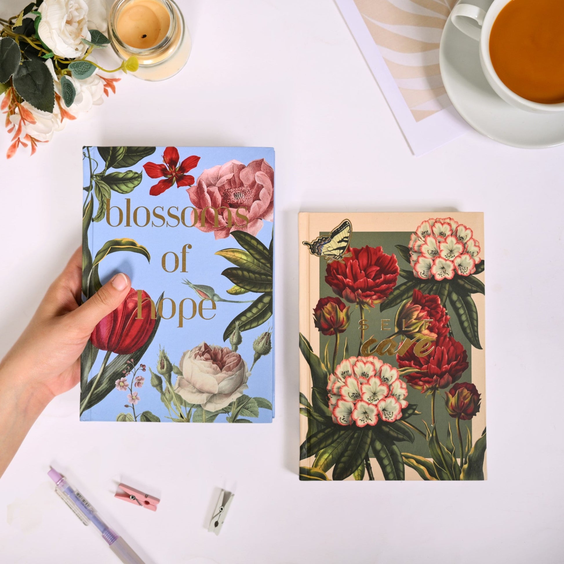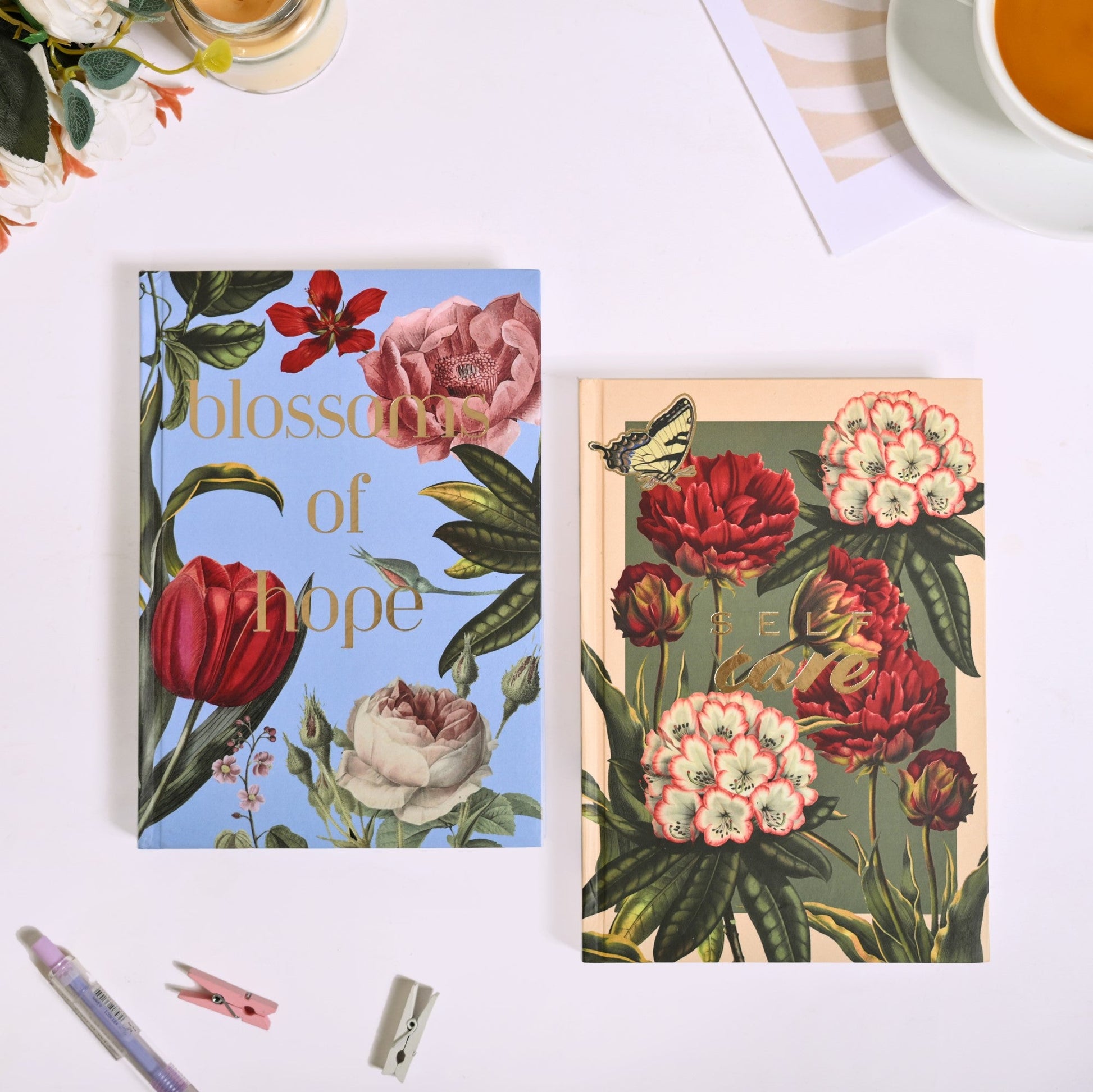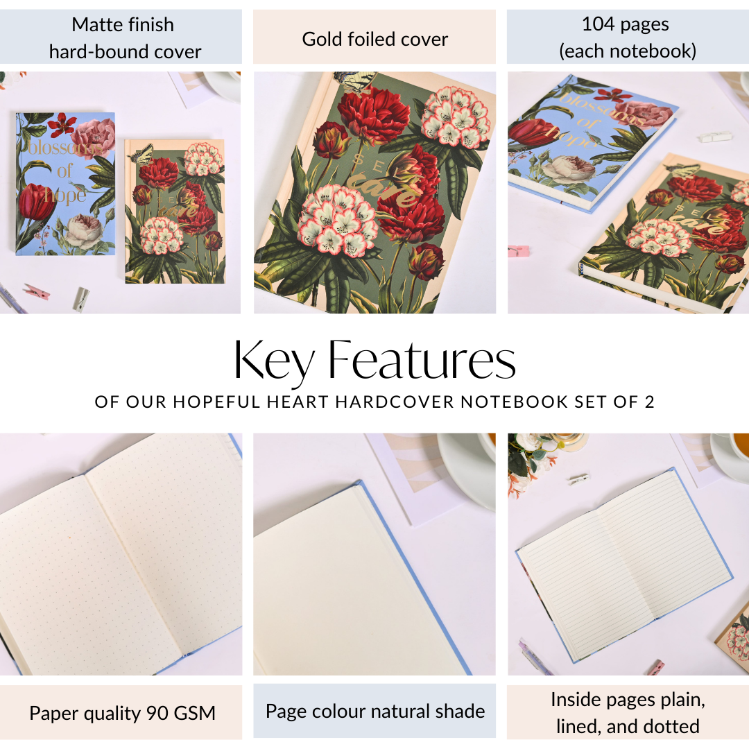 Prioritise your well-being with the "self-care" gold foiled notebook, designed to help you plan moments of relaxation, mindfulness, and growth. Paired with the "blossoms of hope" journal, this set offers a gentle reminder that every new day holds the potential for positive change. Together, they make the perfect matte and hardbound duo to encourage self-love and hope in every moment, keeping your heart and mind aligned with your goals and aspirations. Write your dreams, reflect, and watch your personal journey bloom with our notebook set.