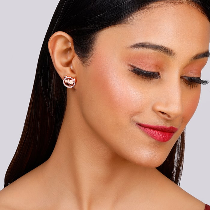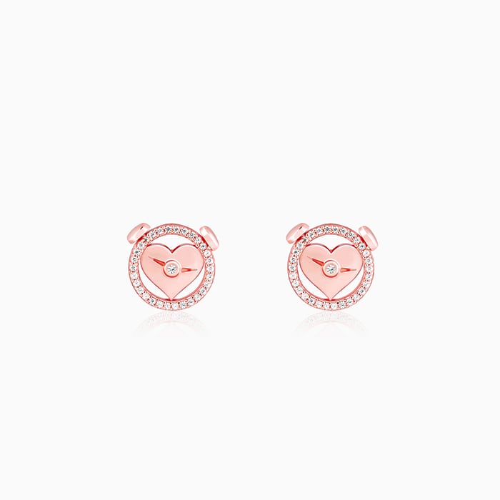 The Rose Gold studs have a zircon-studded circular motif with a heart in it.