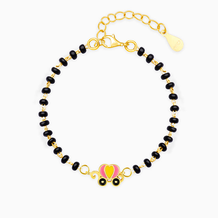 The Golden Bracelet has a classic black bead design with a spring ring closure and a centrepiece that resembles a pumpkin carriage.