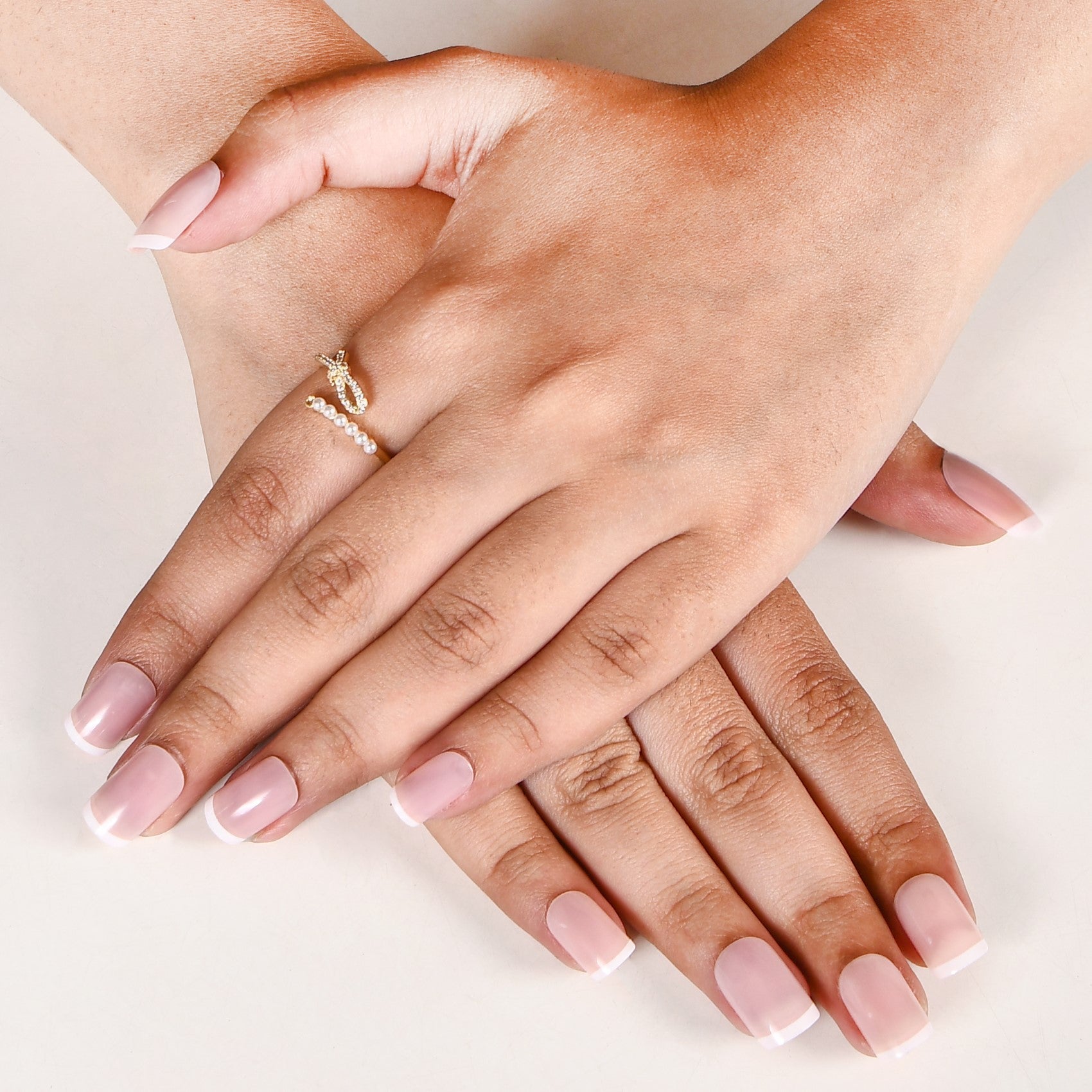 Grace meets glamour in this exquisite gold-toned bypass ring. One end elegantly curves into a stone-studded infinity symbol, representing endless beauty, while the other end is lined with a delicate row of lustrous pearls. The contrast of shimmering stones and soft pearls creates a striking balance, making this ring a statement piece that adds a touch of charm to any look.