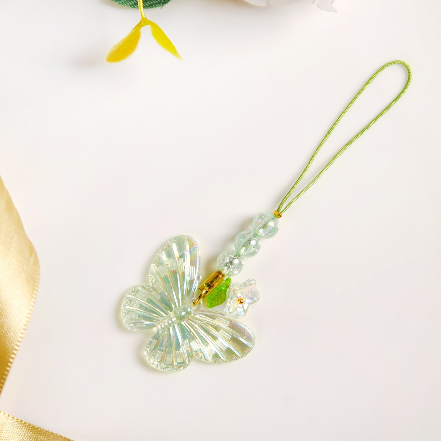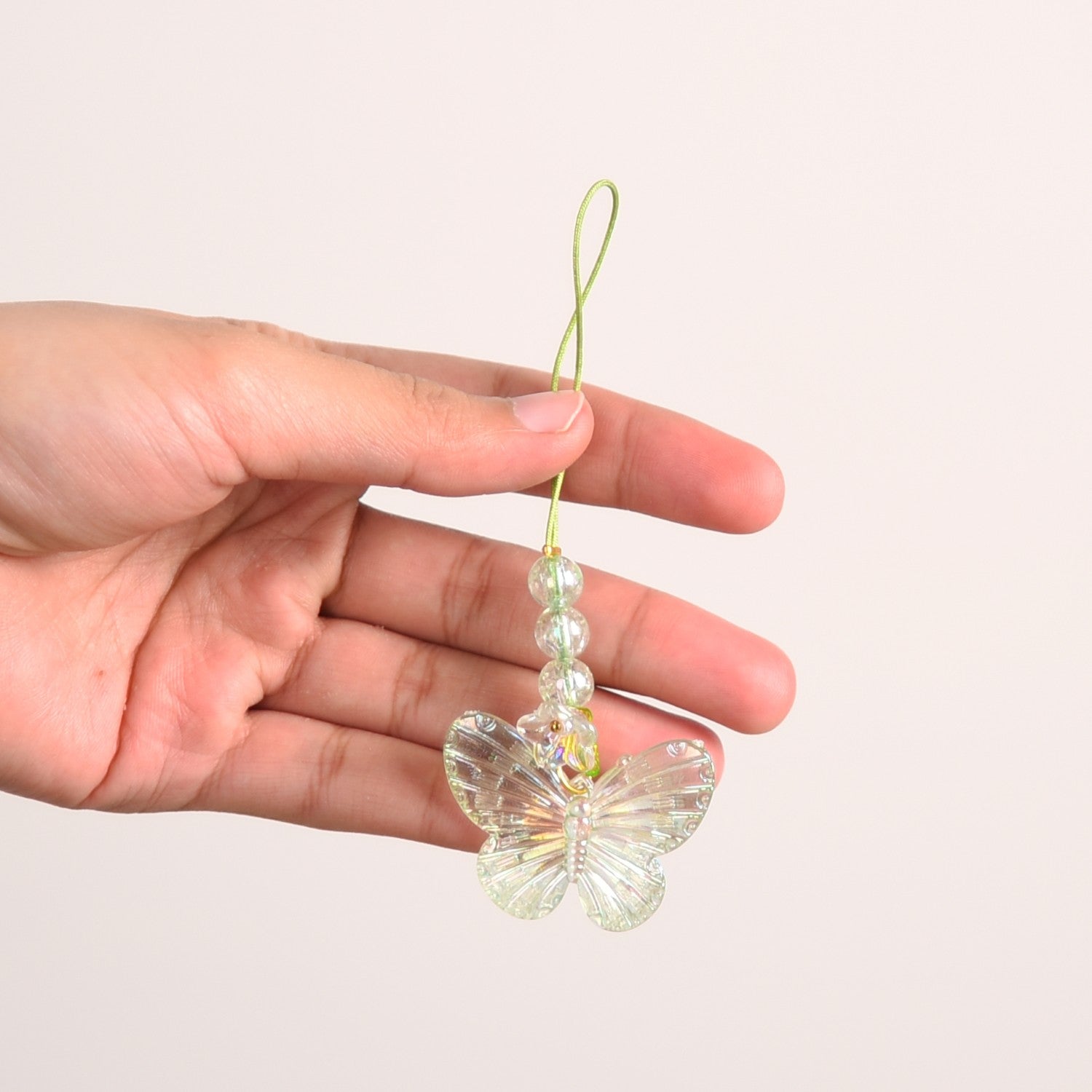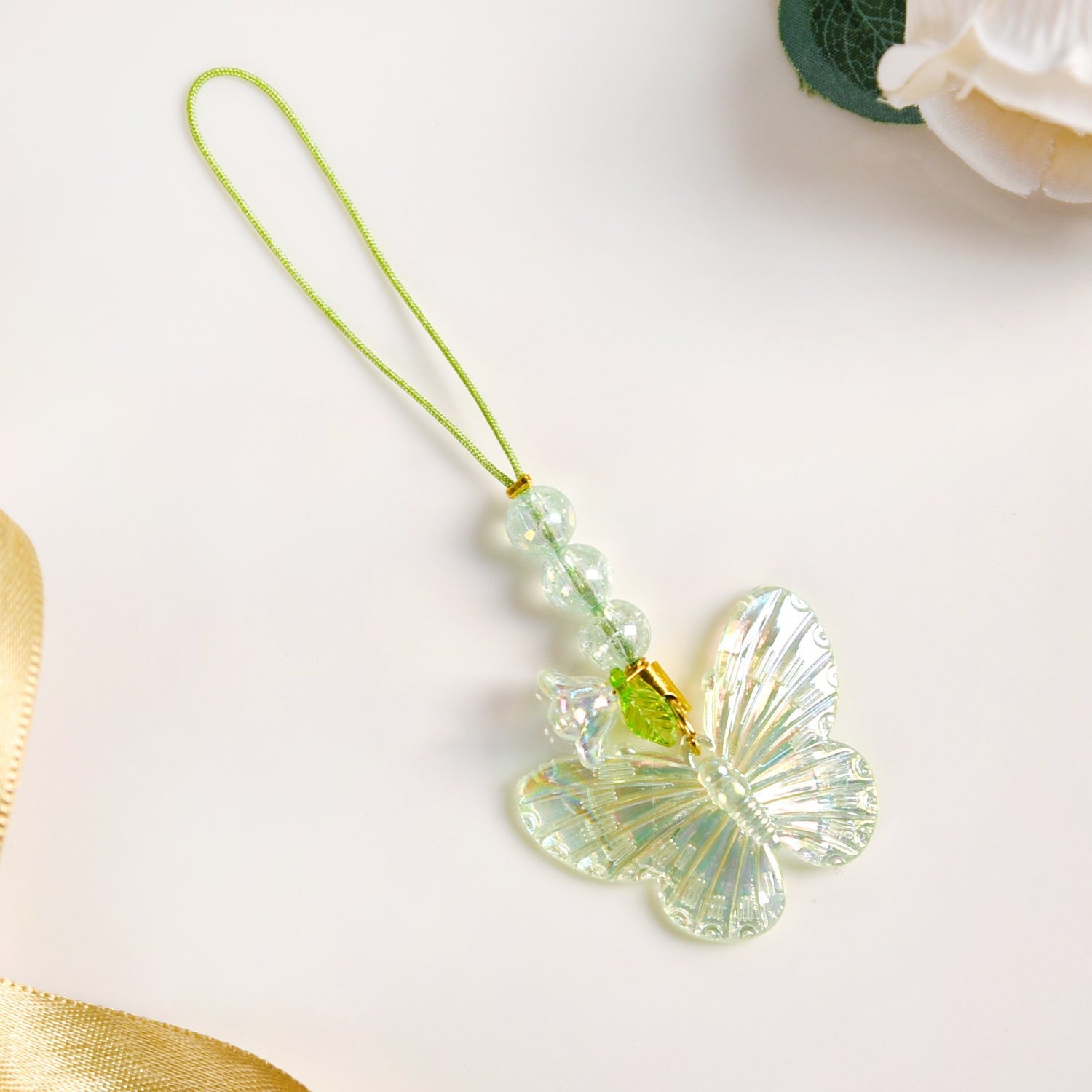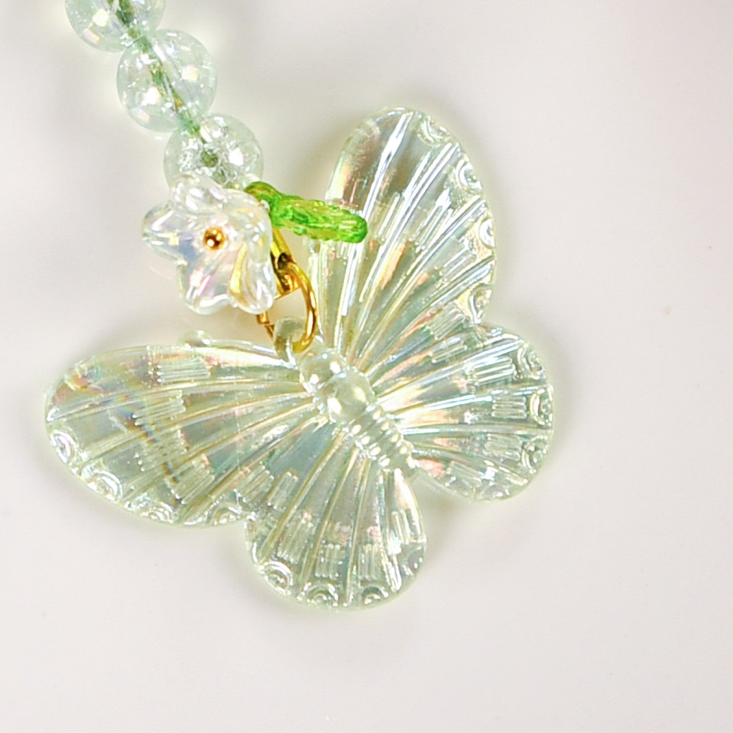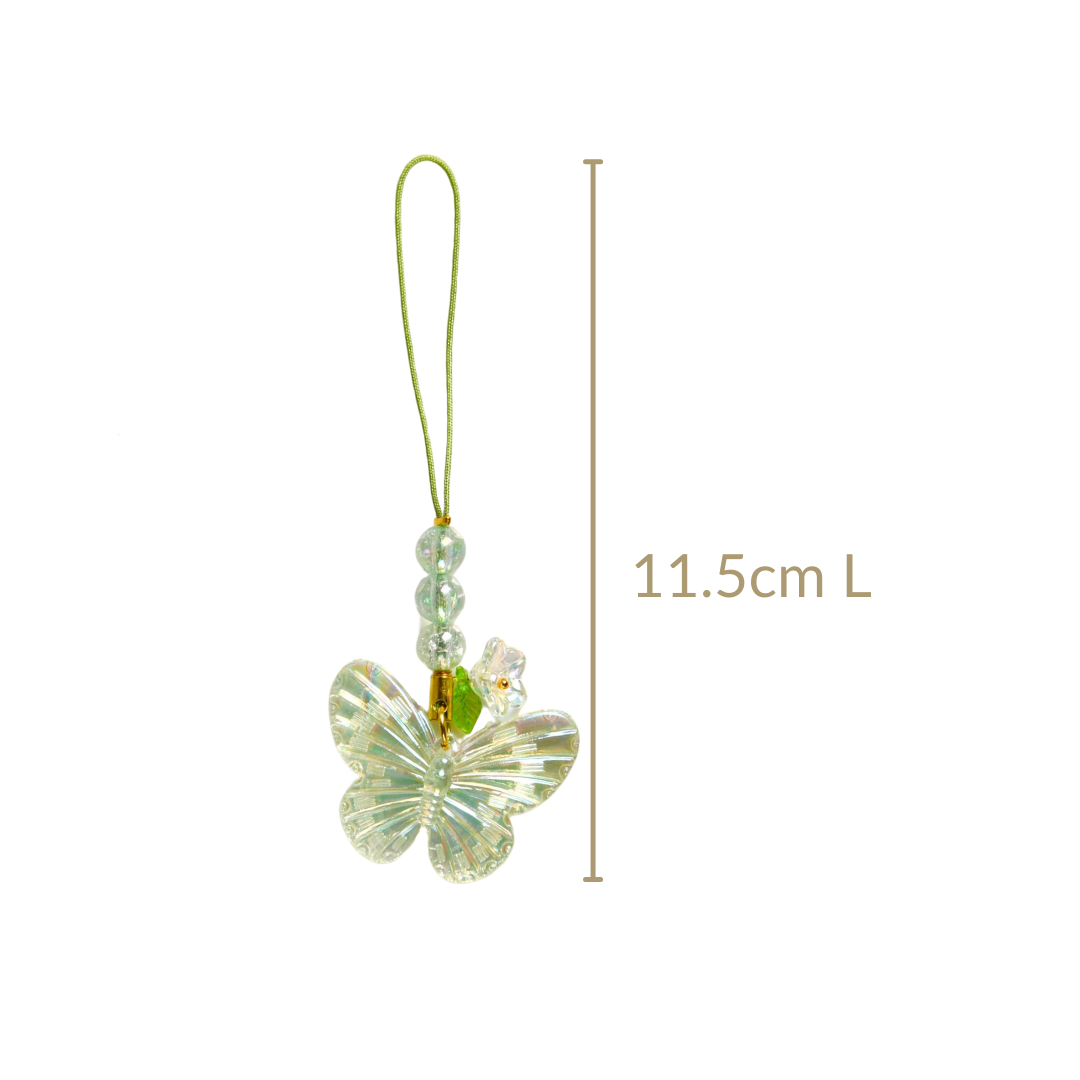Add a touch of whimsy to your phone with this charming phone accessory. Crafted with delicate iridescent translucent green beads, this phone charm is designed to bring a burst of colour and elegance to your device. The loop ensures easy attachment, while the sweet flower charm, accompanied by a vibrant green leaf, and the shimmering butterfly add a playful yet refined touch. Made from durable PVC, this phone charm blends style and functionality, offering a cheerful way to personalize your phone. Perfect for those who love little details, this accessory will make your phone stand out in the most delightful way.