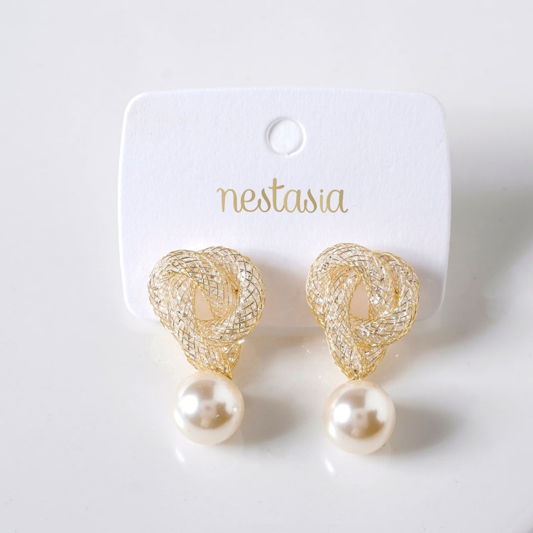 A tangible creation of nature’s beauty and timeless elegance, these drop earrings are a true statement of grace. At the behest of the sea, they draw inspiration from the rhythmic dance of ocean waves and the gentle glow of seashells bathed in sunlight. The earrings feature a twisted mesh loop in gold that glistens with iridescent tones, while a single faux pearl gracefully drops below, embodying the calm and wonder of the ocean. A perfect blend of sophistication and whimsy, they add a touch of oceanic magic to any ensemble.