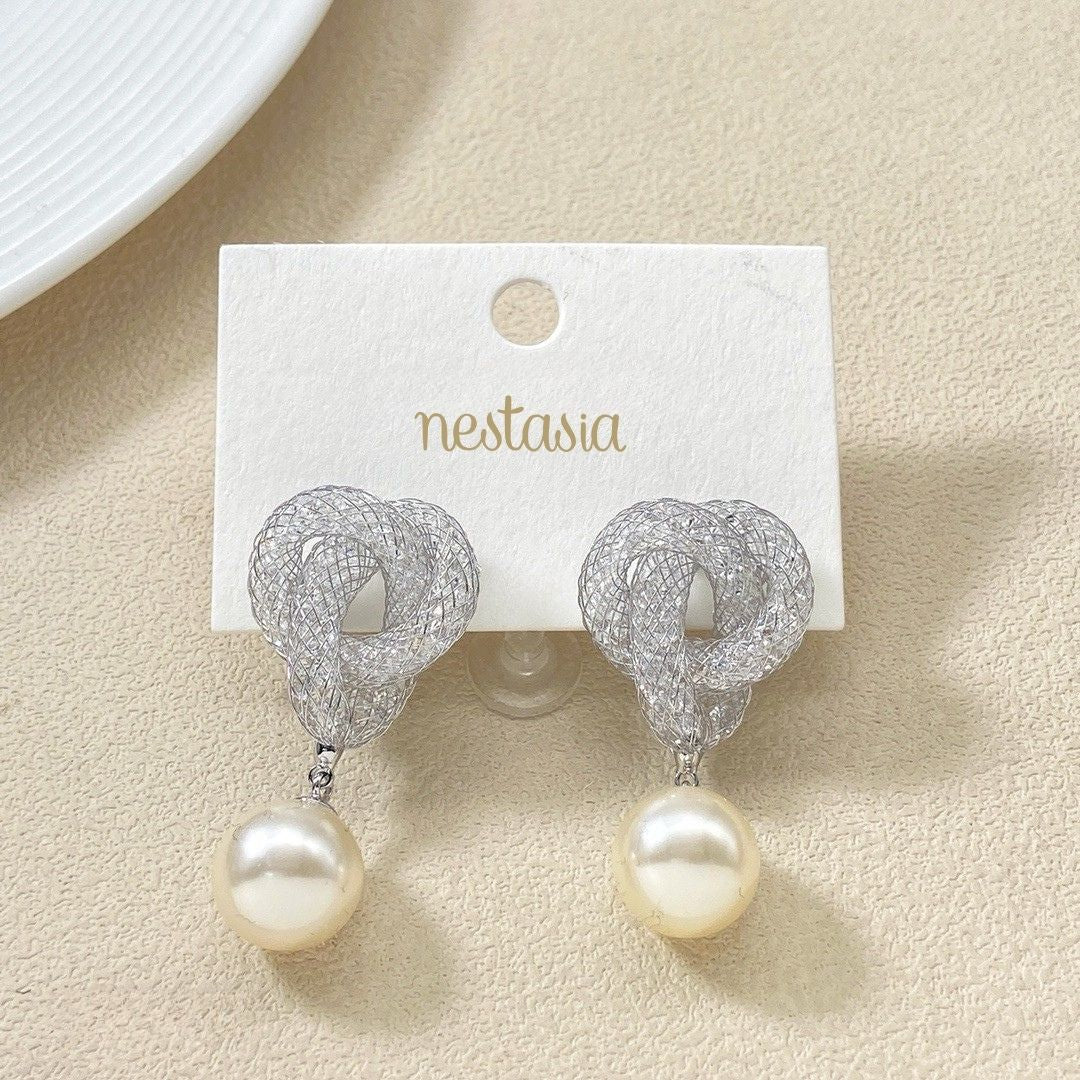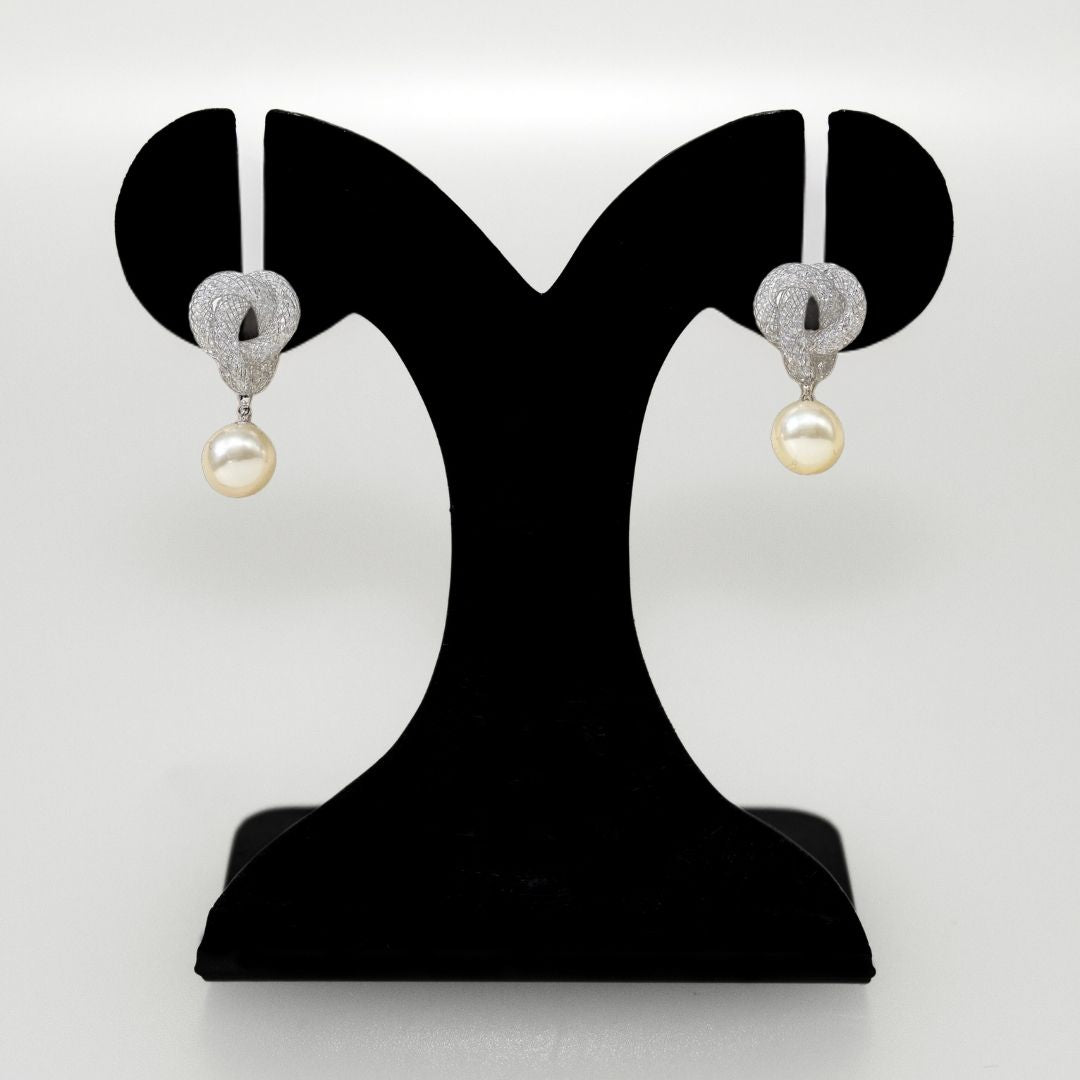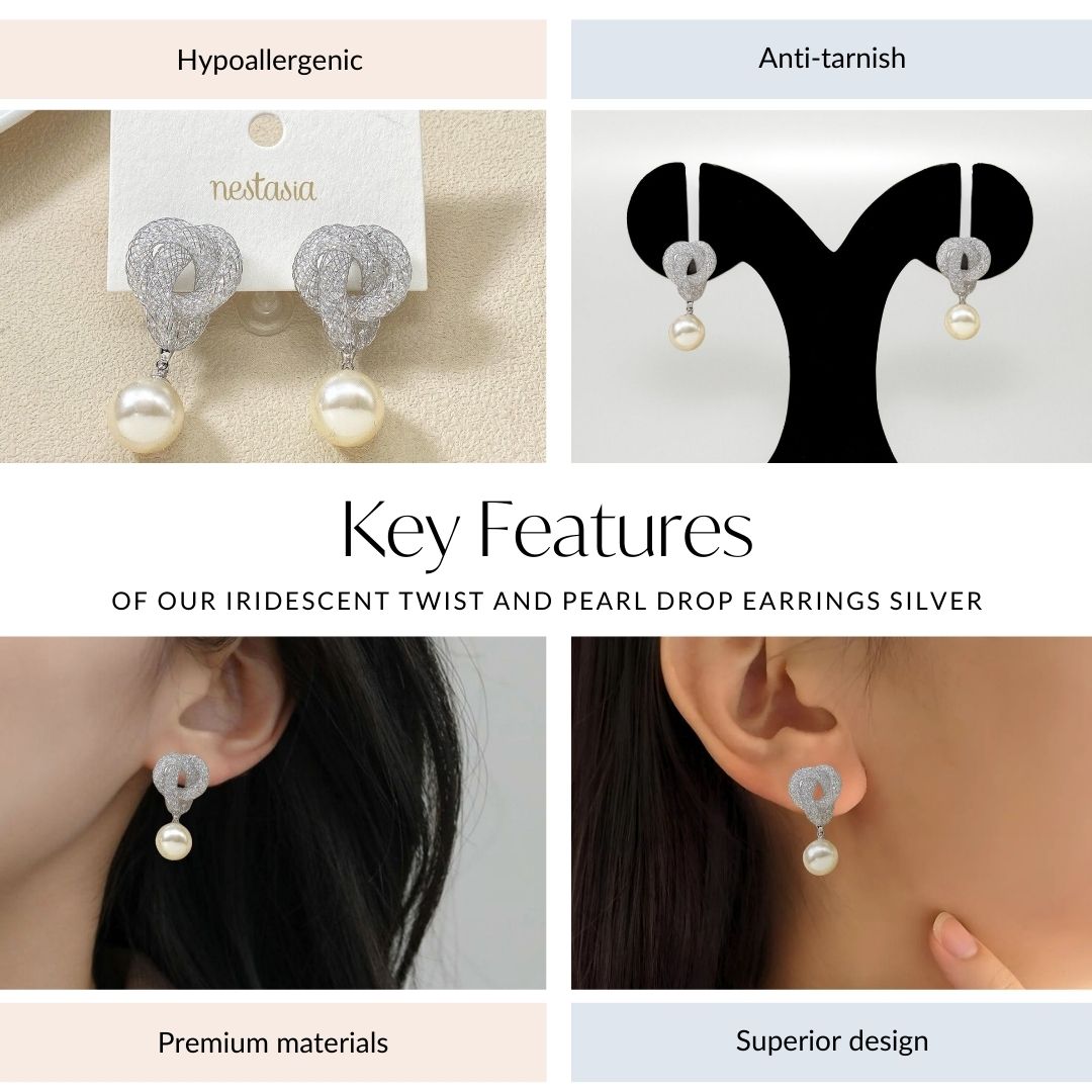 A striking blend of modern elegance and classic charm, this drop earring showcases silver PVC with an iridescent finish, twisted together to form a dynamic, flowing design with stones placed in between. Complementing the sleek upper structure is a lustrous pearl drop that makes this earring simply irresistible.