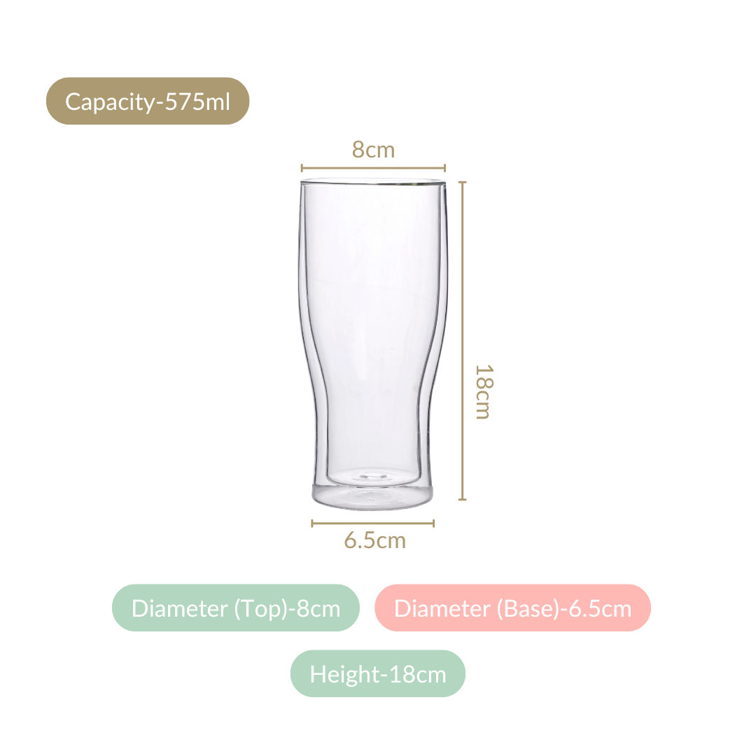 Design: Hand-blown borosilicate glass offers a unique, artisanal touch to each glassware, while the double-wall construction ensures optimal temperature retention. The crystal-clear transparency showcases your drink beautifully, enhancing the visual appeal of every pour. The narrow base and wide mouth design make these drinking glasses perfect for enjoying a hearty stout, a crisp lager, a hoppy IPA, or a refreshing pale ale.