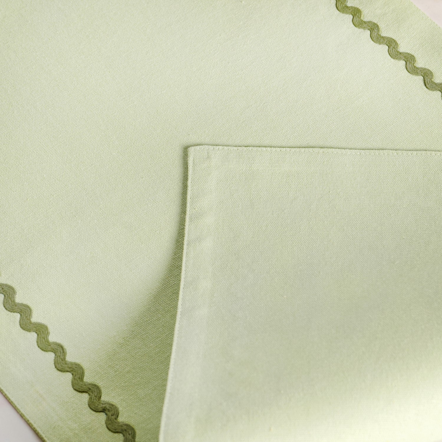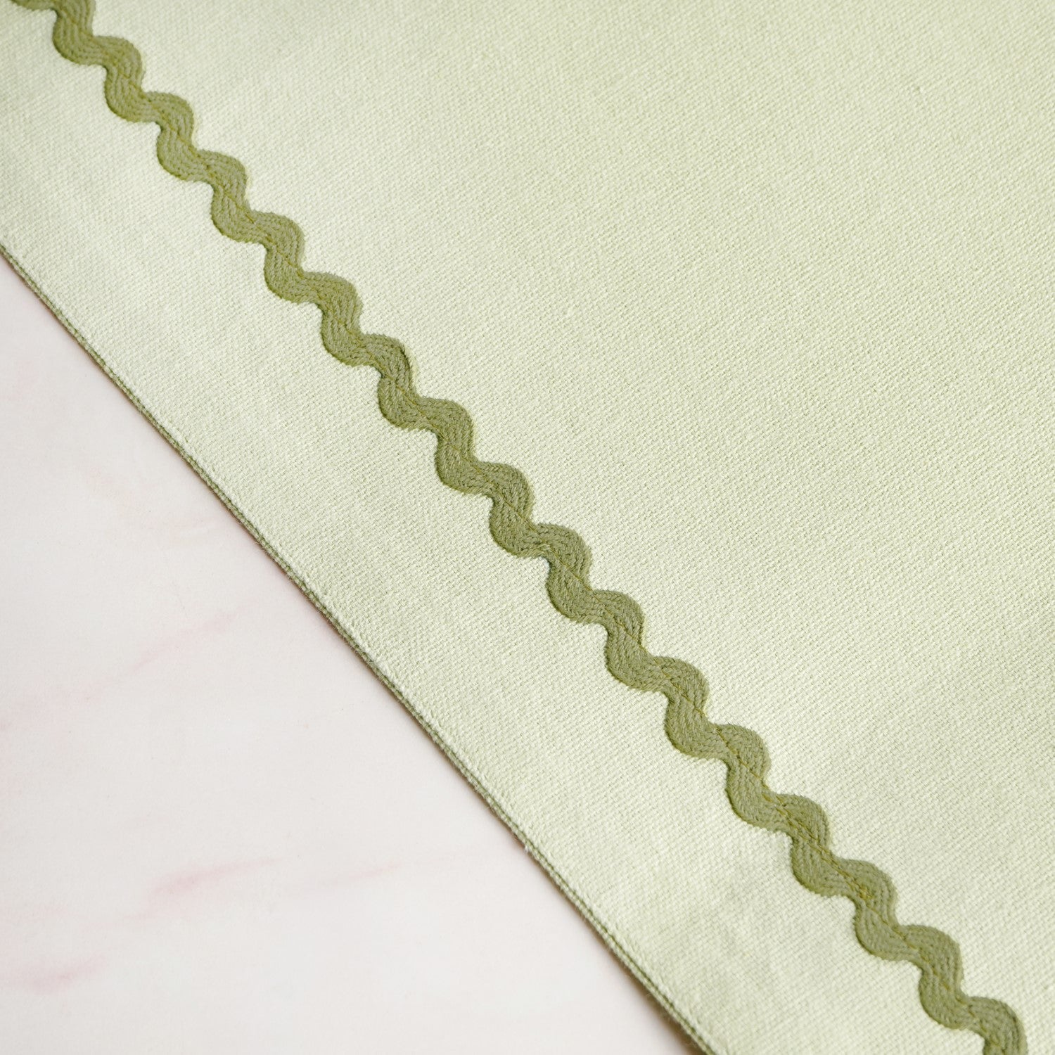 Design: The design features a fresh lime green base beautifully bordered with a delicate sage-toned wave trim. This eye-catching embroidery runs gracefully along the length of the runner, creating a soft scalloped edge that adds a subtle decorative touch and enhances its minimalist style. Made from pure cotton, the fabric may shrink slightly after washing (about 5 to 6%), but a gentle press with a warm iron helps it return to its original shape and drape effortlessly.