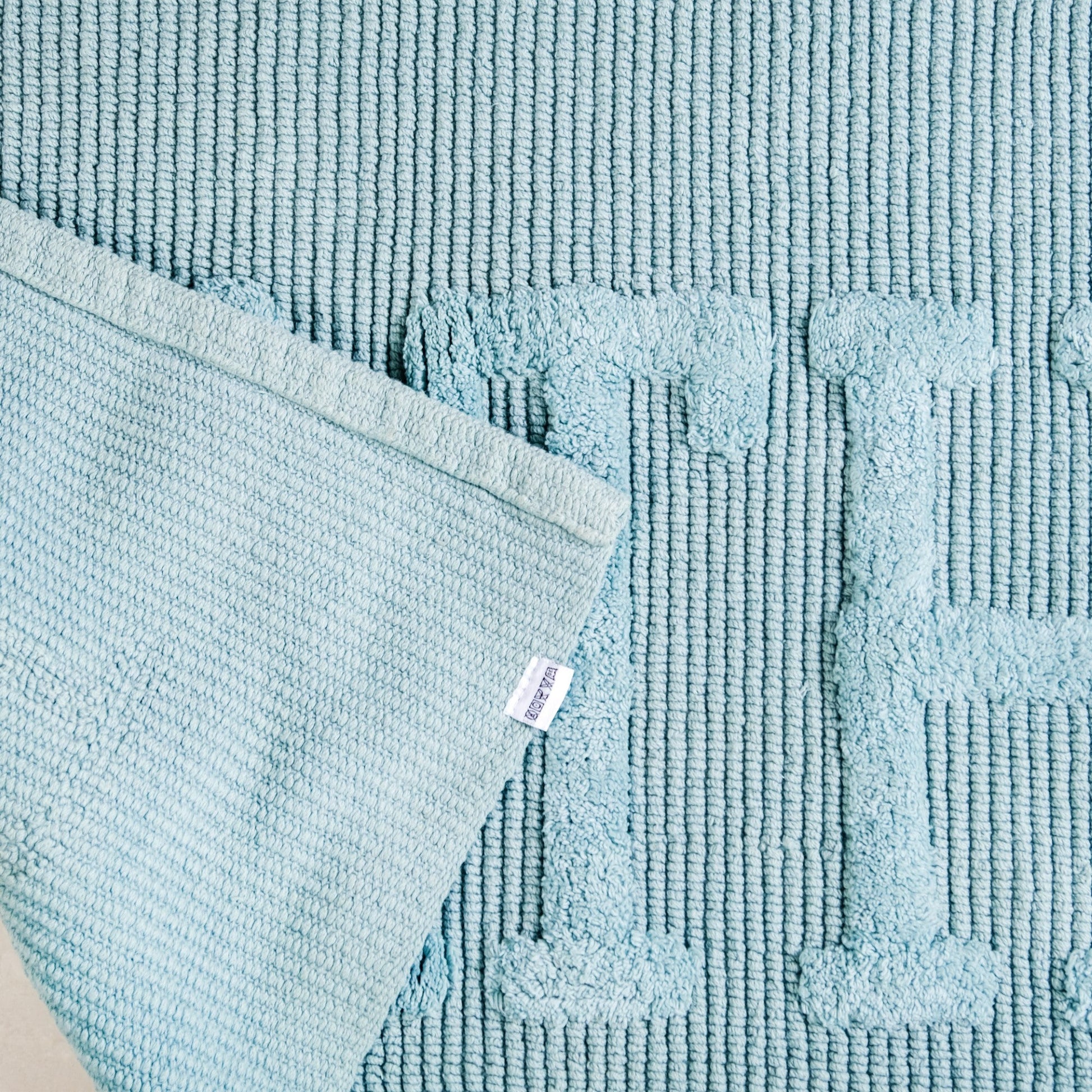 Design: Handwoven with care, this rectangular bath mat is adorned in a cool ivory blue shade, featuring a plush, tufted area that spells out "BATH."