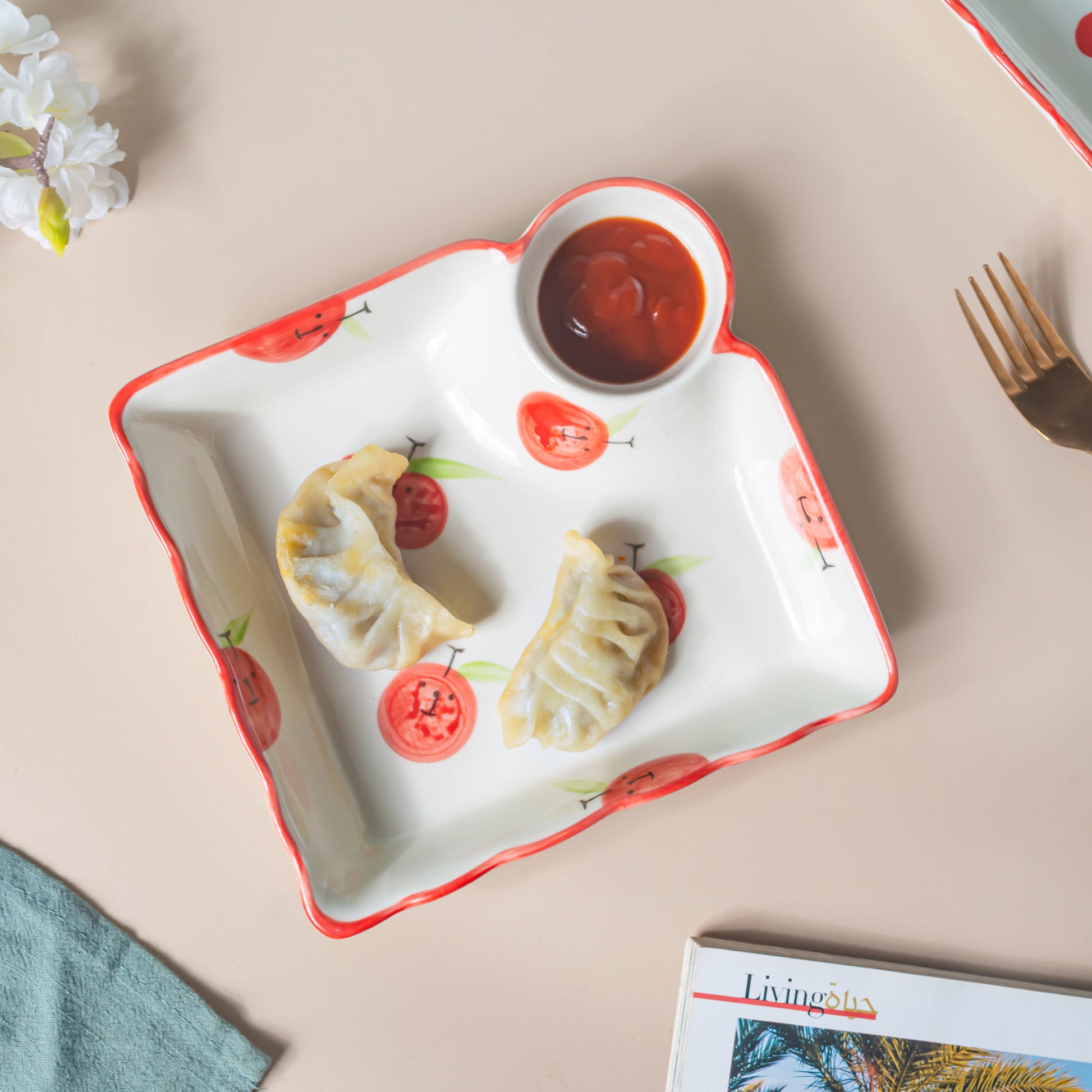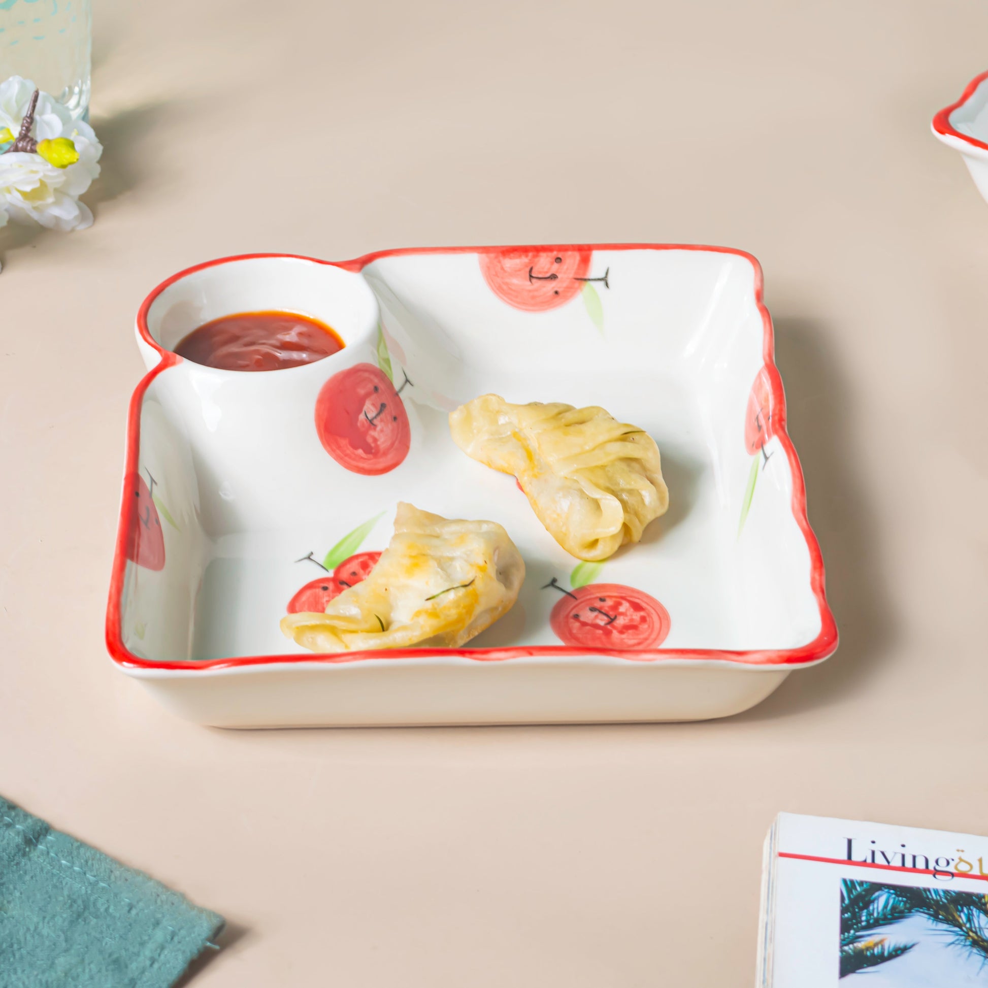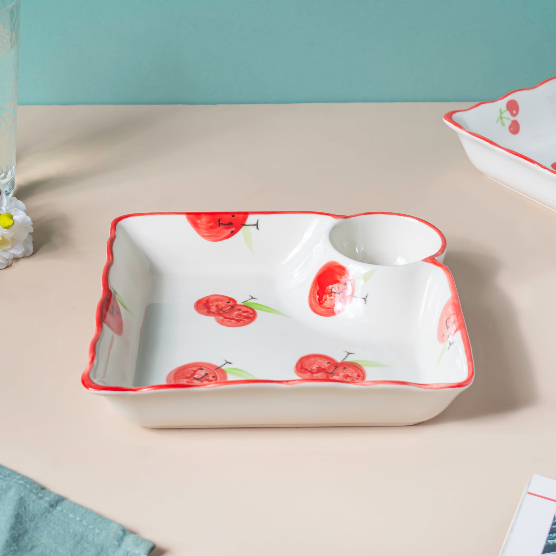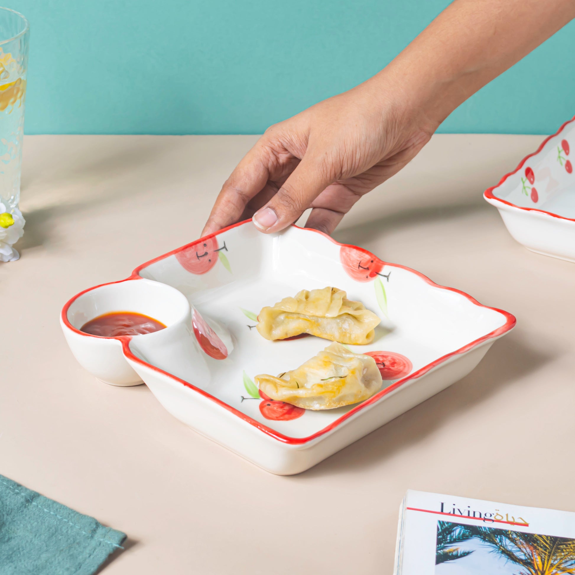 The square-shaped ceramic sectioned plate, embossed with cranberries and a red-colored wavy rim is a fruitful way to snack. The fine gloss of the white plate with cranberry punch makes it a colorful addition to a ceramic cabinet. The sectioned snack plate carries an attached dip section and is apt for serving french fries with sauce or mayonnaise, dim sums with sweet and sour sauce, fish and chips with tartare sauce, and so on.