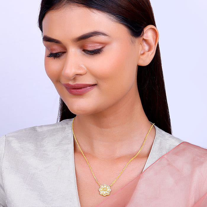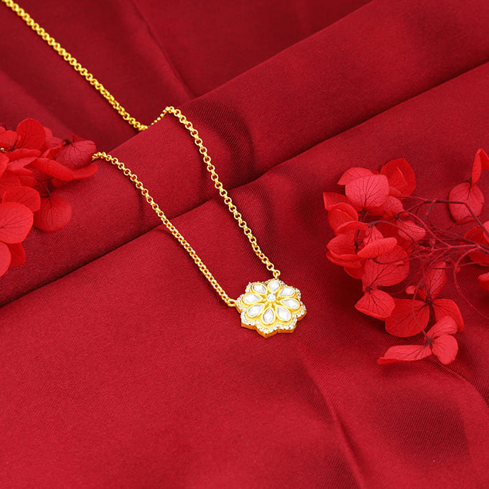 This golden necklace has a flower motif with rose-cut glass stones and a zircon placed in the centre. Presenting Trendy Freak's chic #VivaahDaSwag Collection for an unforgettable wedding.