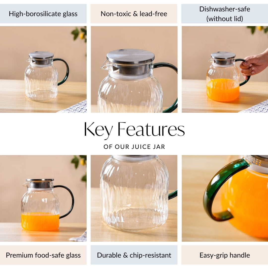 Design: Made from high-quality borosilicate glass, this jar has a contemporary touch thanks to its wavy, ribbed texture. It has a steel lid with a silicone band and an integrated strainer attached to the lid. It also has a strong handle with a vivid splash of green that makes it ideal for any setting.