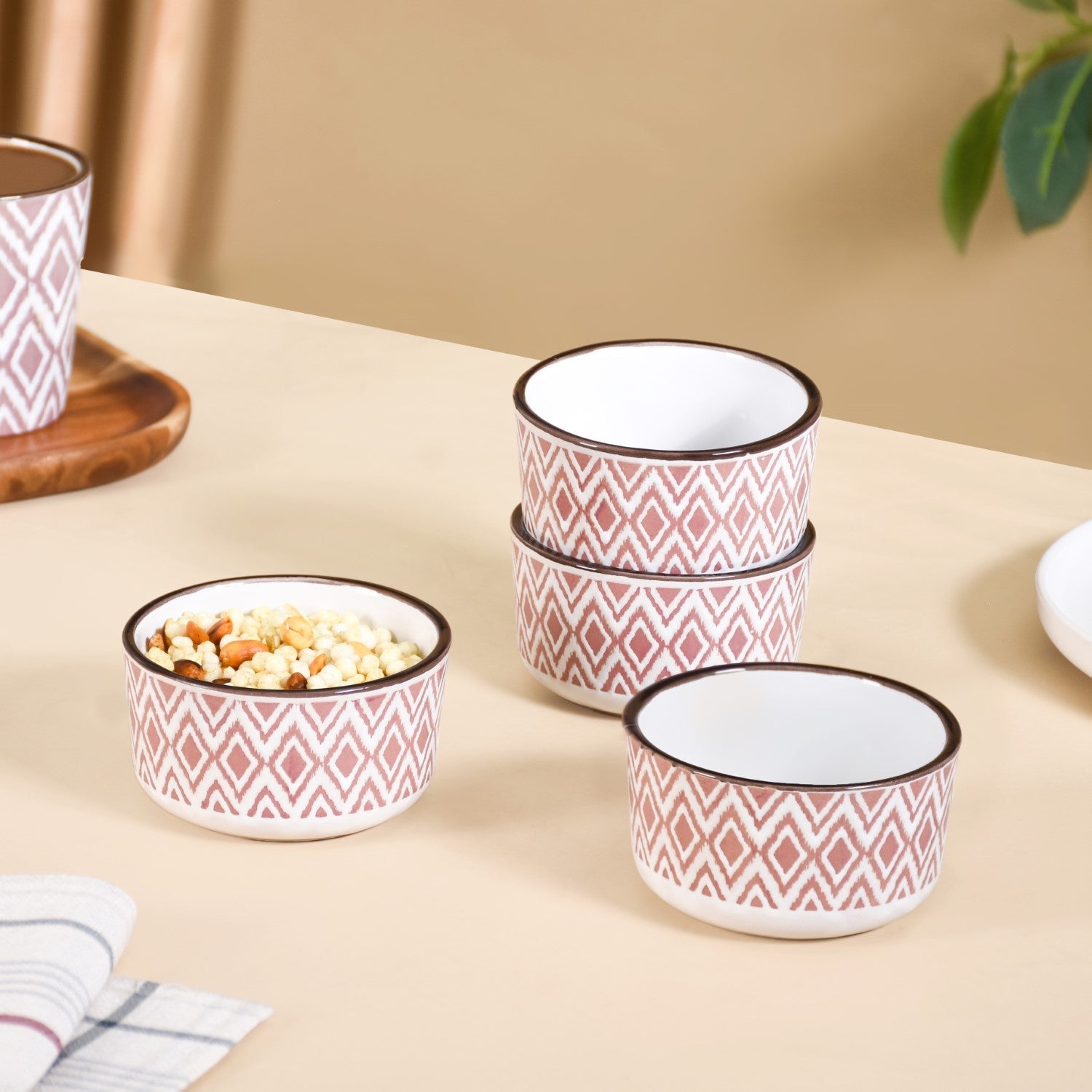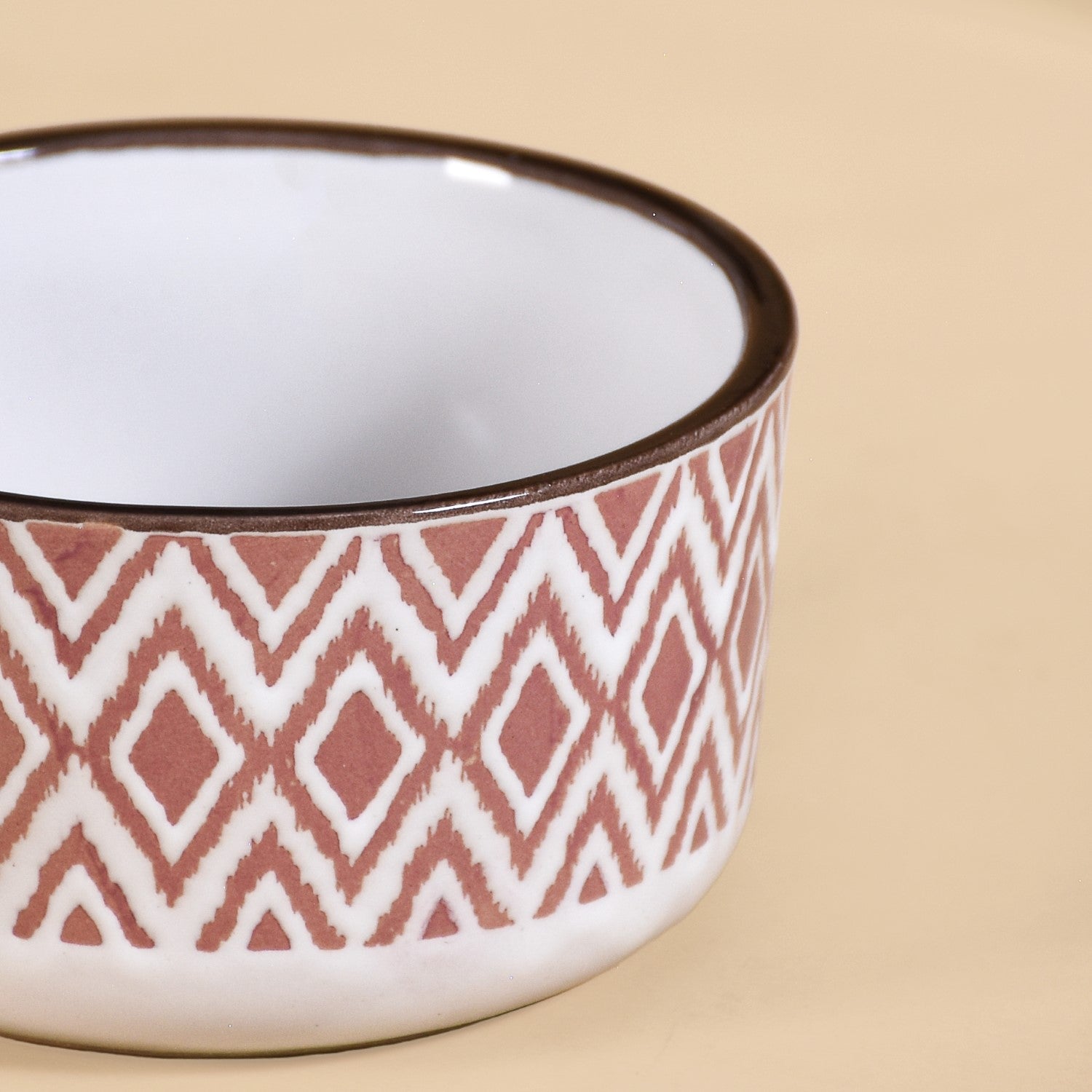 Design: Our ceramic snack bowl set is a blend of elegance and whimsy. Designed with a lively alternating diamond pattern in a delicate pink and serene white colour palette, this small bowl set adds a pop of colour to your table setting. The sleek shape not only enhances the design but also makes it easy to handle!