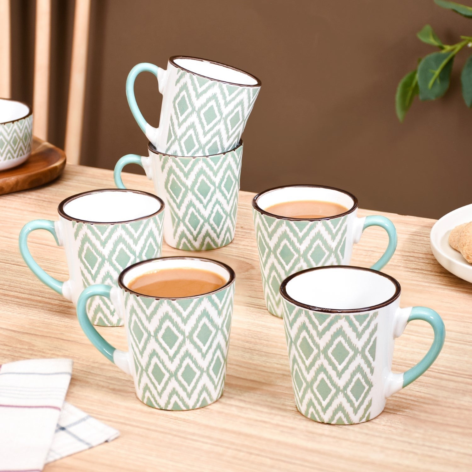 Design: This ceramic tea mug features a delightful diamond pattern in a serene green and white colour palette, creating a refreshing and modern look. The green adds a cool, calming touch, while the clean white diamonds provide a crisp contrast. Thoughtfully designed for both style and comfort, the mug's shape ensures a snug fit in your hand, making every sip feel just right.