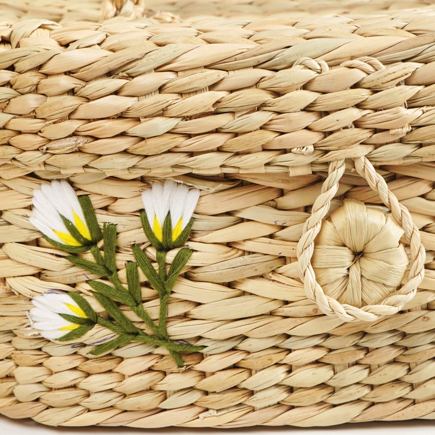 Design: This handwoven storage basket is crafted from organic Kauna grass, giving it a natural, breathable texture. It comes in a rectangular shape with rounded edges, blending structure with softness. A full-cover lid sits snugly on top, paired with a braided carry handle for easy transport. The loop and toggle closure on the front adds both utility and artisanal style. Delicate floral embroidery on the front gives it a charming handmade finish. The natural tones and tactile weave add warmth to any space it’s placed in.