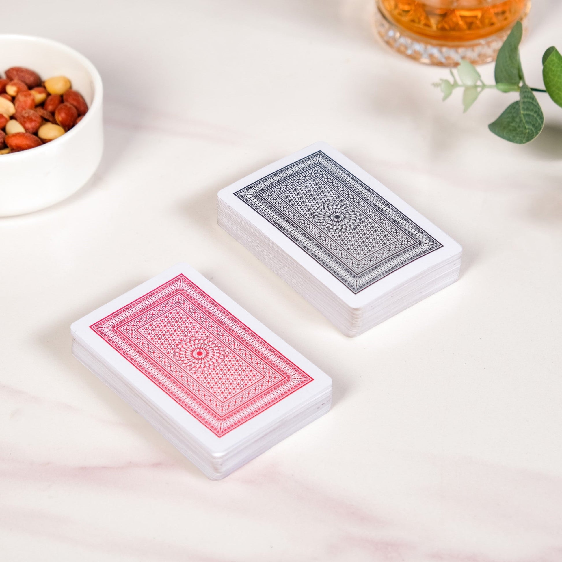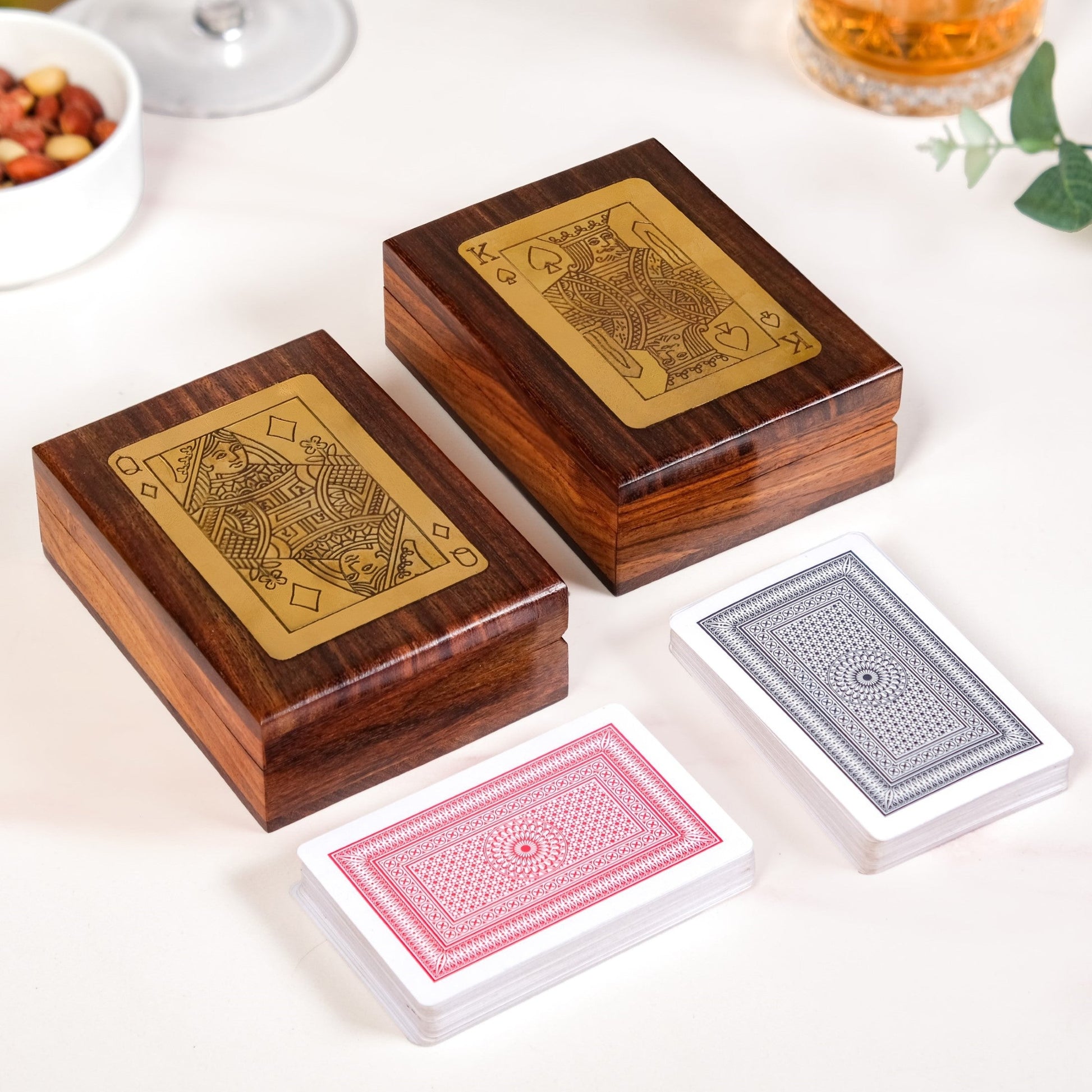 Design: Each box is a work of art, featuring a stunning brass inlay. One box showcases the King, while the other features the Queen, both with intricate detailing and design. The polished Sheesham wood provides a rich, dark finish that beautifully contrasts with the elegant brass. This set comes with one high-quality deck of playing cards, with two different color schemes: red and white, and black and white, allowing for easy separation and organized play.