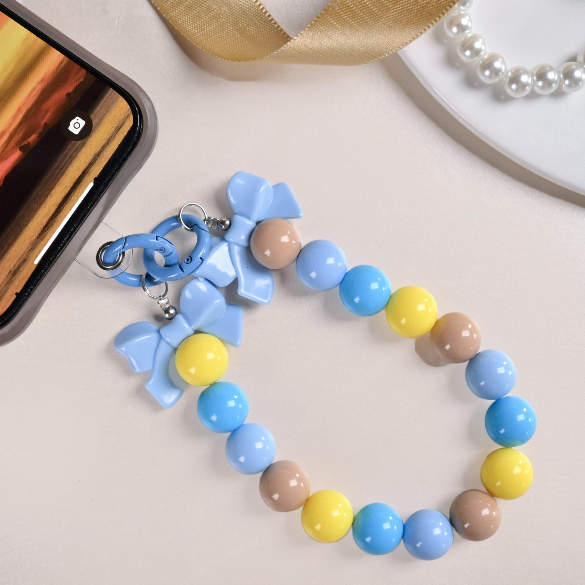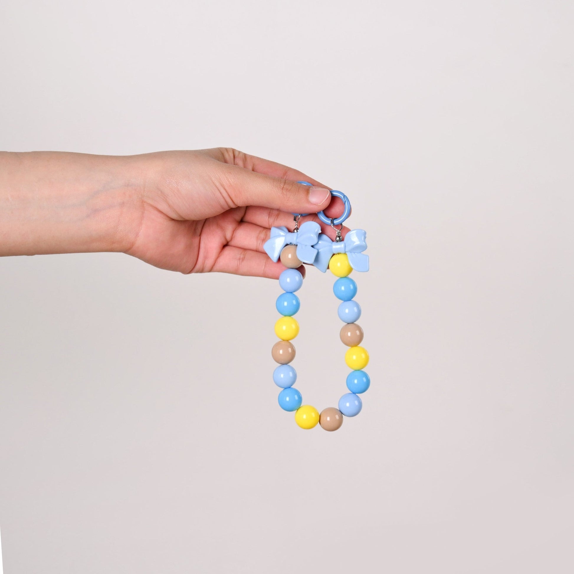If you're looking to add a little extra flair to your essentials, look no further, because this keychain has you covered. Made from the highest quality materials, this keychain features a dual-clasp design, allowing you to use it as both a keychain and bag charm. The playful pale blue bows on either end add a soft, feminine touch, while the chunky beads in shades of serene blue, vibrant yellow, and earthy brown create a cheerful pop. Whether you're keeping your keys organized or jazzing up your handbag, this keyring is all about versatility, making it a must-have in your accessories collection.