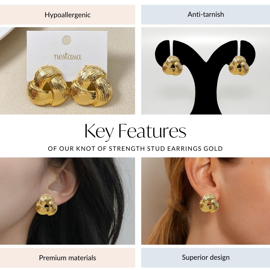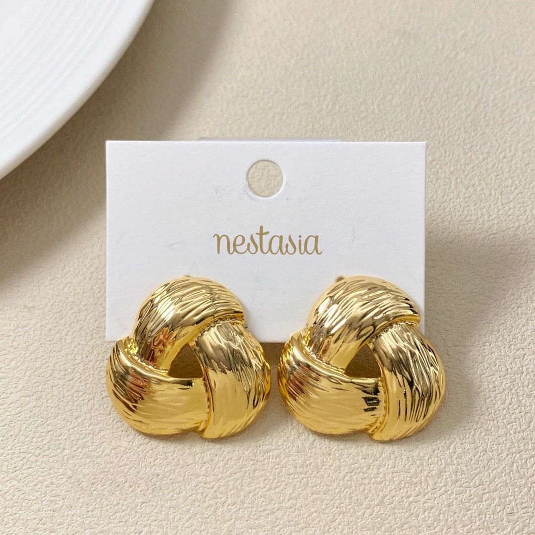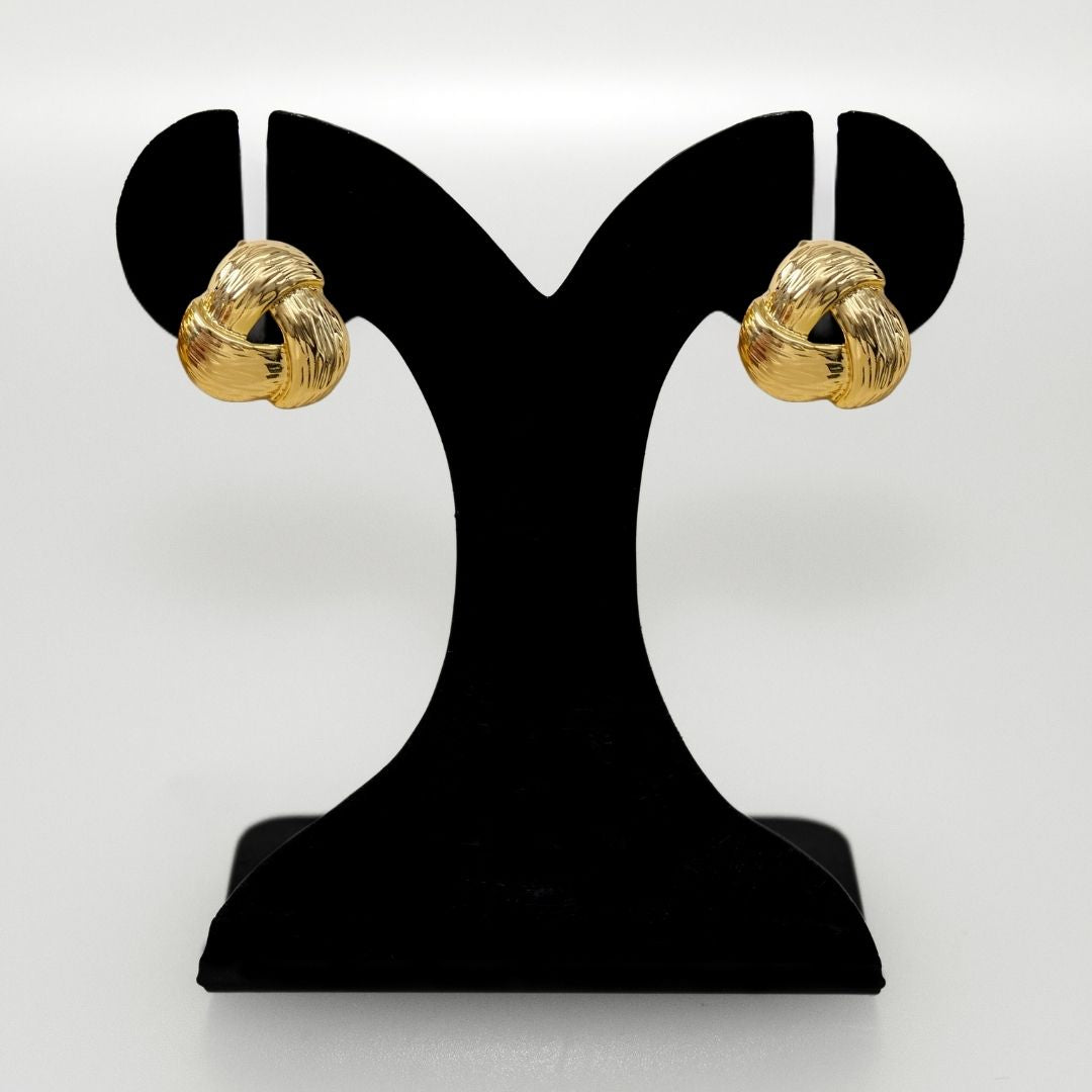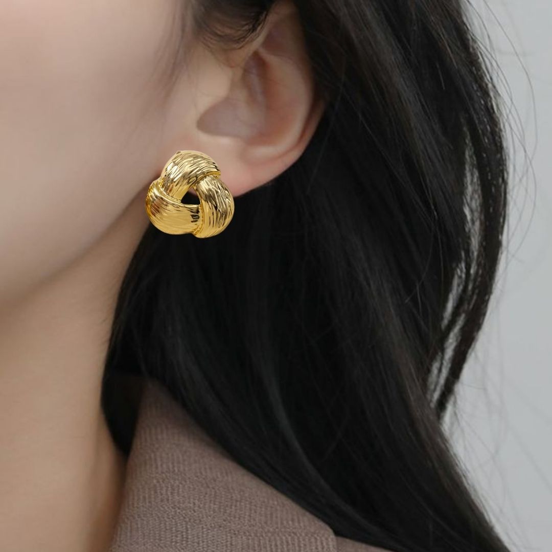 A study of tension and resilience, these statement stud earrings make an unforgettable impression. Drawing inspiration from the enduring beauty of Celtic knotwork, the design symbolizes strength and unity. The rich gold-tone finish, paired with a subtly textured surface, creates a dynamic look that catches the light with every turn. Ideal for those seeking a bold yet elegant accessory, these earrings bring a touch of timeless artistry to any ensemble.